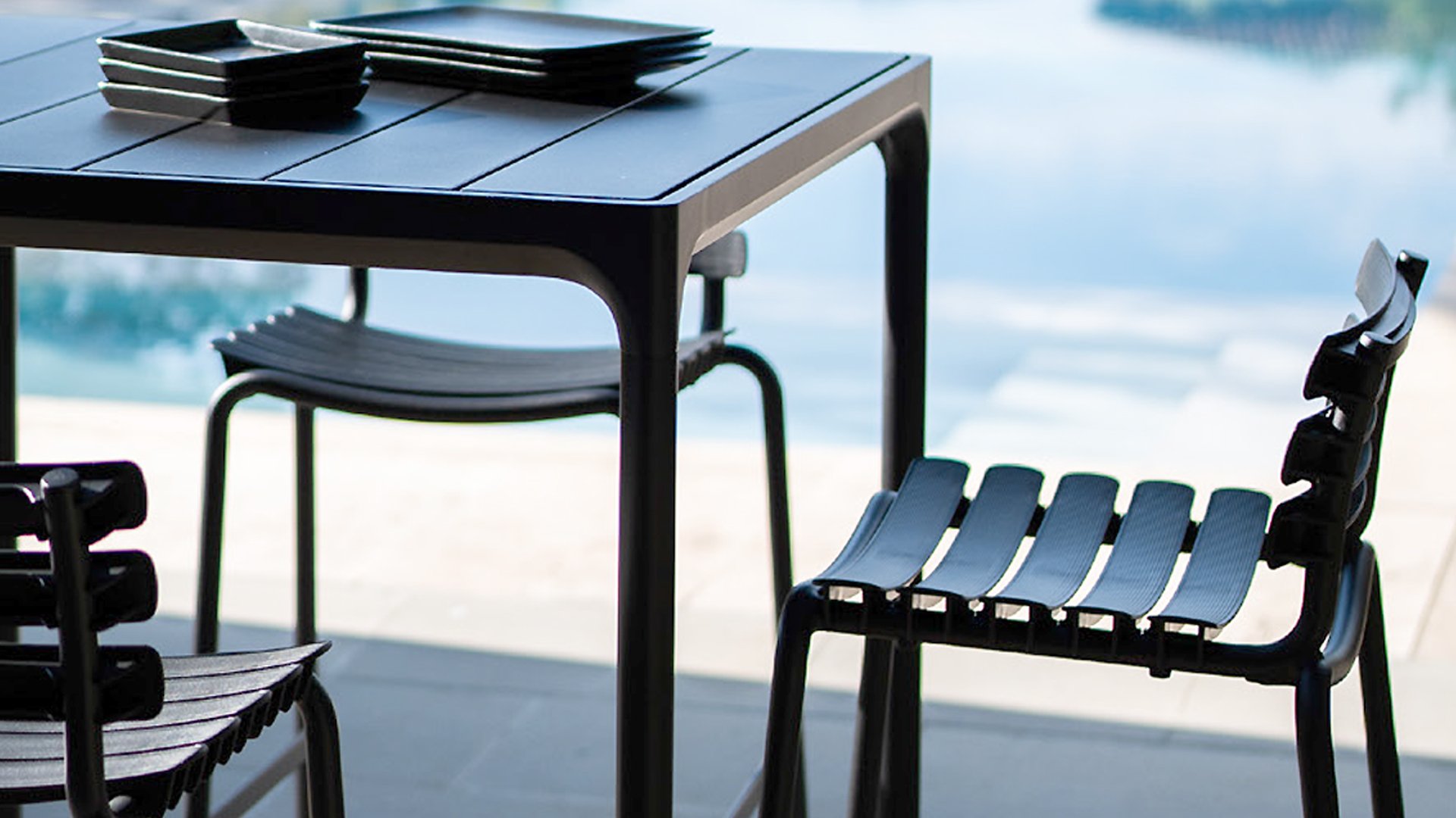 Die HOUE Reclips Serie ist aus recyceltem Kunststoff gefertigt. In Kombination mit dem pulverbeschichteten Aluminiumgestell handelt es sich um einen pflegeleichten Loungesessel. Die ergonomisch geformte Rückenlehne macht den Stuhl sehr komfortabel, auch ohne Kissen. In dieser Serie sind auch ein Barhocker, ein Gartensessel und ein Schaukelstuhl erhältlich.