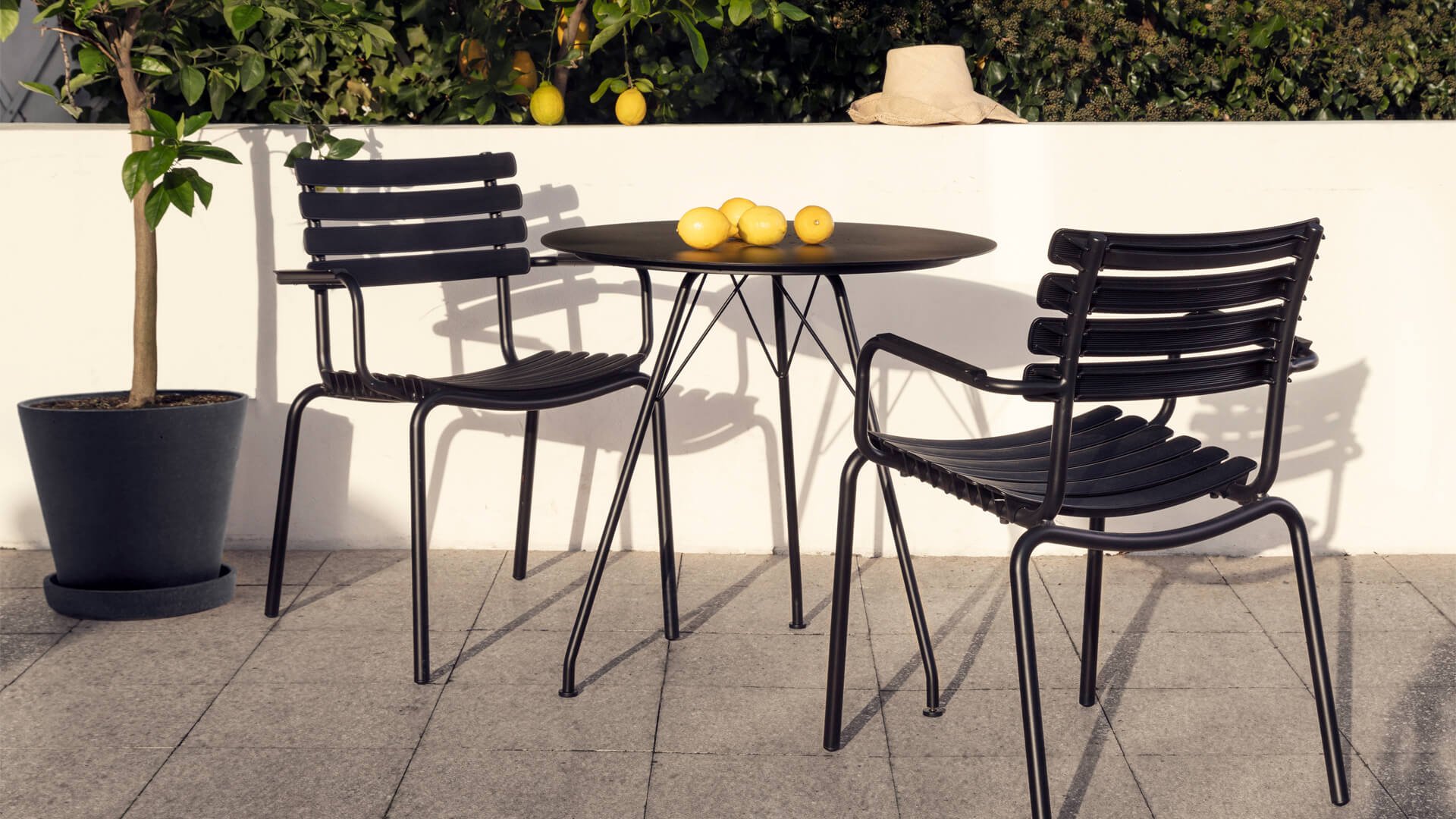 HOUE ReClips Dining collectie: Leichtgewichtiges Design mit minimalistischem Design. Hergestellt aus vollständig recyceltem Kunststoff! Der Gartenstuhl wurde von Henrik Pedersen entworfen, einem dänischen Designer, den wir bereits von dem ikonischen Click! kennen. Erhältlich in 4 Farben, mit Bambus- oder Aluminium-Armlehne.