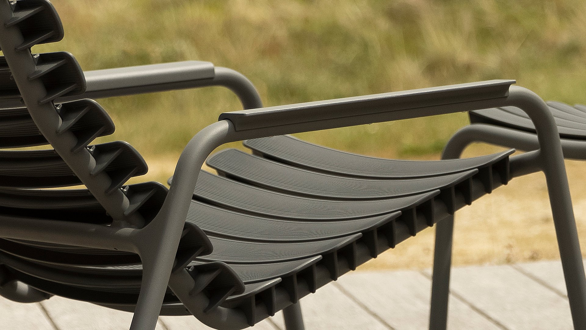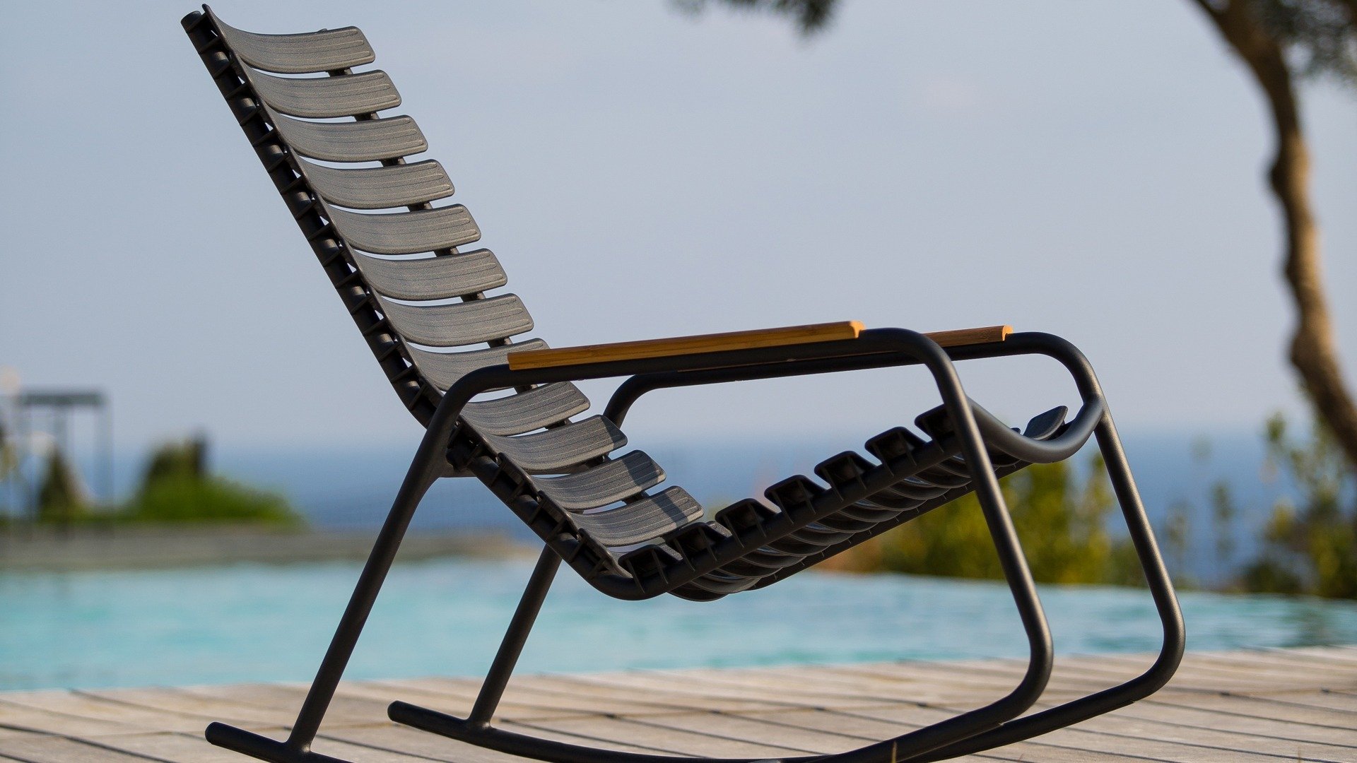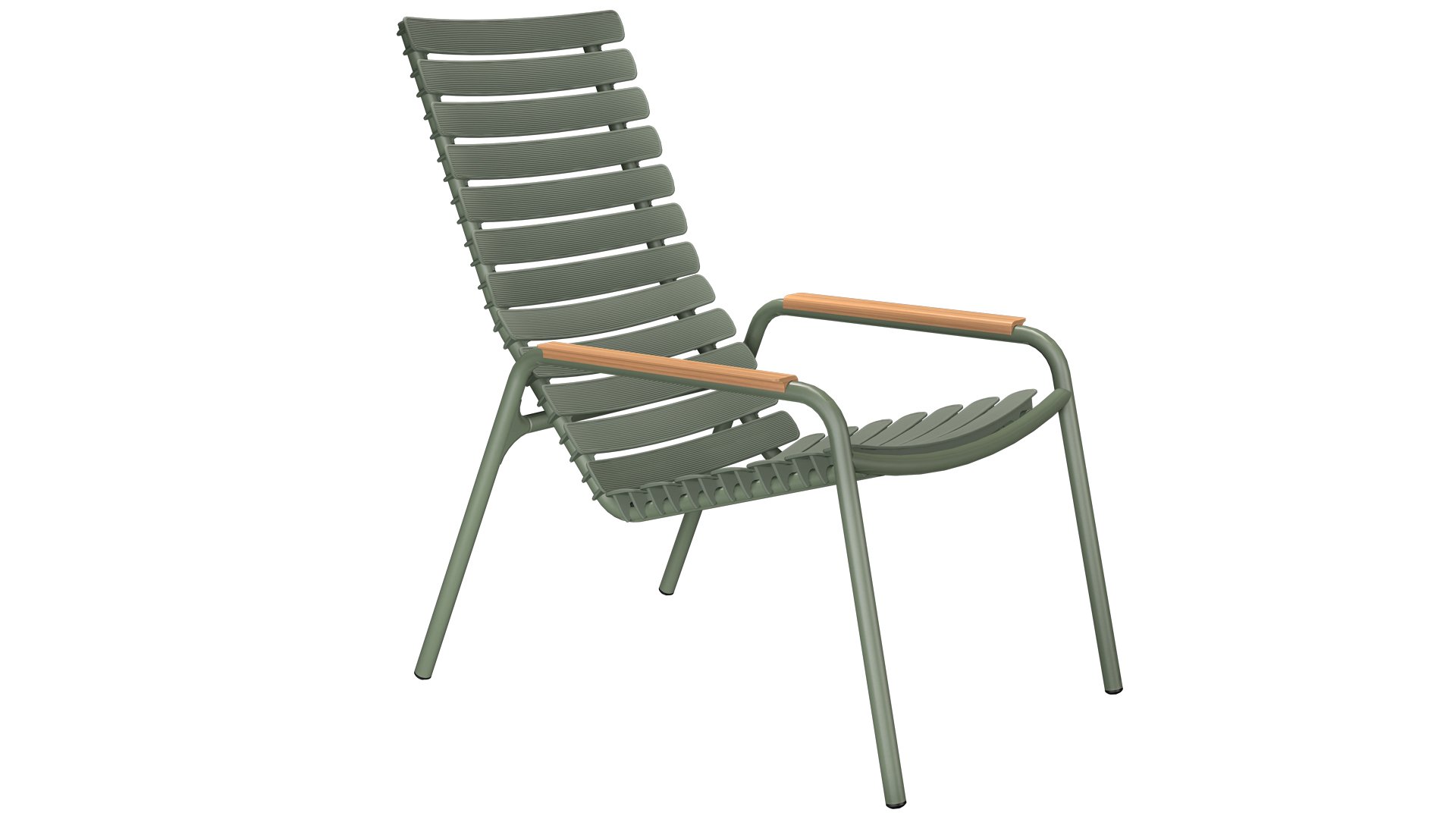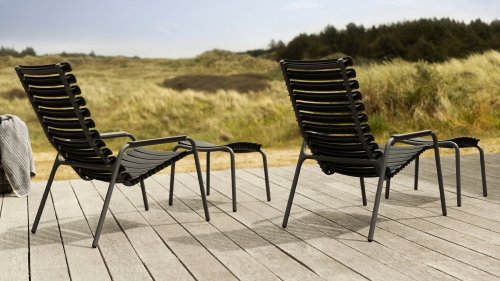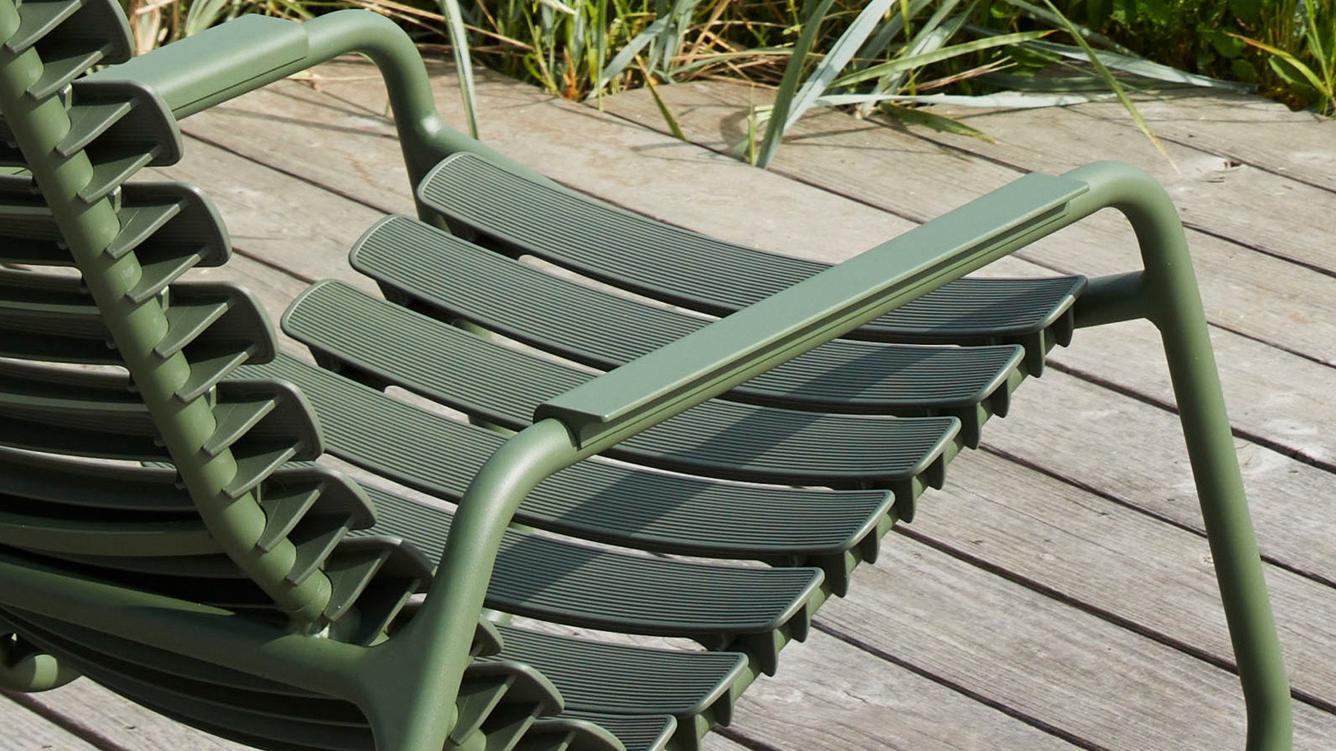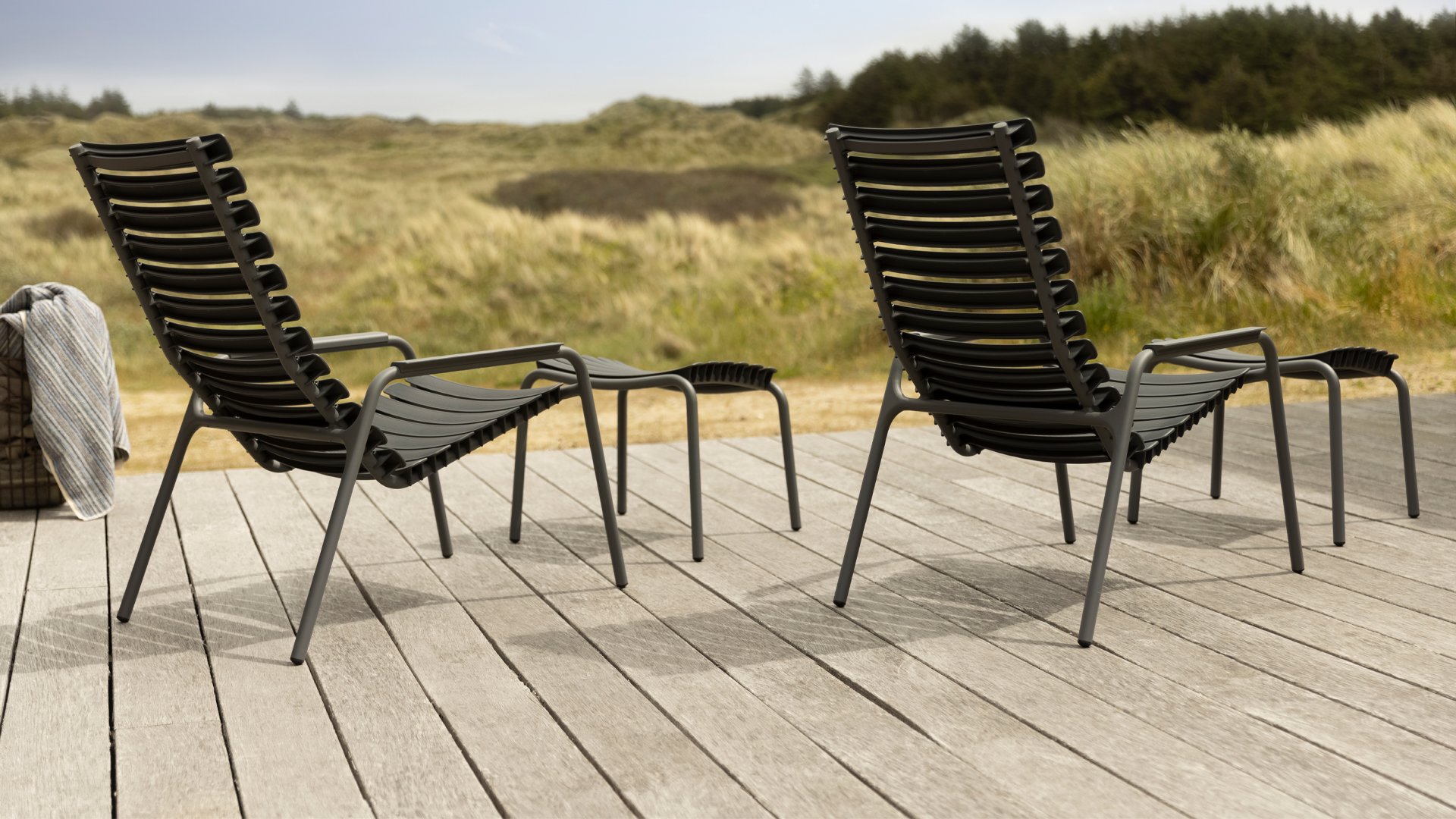 Die ReClips Lounge-Kollektion von HOUE besteht aus clever gestalteten Kunststofflatten, die mit Pulverbeschichtung auf einen Aluminiumrahmen geklipst sind. Die Komponenten der großen Lamellen wurden sorgfältig zusammengebaut, um genau die richtige Festigkeit und Elastizität zu gewährleisten. Das Aluminium in Kombination mit dem UV-geschützten Kunststoff reduziert die Wartung auf ein Minimum. THE HOUE ReClips wurde mit Blick auf Komfort entwickelt und so geformt, dass Sie einen hervorragenden, kissenfreien Komfort erhalten, sodass Sie sich stundenlang entspannen können. Ein stilvoller Stuhl mit nachhaltigem Charakter. So lassen sich die ReClips-Stühle mit Bambusarmlehnen oder Aluminium der dänischen Marke HOUE am besten beschreiben. Die breiten Lamellen von ReClips werden aus Kunststoffabfällen hergestellt und in Dänemark hergestellt. Dies bedeutet, dass nicht nur Material wiederverwendet wird, sondern auch während des Produktionsprozesses eine erhebliche Menge an Energie eingespart wird. ReClips ist nicht nur nachhaltig, sondern auch eine Augenweide.