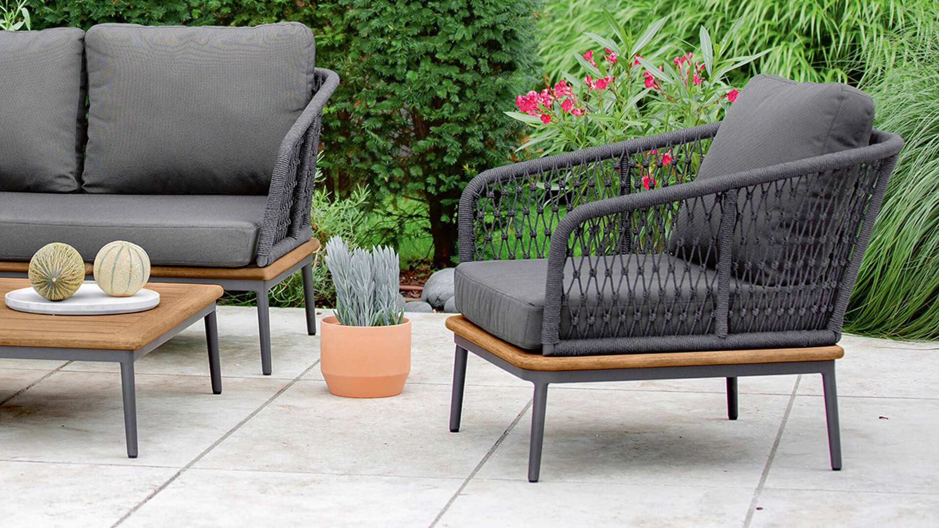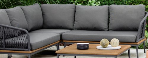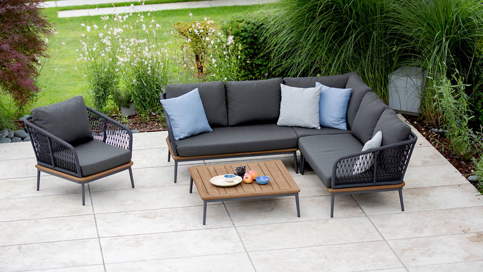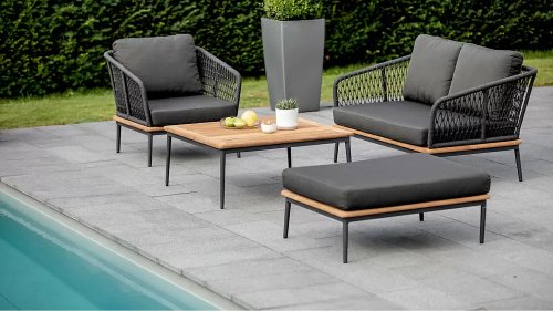 Weiche, gerundete Formen und Proportionen sowie eine außergewöhnliche Kordelflechtung zeichnen die Loungegruppe Freeeport aus dem Hause Niehoff Garden aus. Ein optisches Highlight bildet die besondere Art der Kordelflechtung in Kombination mit Gestell aus Aluminium und Teakholz. Das Modulsystem Freeport bietet einen hohen Grad an Flexibilität, so lässt sich durch das modulare Elementsystem mühelos eine individuelle, für Sie passende Zusammenstellung bilden.
