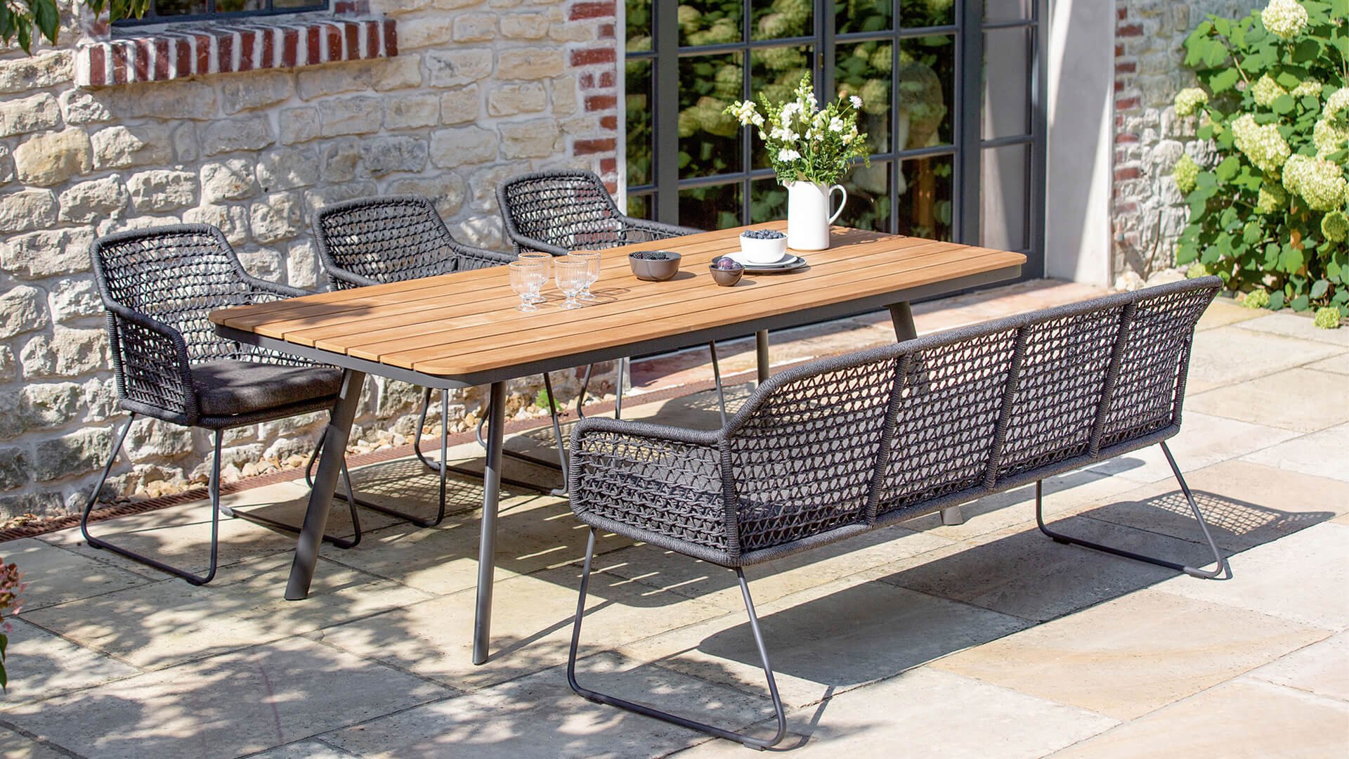 Aluminium ist ein Leichtmetall und kommt in vielen Bereichen unseres Alltags zum Einsatz. Aluminium kann mit langer Lebensdauer, sehr guter Korrosionsbeständigkeit sowie unterschiedlichen Oberflächen überzeugen. Eine spezielle Pulverbeschichtung schützt das Metall vor Umwelteinflüssen und verleiht ihm gleichzeitig eine elegante, matte Optik. Aufgrund dieser Eigenschaften verwenden wir dieses Material für unsere Gartenmöbel.