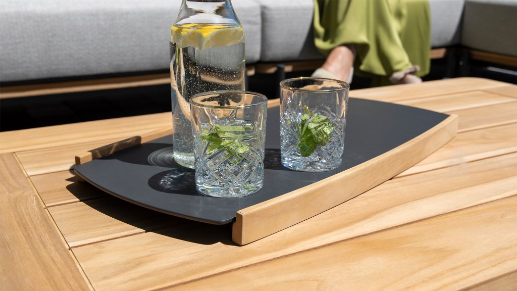 Das anthrazitfarbene Aluminium ist pflegeleicht und witterungsbeständig. Sie können es gut draußen lassen. Das hochwertige Teakholz, das im Tablett verarbeitet wird, hält auch einem Spritzer Regen stand. Wenn Sie die schöne goldbraune Farbe behalten möchten, empfehlen wir Ihnen, das Tablett drinnen zu lagern oder es mit Teak Protector zu behandeln.