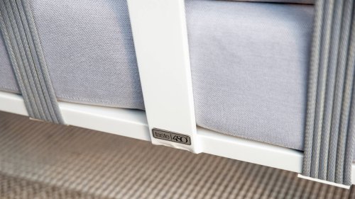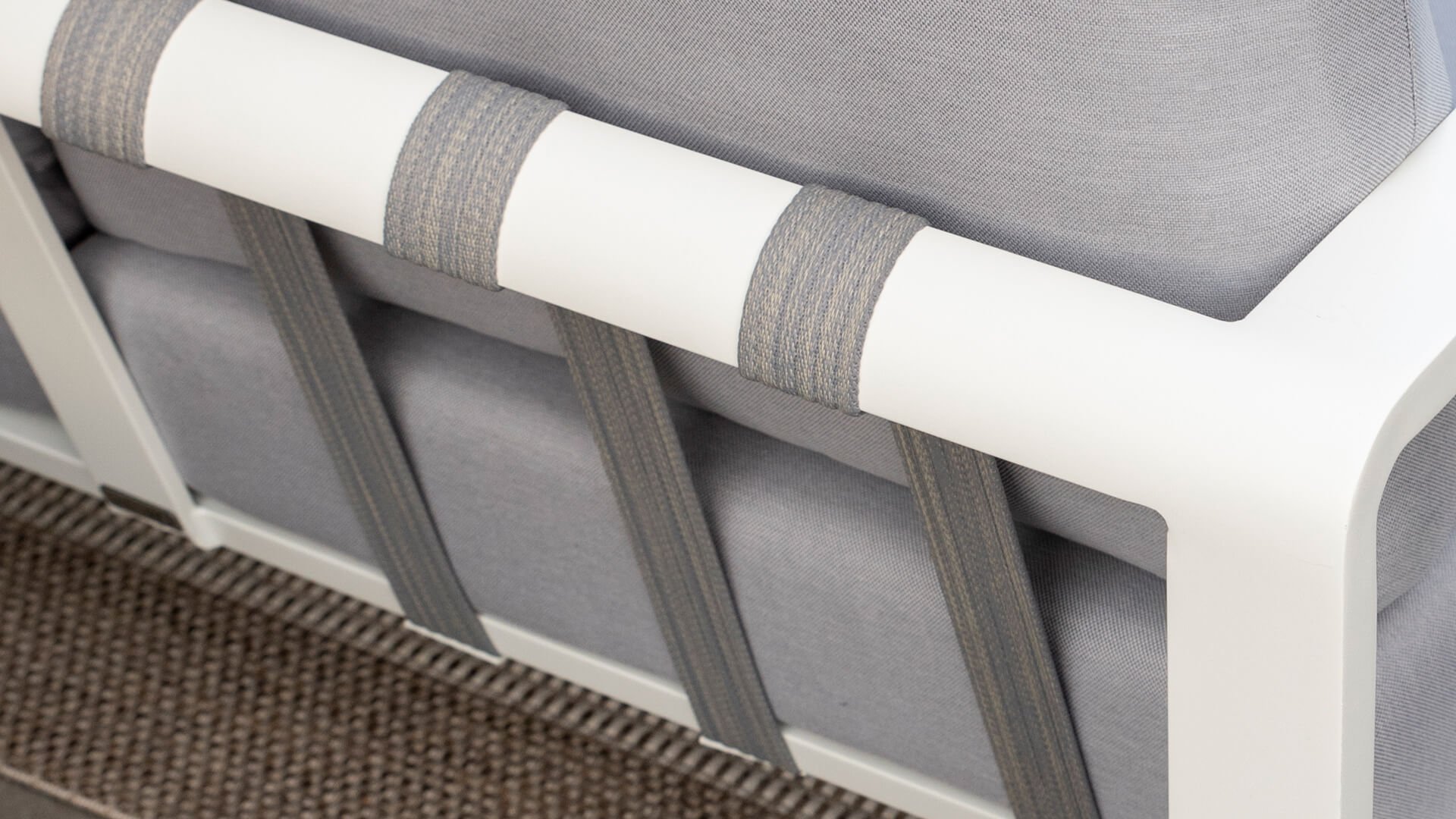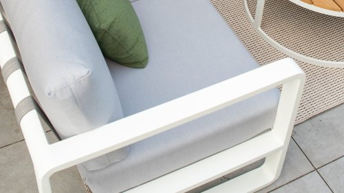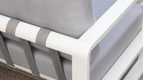 Der robuste Aluminium Rahmen von Taste Omega verfügt über eine matte Pulverbeschichtung in der Farbe Weiß. Die Kissen in der Farbe Light Grey sind herrlich voluminös und sehen einladend aus. Der Stoff ist wetterbeständig und hat eine robuste Optik. Die Taste Omega Gartenmöbel verfügen über dicke und sehr bequeme Kissen mit Bezügen aus Olefin-Material, das extrem witterungsbeständig und langlebig ist. Einfach den Reißverschluss öffnen und bei 30 Grad waschen / trocknen. DieTextilene Bands im Rahmen verarbeitet geben einen großen Komfort Tafe 4SO Omega Lounge.