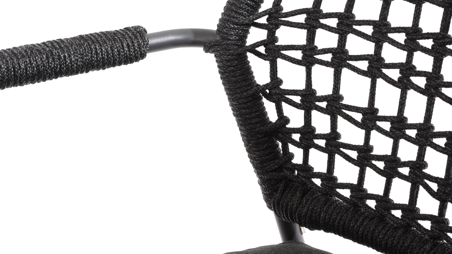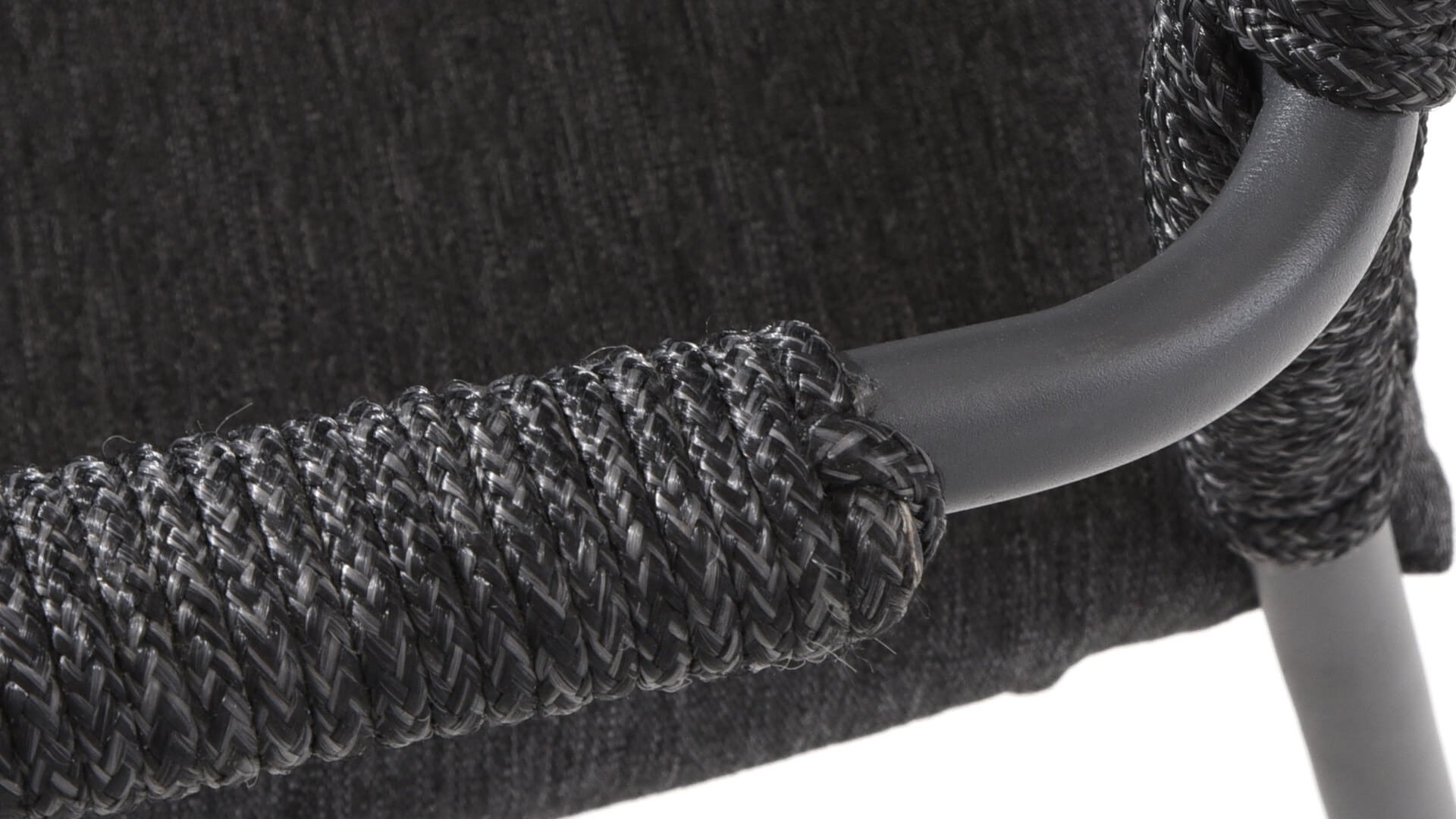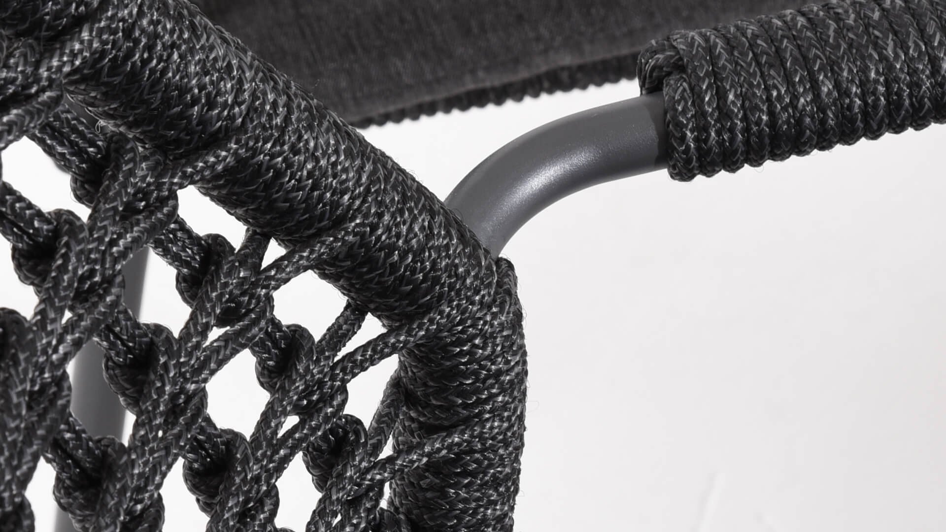 Dieser Stuhl ist in drei Farben erhältlich: Anthrazit, Terre und Latte. Das Seilmaterial ist wetterfest und in einem Schachbrettmuster geknotet, das sich dezent in den Armlehnen wiederfindet.