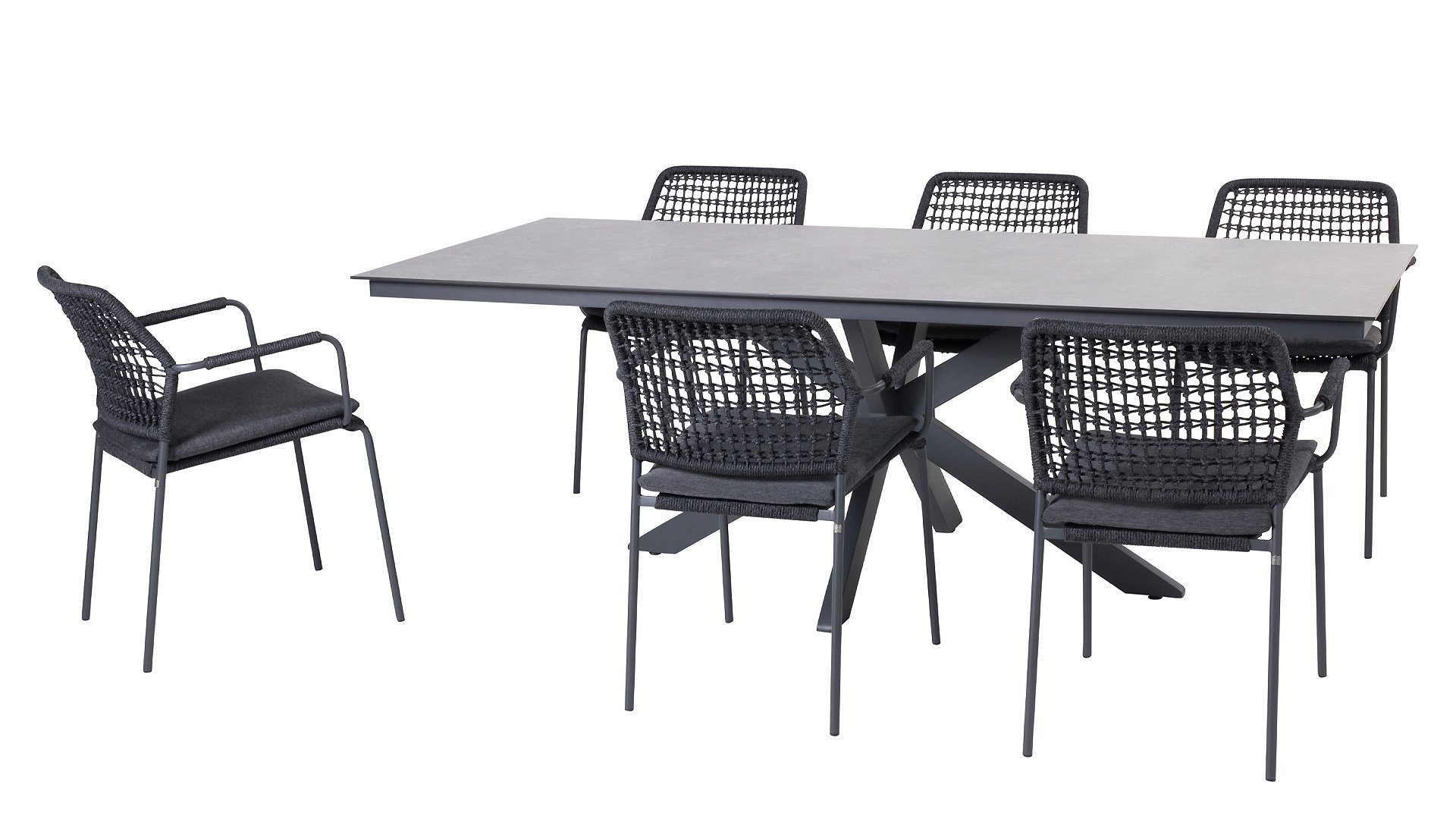 Dieser Stuhl ist in drei Farben erhältlich: Anthrazit, Terre und Latte. Das Seilmaterial ist wetterfest und in einem Schachbrettmuster geknotet, das sich dezent in den Armlehnen wiederfindet.