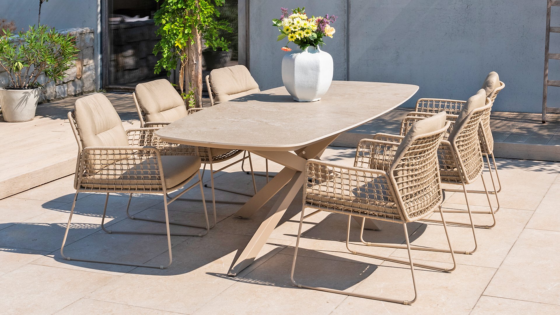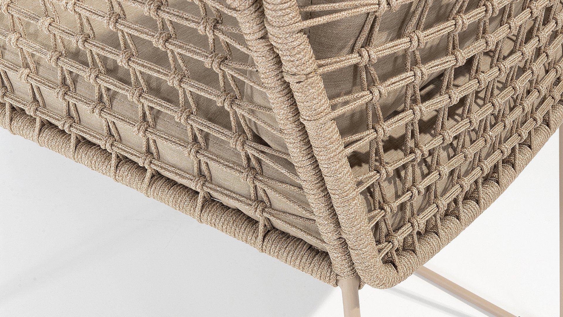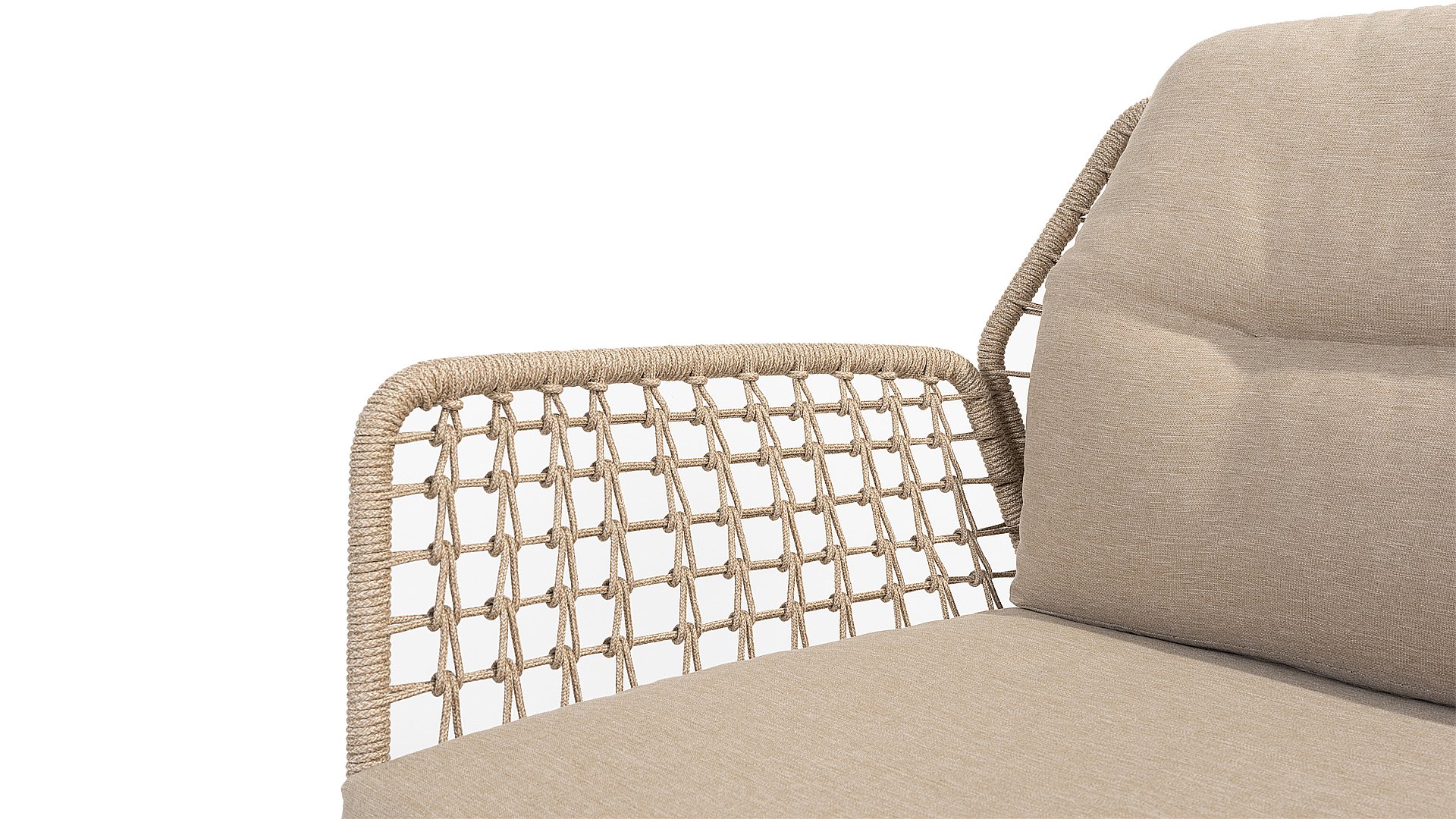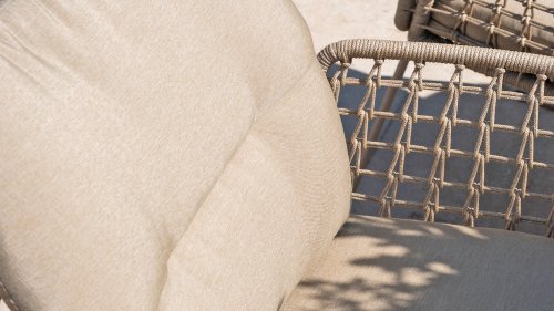 Dieses wunderschöne Material eignet sich perfekt für den Außenbereich, denn Rope ist nicht nur eine normale Spitze, an der Sie Ihre Schuhe binden können. Unsere runden Fäden sind mit einem Kunststoffkern versehen. Diese Basis aus Polypropylen sorgt dafür, dass sich das Rope minimal dehnt und sie nimmt außerdem keine Feuchtigkeit auf. Die Umhüllung besteht aus Acrylstoff, der mit dem wetterfesten Stoff unserer Gartenkissen vergleichbar ist. Diese Umhüllung fühlt sich weich an und ist sehr wasserabweisend, UV-beständig und farbecht. Die flachen Rope-Varianten besitzen den gleichen wetterfesten Materialmix, doch das Polypropylen-Material wurde hier mit dem Acryl-Stoff verwebt. Durch diese Technik besitzt das flache Rope die gleichen Eigenschaften, hat jedoch eine ganz andere Ausstrahlung.