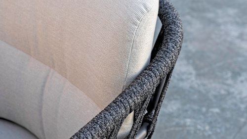 Was den Stuhl wirklich besonders macht, ist der Komfort, den er bietet. Die hellgrauen Kissen sind eine perfekte Ergänzung zum dunklen Rahmen und der Seilpolsterung. Die Kissen sowohl für die Rückenlehne als auch für die Sitzfläche bestehen aus Olefin, einem Material, das nicht nur weich und bequem ist, sondern sich auch ideal für Gartenmöbel eignet. Olefin ist wasserabweisend, atmungsaktiv und beständig gegen UV-Strahlung, sodass Ihre Kissen jahrelang schön bleiben. Vergessen Sie jedoch nicht, sie zu pflegen.