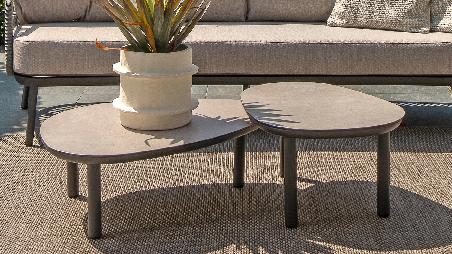 Verleihen Sie Ihrem Wohnraum einen Hauch von Eleganz und Raffinesse mit der Couchtischserie Monroe von Taste by 4 Seasons Outdoor. Dieses wunderschöne Set besteht aus zwei organisch geformten Tischen mit kieselsteinförmigen Tischplatten – verspielt und doch perfekt ausbalanciert. Dank seines unverwechselbaren Designs wird der Monroe zum stilvollen Blickfang in jedem Innen- und Außenbereich.