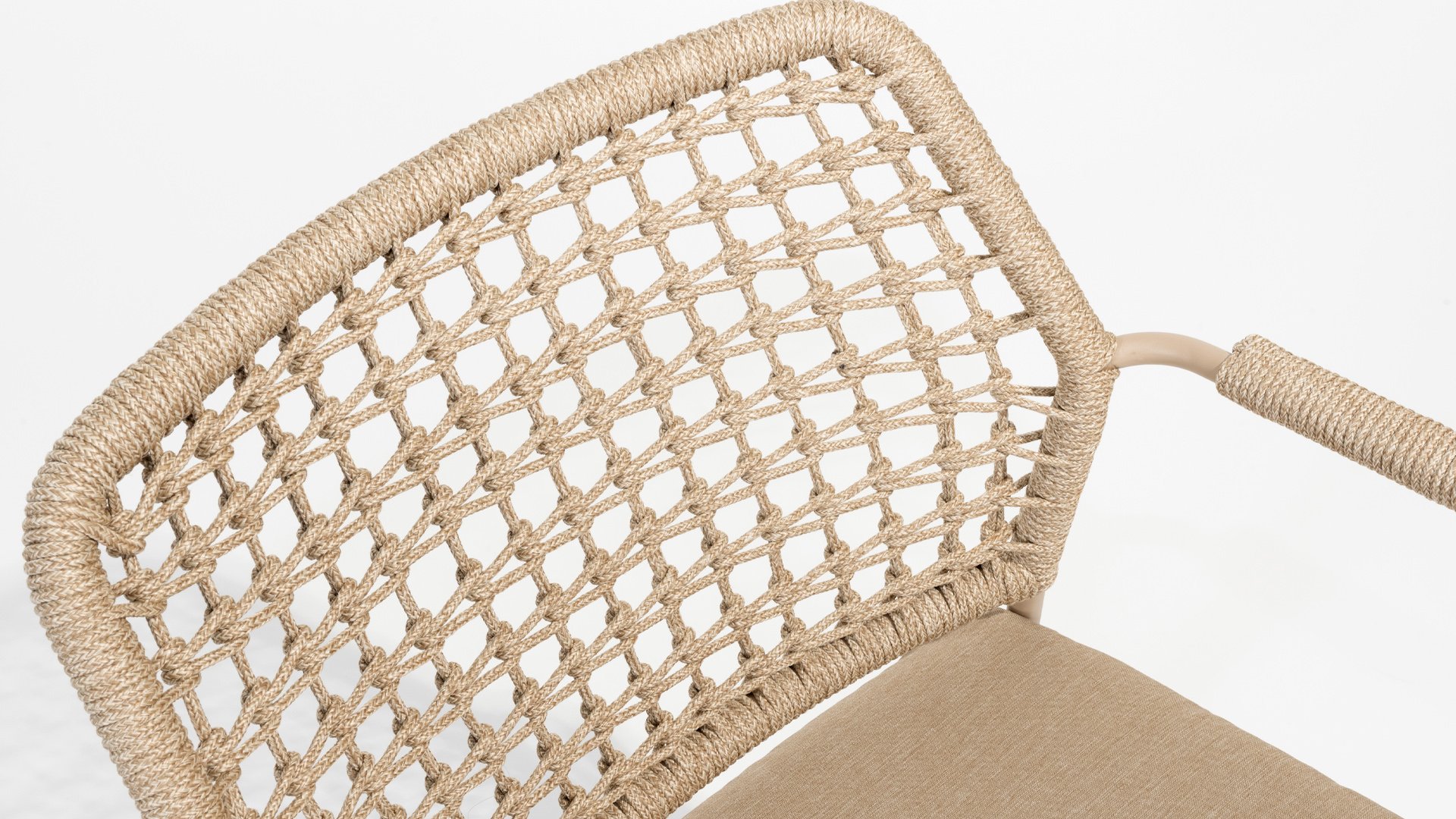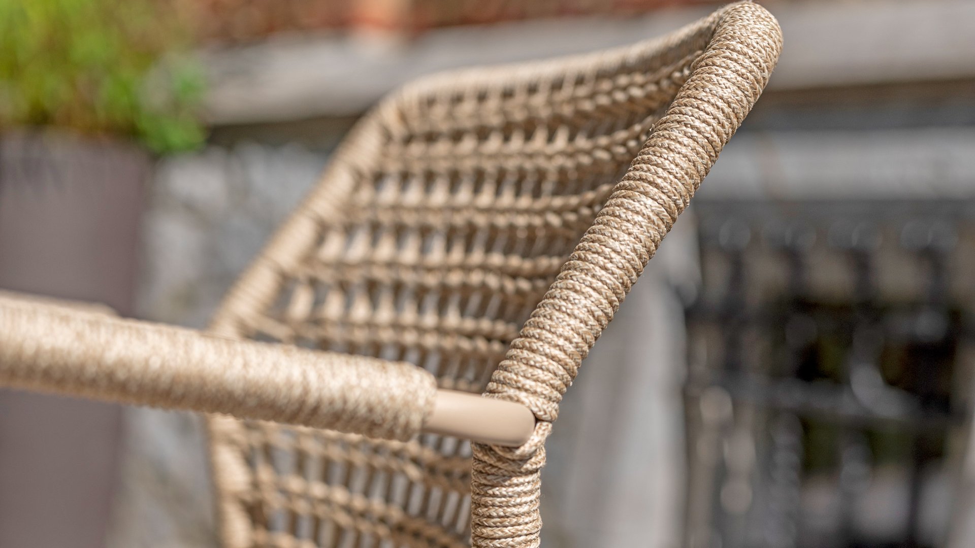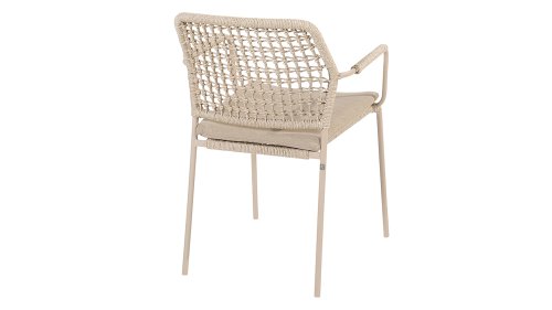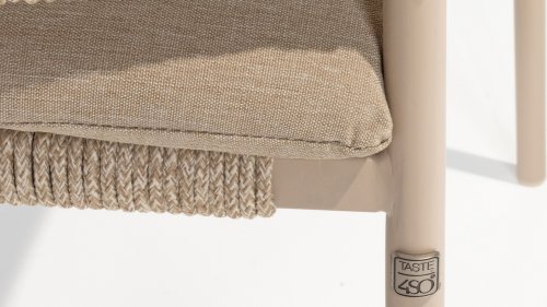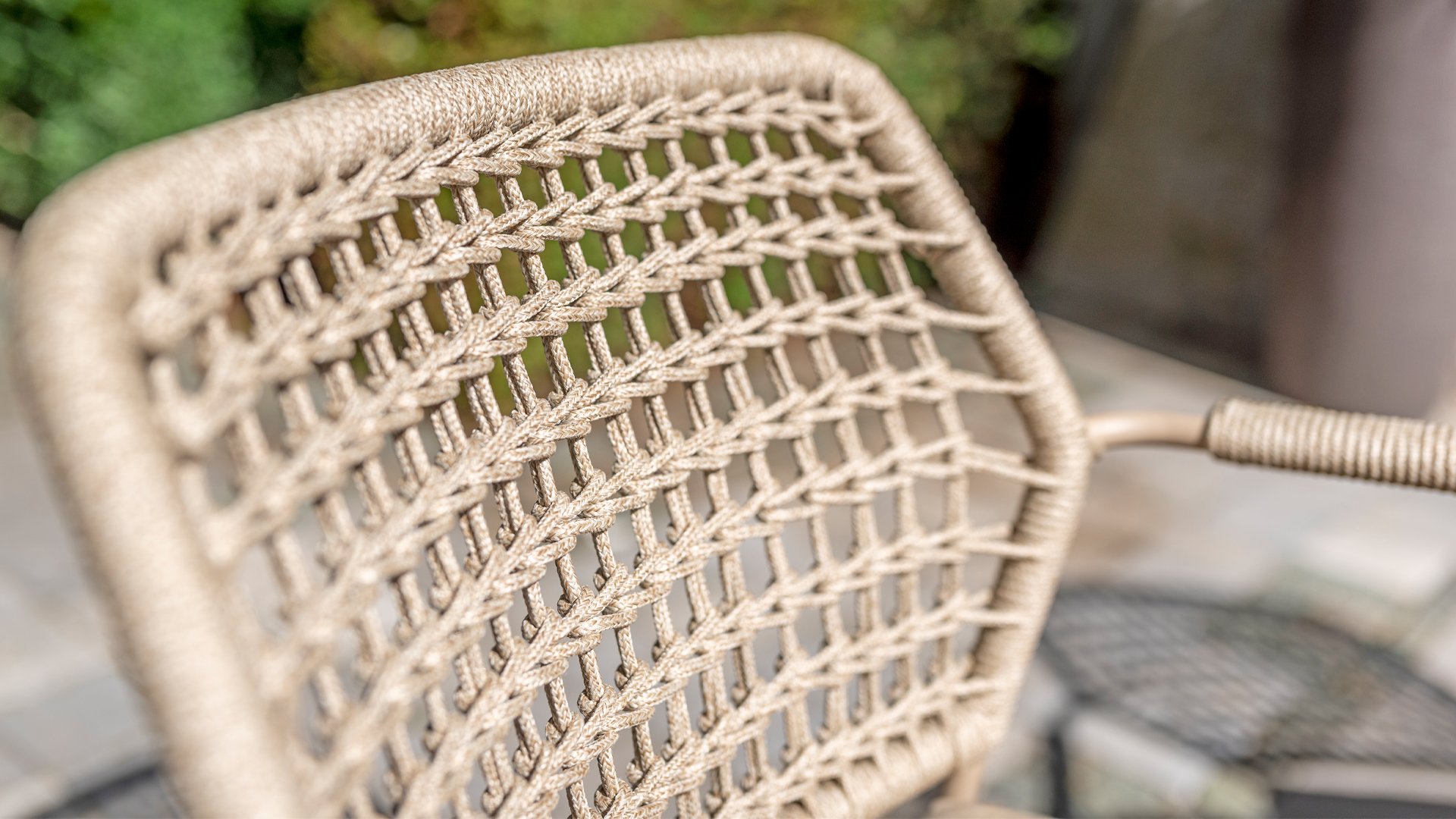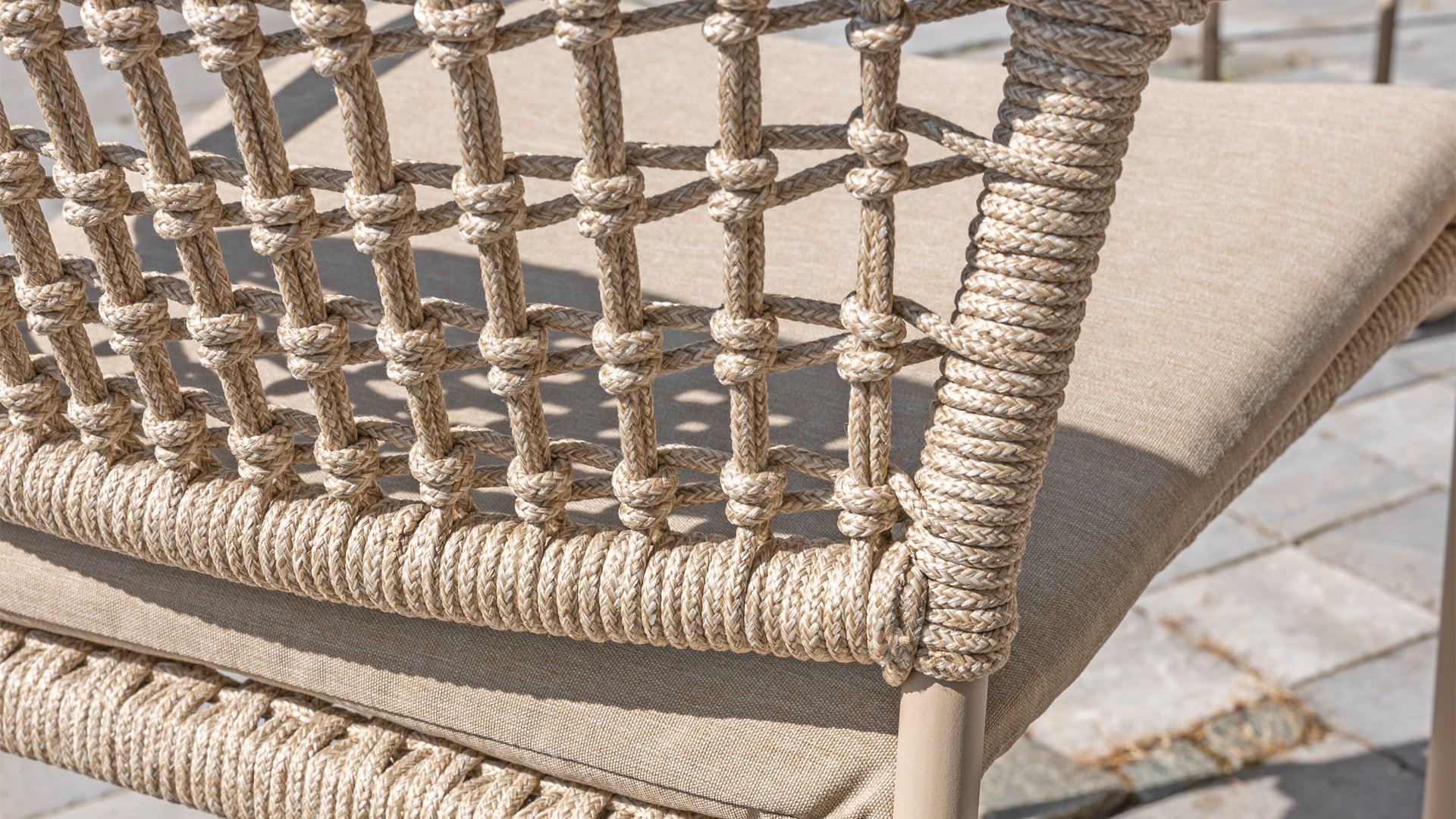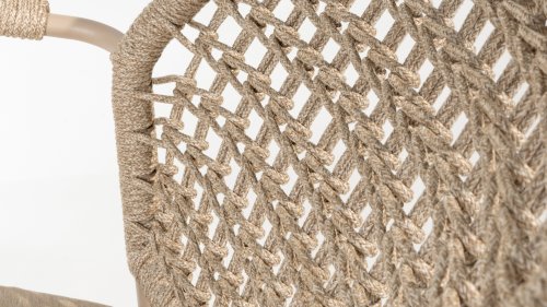 Dieser Stuhl ist in drei Farben erhältlich: Anthrazit, Terre und Latte. Das Seilmaterial ist wetterfest und in einem Schachbrettmuster geknotet, das sich dezent in den Armlehnen wiederfindet.