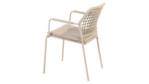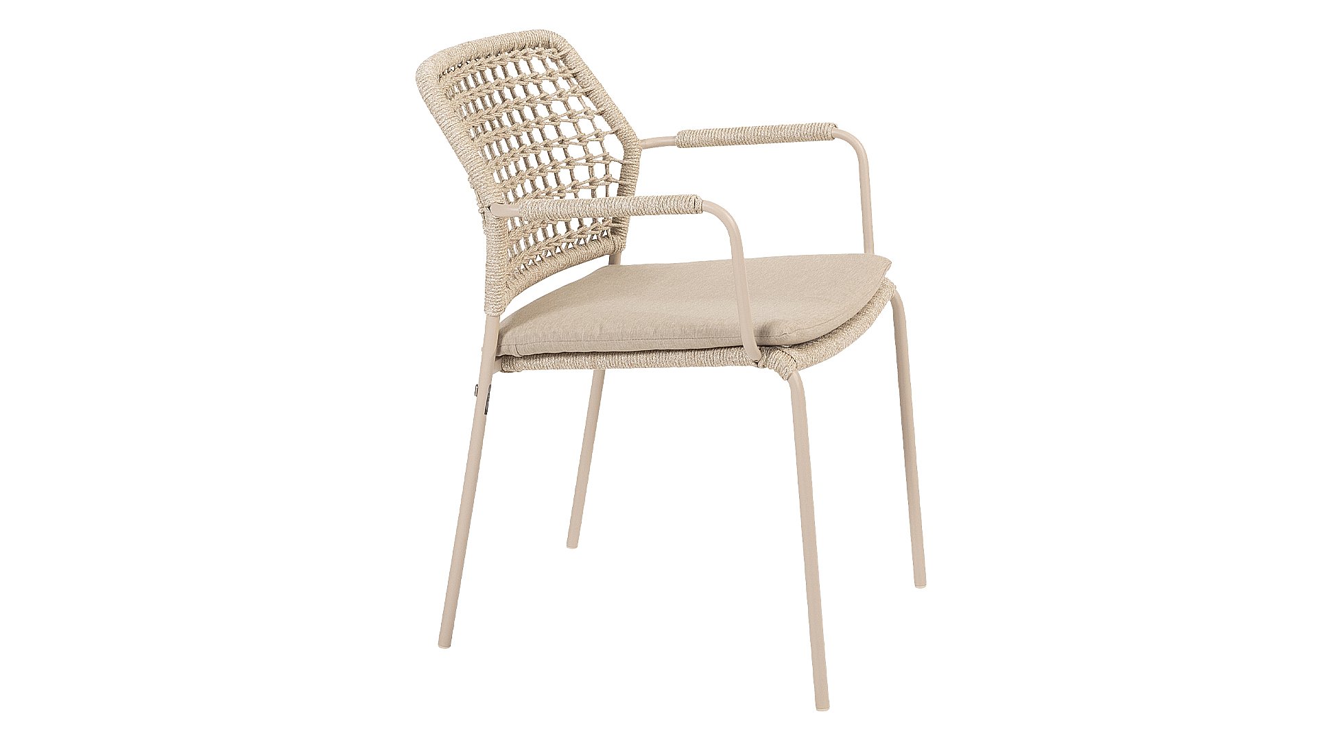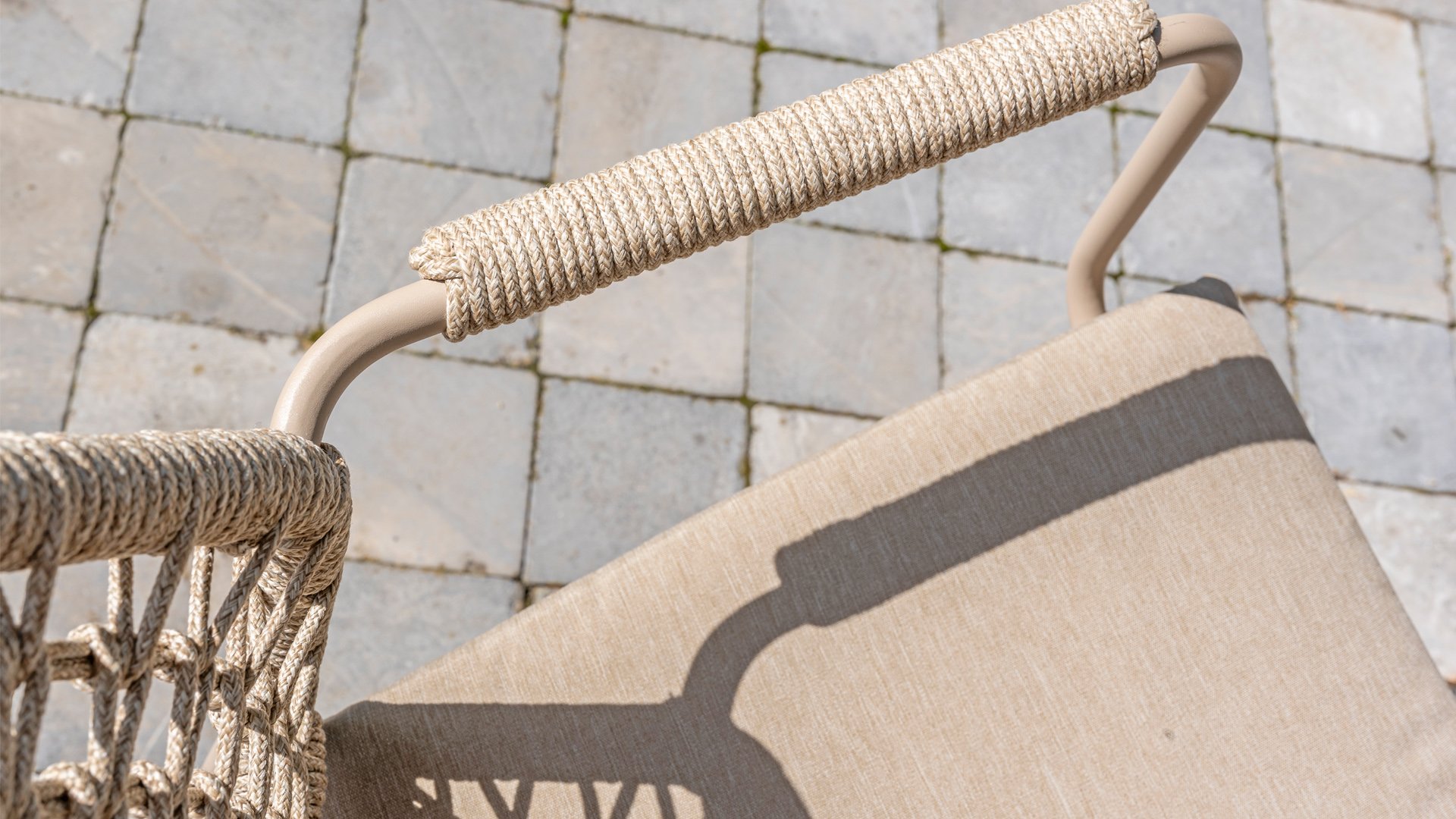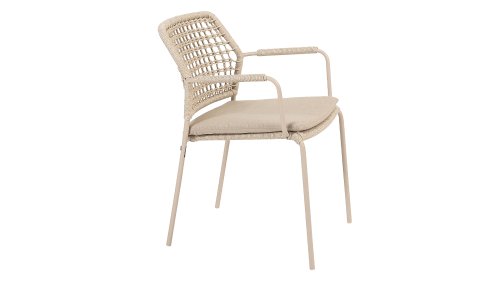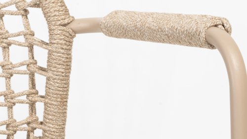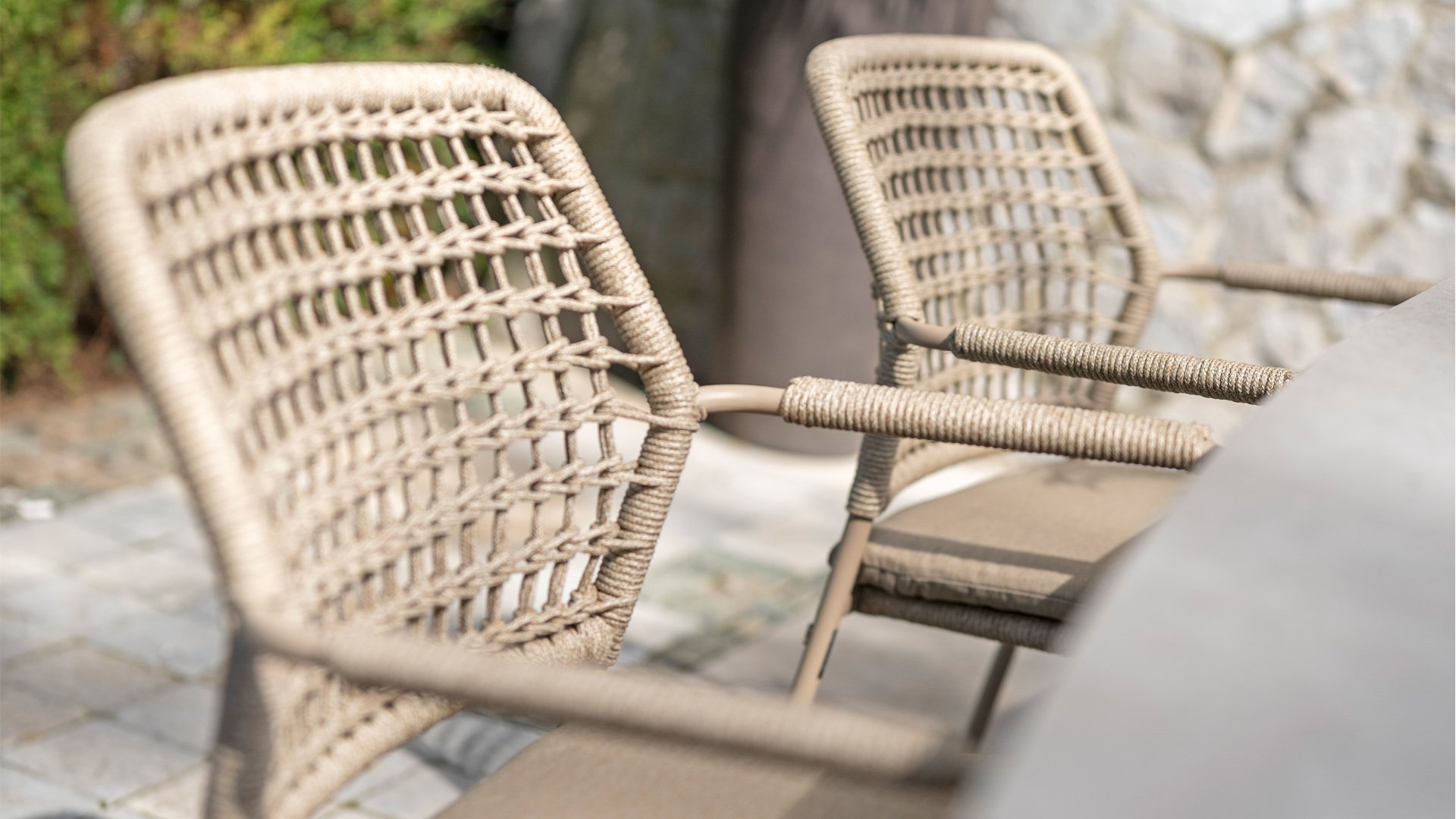 Dieser Stuhl ist in drei Farben erhältlich: Anthrazit, Terre und Latte. Das Seilmaterial ist wetterfest und in einem Schachbrettmuster geknotet, das sich dezent in den Armlehnen wiederfindet.