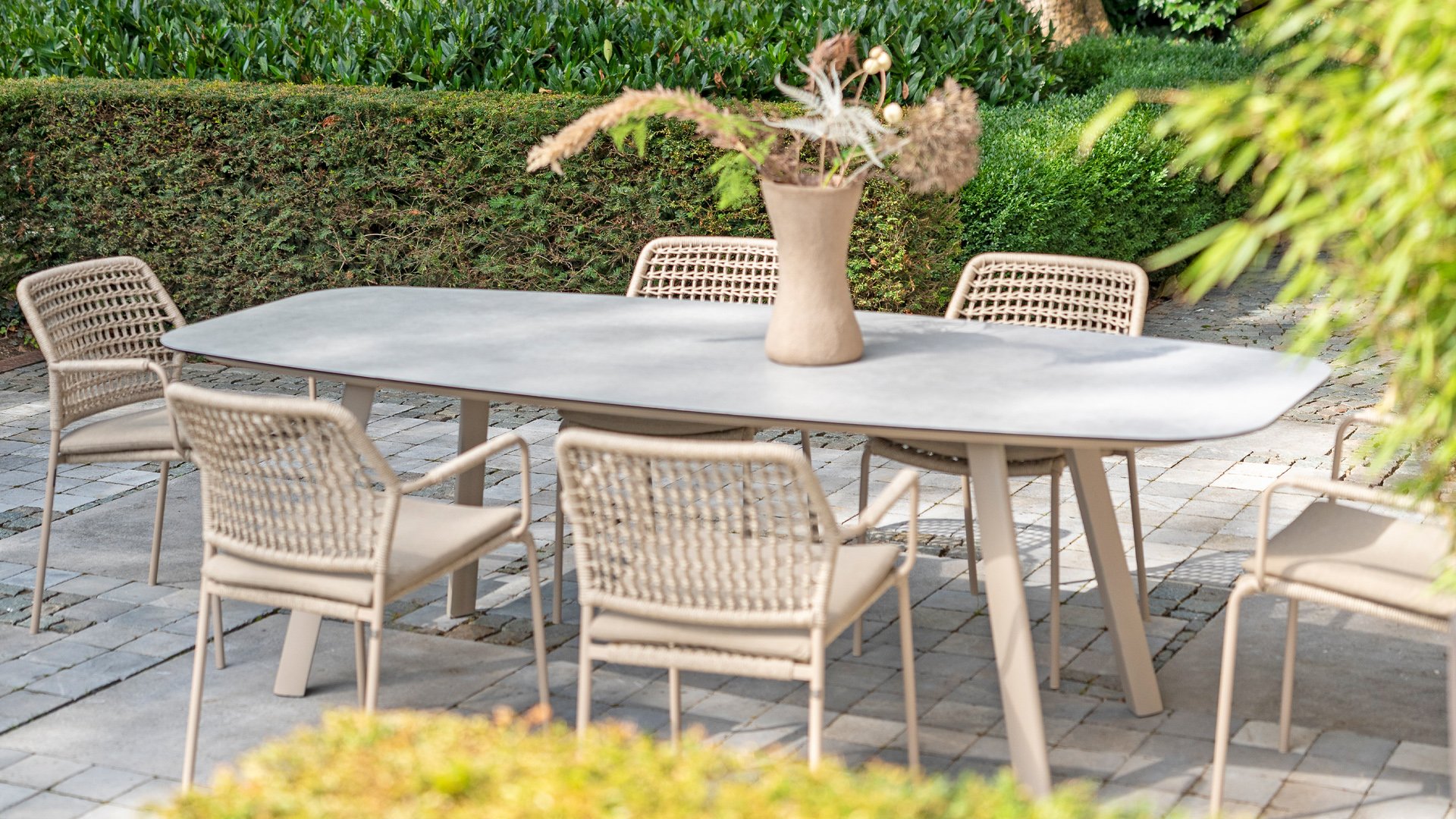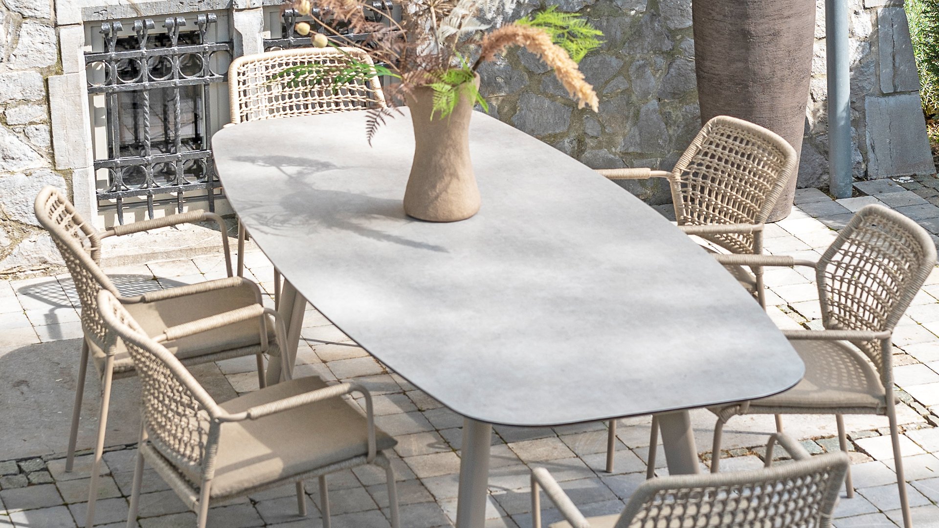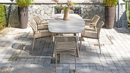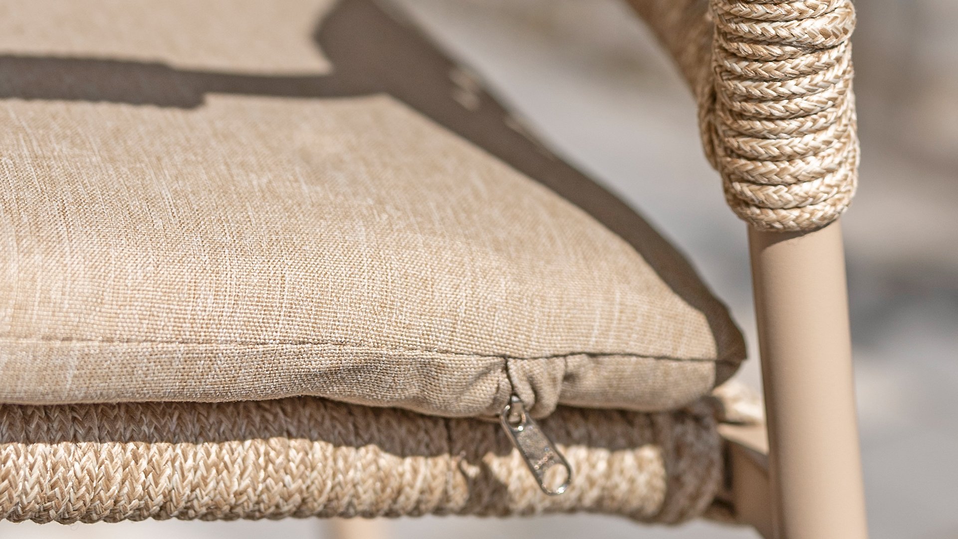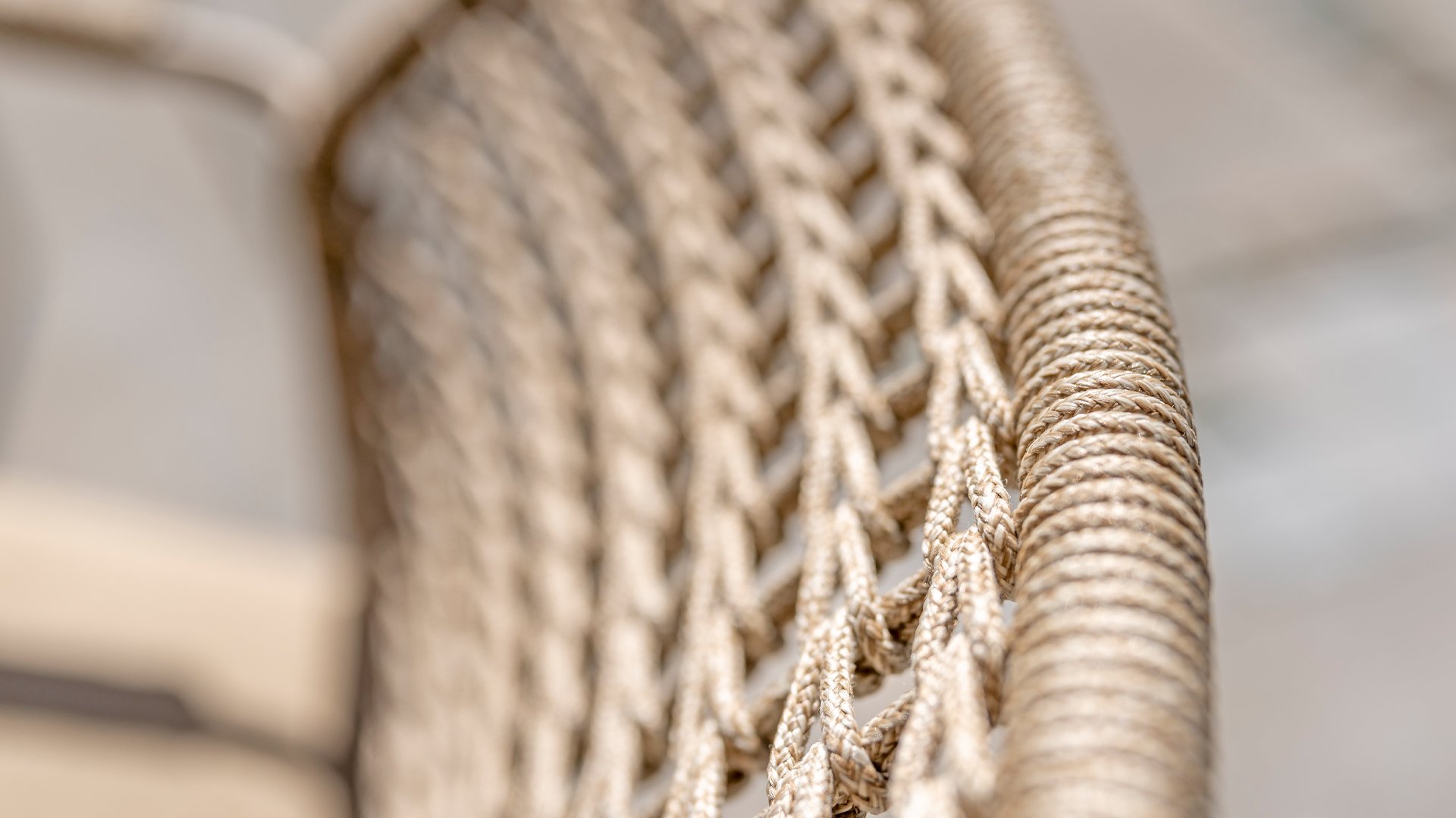 Dieser Stuhl ist in drei Farben erhältlich: Anthrazit, Terre und Latte. Das Seilmaterial ist wetterfest und in einem Schachbrettmuster geknotet, das sich dezent in den Armlehnen wiederfindet.