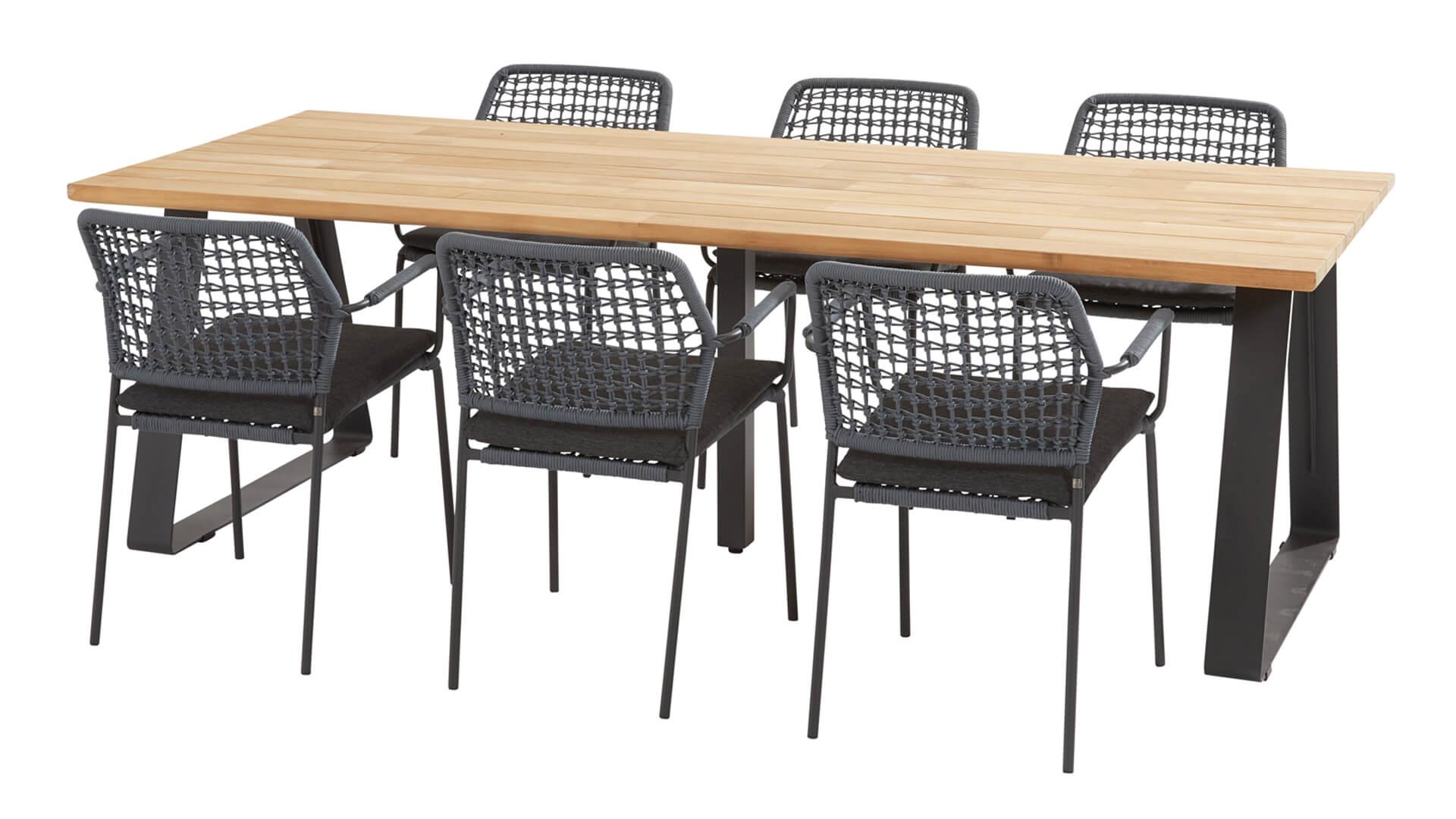 oller Geschmack! Der stapelbare Gartenstuhl Barista ist ein echter Alleskönner, herrlich bequem und sehr praktisch und sieht auch noch schick aus. Lässt sich sehr gut mit verschiedenen Arten von Tischen kombinieren. Dieser Stuhl ist in 5 Seilfarben erhältlich: Anthrazit, Grün, Blau, Frozen und Latte. Sie sehen hier die anthrazitfarbene Variante. So können Sie wählen, welche Farbe am besten zu Ihrer Terrasse passt, oder Sie können eine schöne Kombination aus 2 oder sogar 5 Farben erstellen. Das Seilmaterial ist witterungsbeständig und im Blockmuster geknüpft. Das Seil wird subtil zu den Armlehnen zurückgeführt.