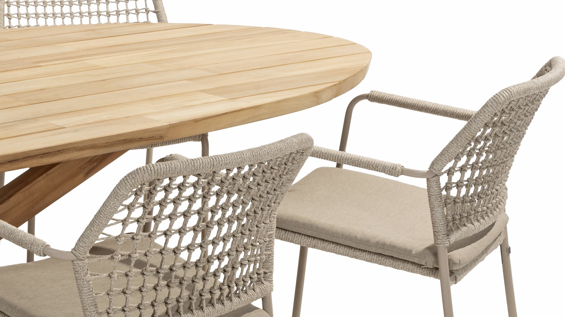 Der stapelbare Gartenstuhl 4SO Barista von Taste by 4Seasons Outdoor ist ein moderner, schlichter Esszimmerstuhl, der in vielen Gartenstilen eine gute Figur macht. Ob moderner, eleganter Garten oder naturnaher Garten – der Barista-Stuhl passt fast immer. Dieser Stuhl ist in drei Farben erhältlich: Anthrazit, Terre und Latte. Das Seilmaterial ist wetterfest und in einem Schachbrettmuster geknotet, das sich dezent in den Armlehnen wiederfindet.