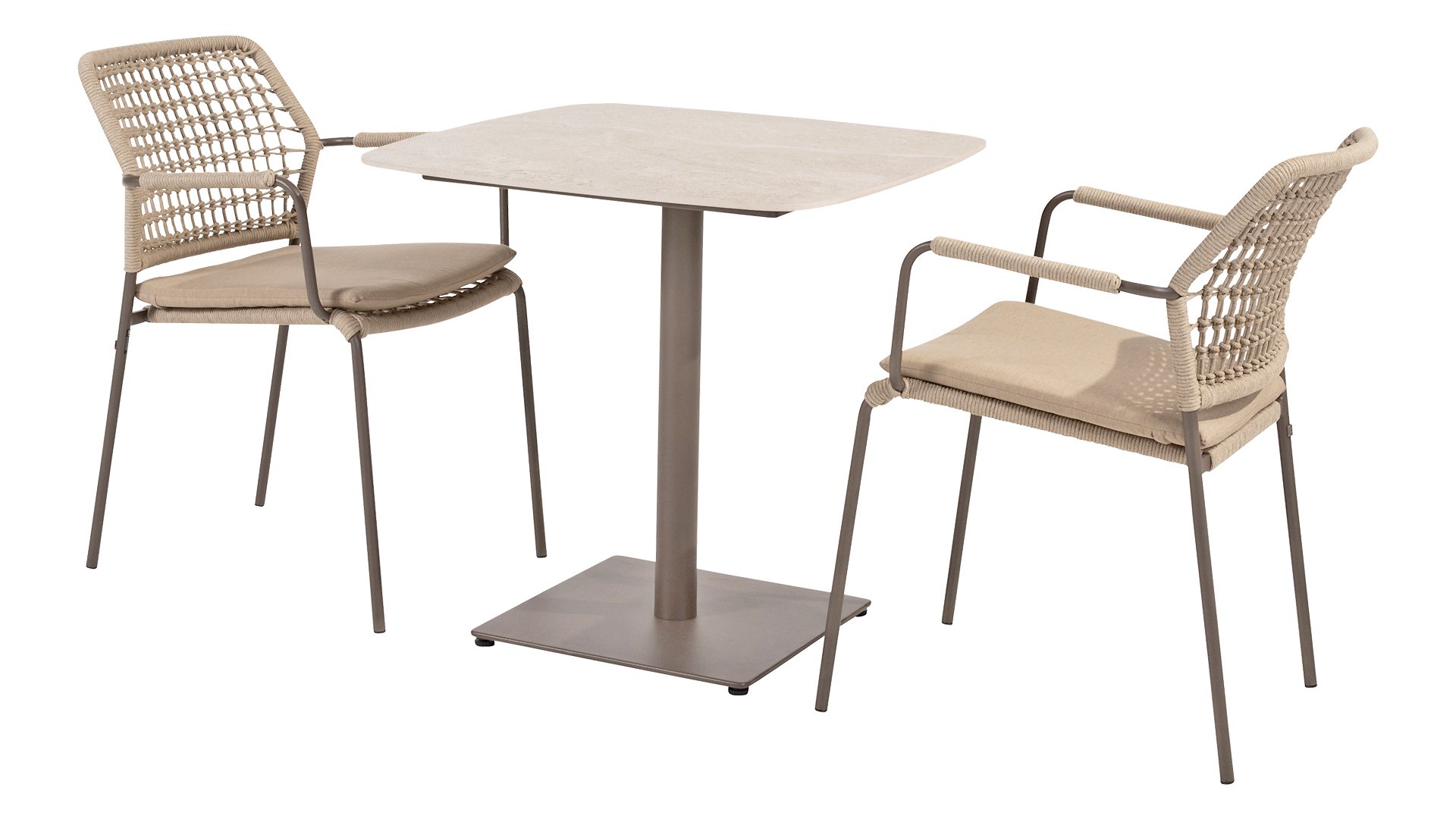 Der stapelbare Gartenstuhl 4SO Barista von Taste by 4Seasons Outdoor ist ein moderner, schlichter Esszimmerstuhl, der in vielen Gartenstilen eine gute Figur macht. Ob moderner, eleganter Garten oder naturnaher Garten – der Barista-Stuhl passt fast immer. Dieser Stuhl ist in drei Farben erhältlich: Anthrazit, Terre und Latte. Das Seilmaterial ist wetterfest und in einem Schachbrettmuster geknotet, das sich dezent in den Armlehnen wiederfindet.