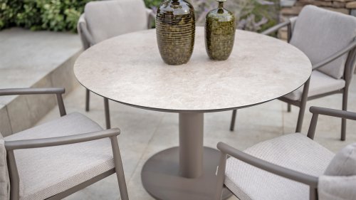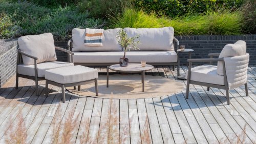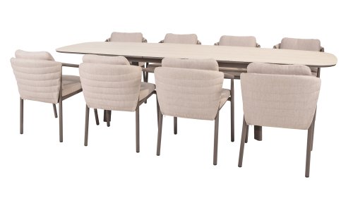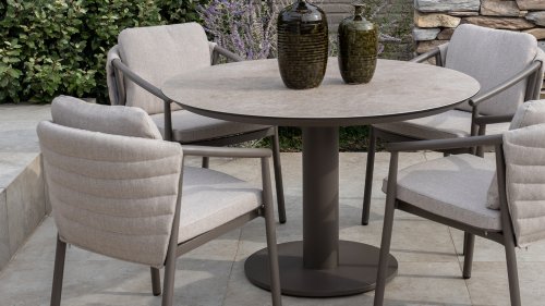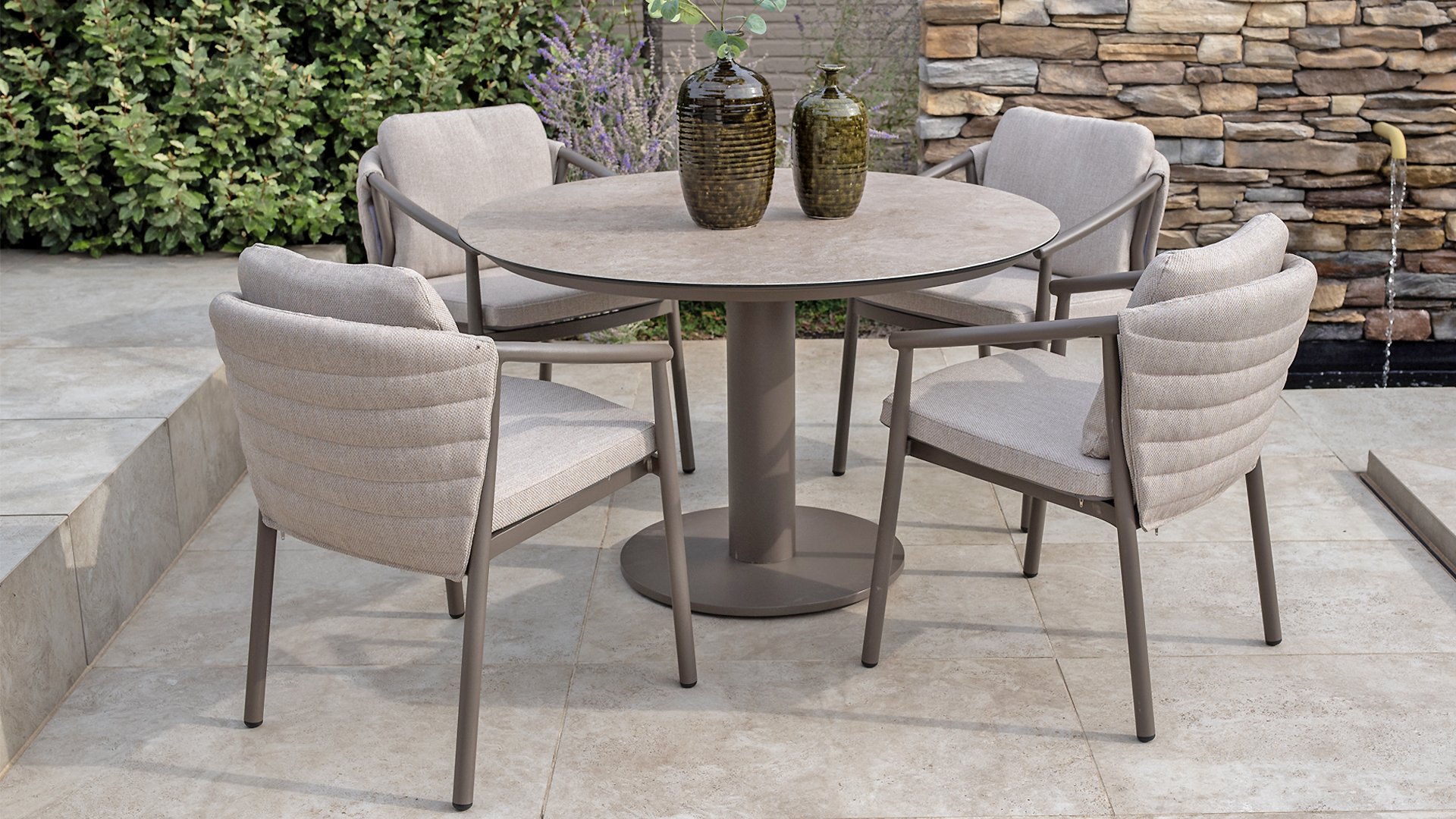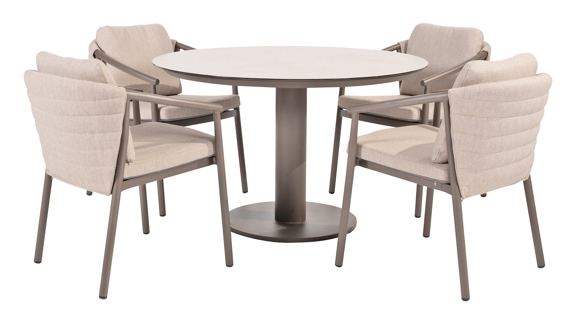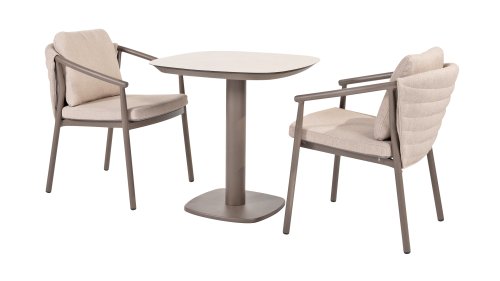 Der Taste 4SO Barolo ist einzigartig. Die gesteppte Rückenlehne verleiht dem Stuhl sein unverwechselbares Aussehen und bietet wunderbar weichen Sitzkomfort. In Kombination mit dem eleganten, pulverbeschichteten Aluminiumgestell „Terre“ und dem stilvollen grauen Seil, das die Kissen umgibt, schafft der Stuhl eine ruhige und stilvolle Optik, die perfekt in jeden modernen Garten passt. Die hellgrauen Kissen runden das Gesamtbild ab und laden zu langen, gemütlichen Abenden im Freien ein. Neben dem Gartenmöbelset ist in dieser Serie auch ein Lounge-Set erhältlich, um das Outdoor-Erlebnis abzurunden.