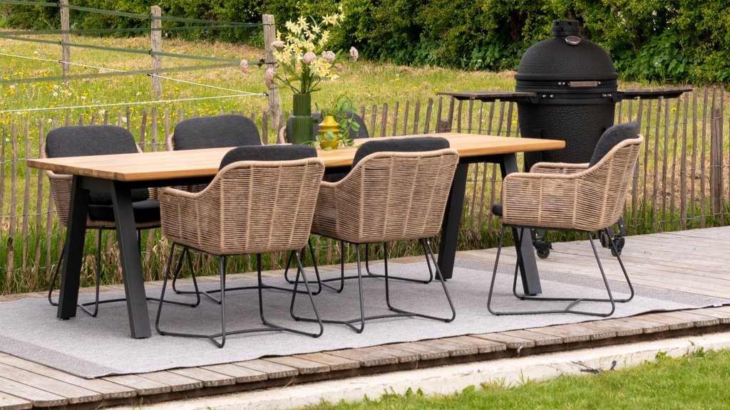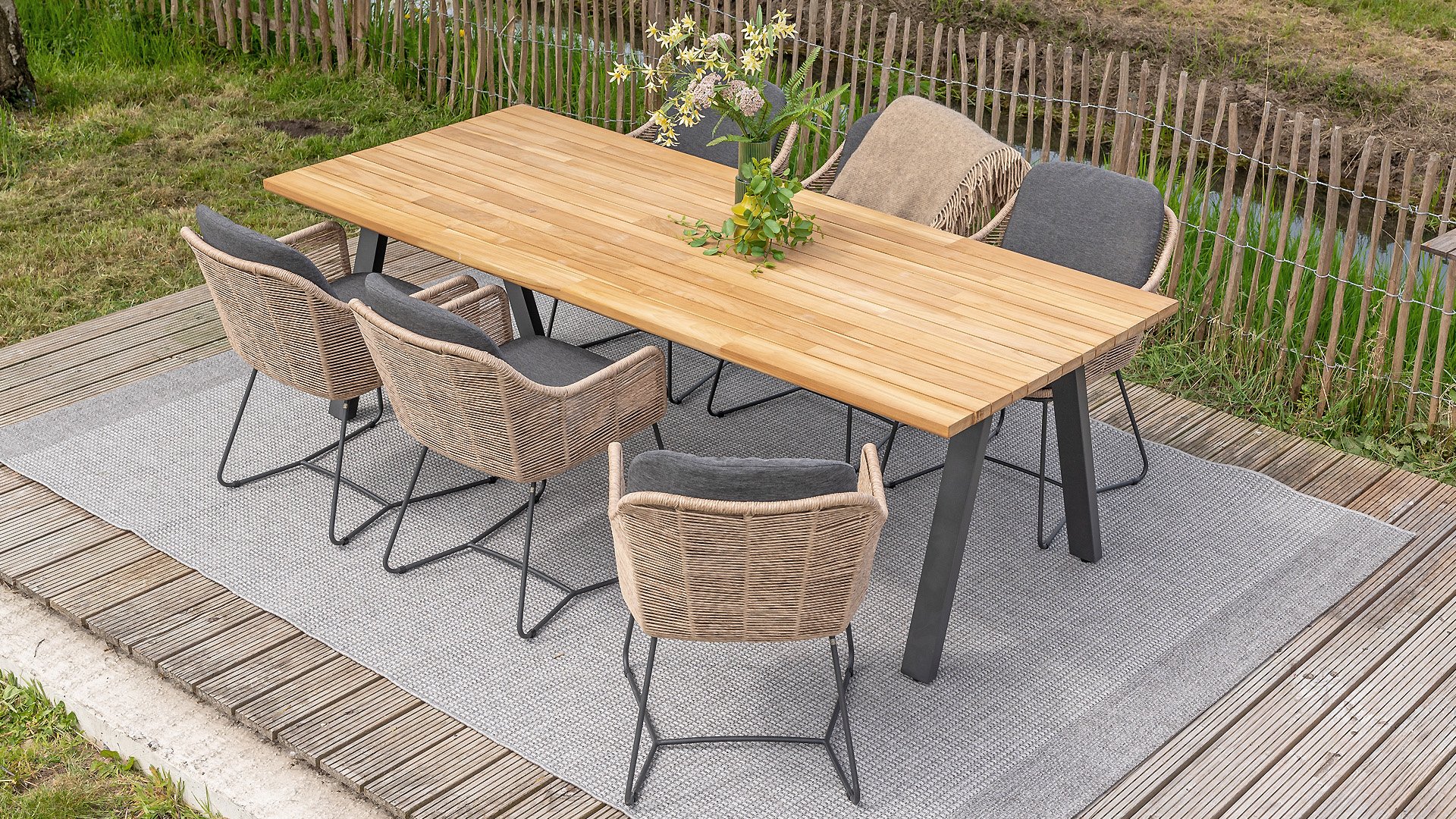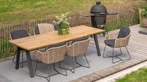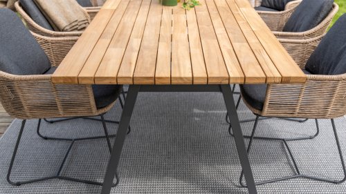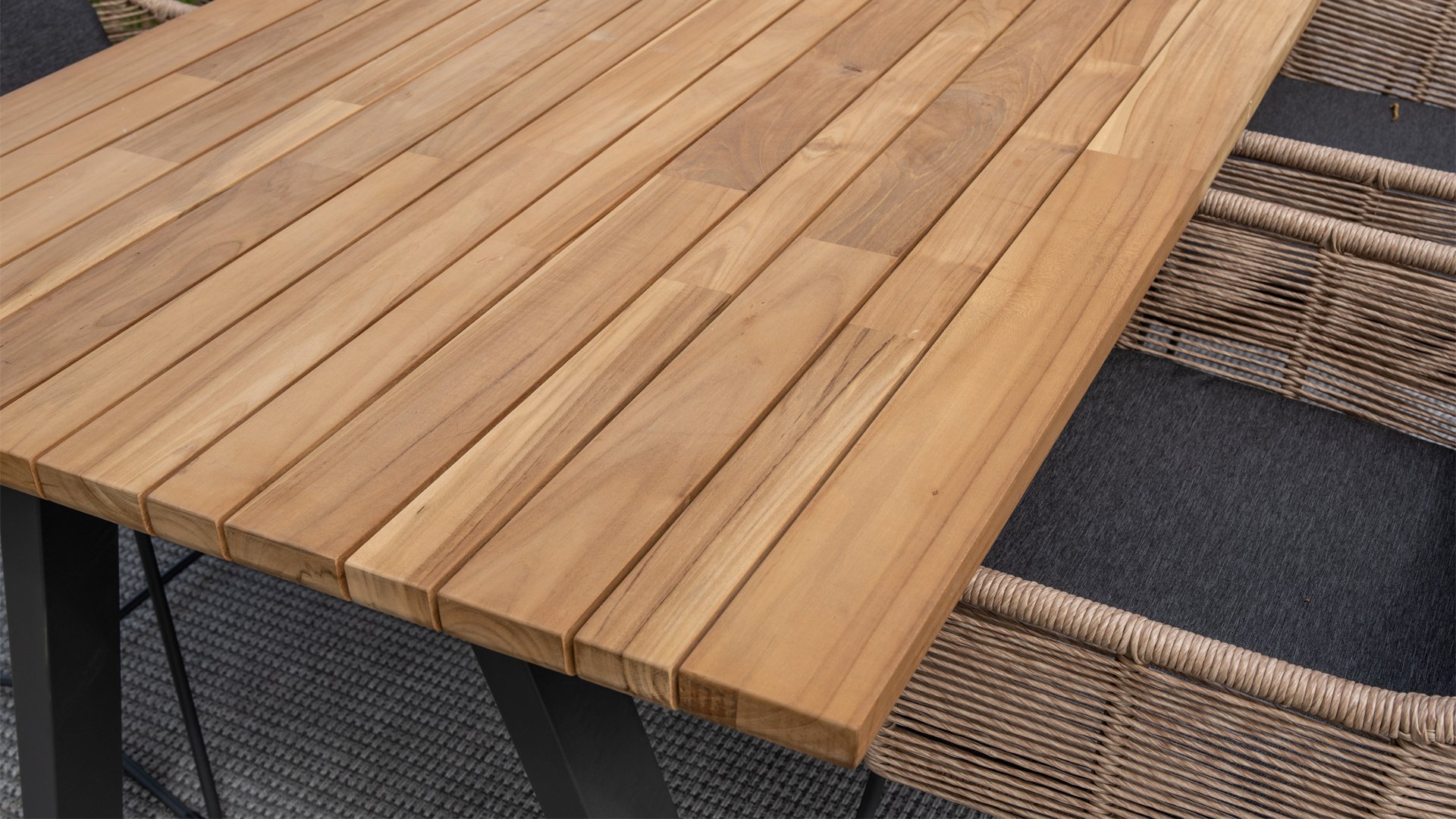 Gartenmöbel aus Teakholz bieten einen atemberaubenden Blick.Teakholz eignet sich besonders gut für den Einsatz im Außenbereich. Es ist resistent gegen Schädlinge und Pilze und widerstandsfähig gegen Sonne, Regen und Schnee. Mit der Zeit entwickelt das Teakholz eine silbergraue Patina. Gartenmöbel aus Teakholz bieten einen atemberaubenden Blick. Darüber hinaus ist es starkes Material und erfordert nur wenig Wartung. Wer die ursprüngliche Farbe des Teakholzes bevorzugt, kann durch regelmäßiges benutzen unser Pflegemittel ganz einfach das Vergrauen des Holzes verhindern.Darüber hinaus können Sie Teak mit grüner Seife reinigen. Durch Temperaturunterschiede und durch den Wechsel von Feuchtigkeit und Trockenheit können kleine Haarrisse entstehen. Es ist üblich, dass Man in dies Unvollkommenheiten findet, diese Unregelmäßigkeiten sind kennzeichnend für dieses Produkt. Diese Unregelmäßigkeiten können nie einen Anlass zu Reklamation, Garantie oder Claim formen. Es betrifft eine Unterschrift von Originalität! Wir gewähren Garantie auf alle Produktions- und Konstruktionsfehler. Die Wirkung von Teakholz ist nicht enthalten. Wenn Sie sich für Teakholz entscheiden, erwarten wir, dass Sie diese Eigenschaften zu schätzen wissen. Eventuell auftretende Haarrisse, Äste im Teakholz und raue Oberflächen im Laufe der Zeit fallen nicht unter unsere Garantie. Diese Eigenschaften verleihen dem Teakholz seinen eigenen Charakter und sind Teil der Optik. Seien Sie vorsichtig mit einem Blumentopf oder einer Vase auf Ihrem Gartentisch aus Teakholz, da dies zu hartnäckigen Kreisen oder Farbunterschieden führen kann.