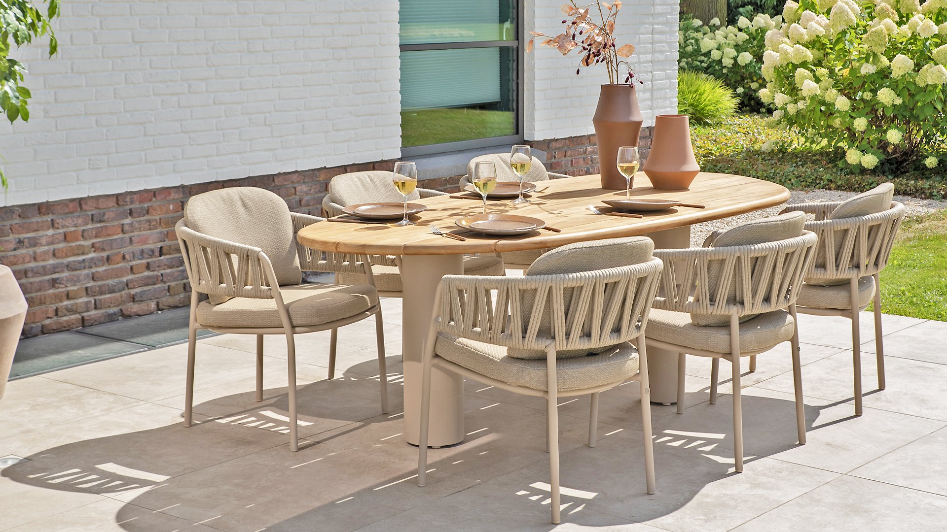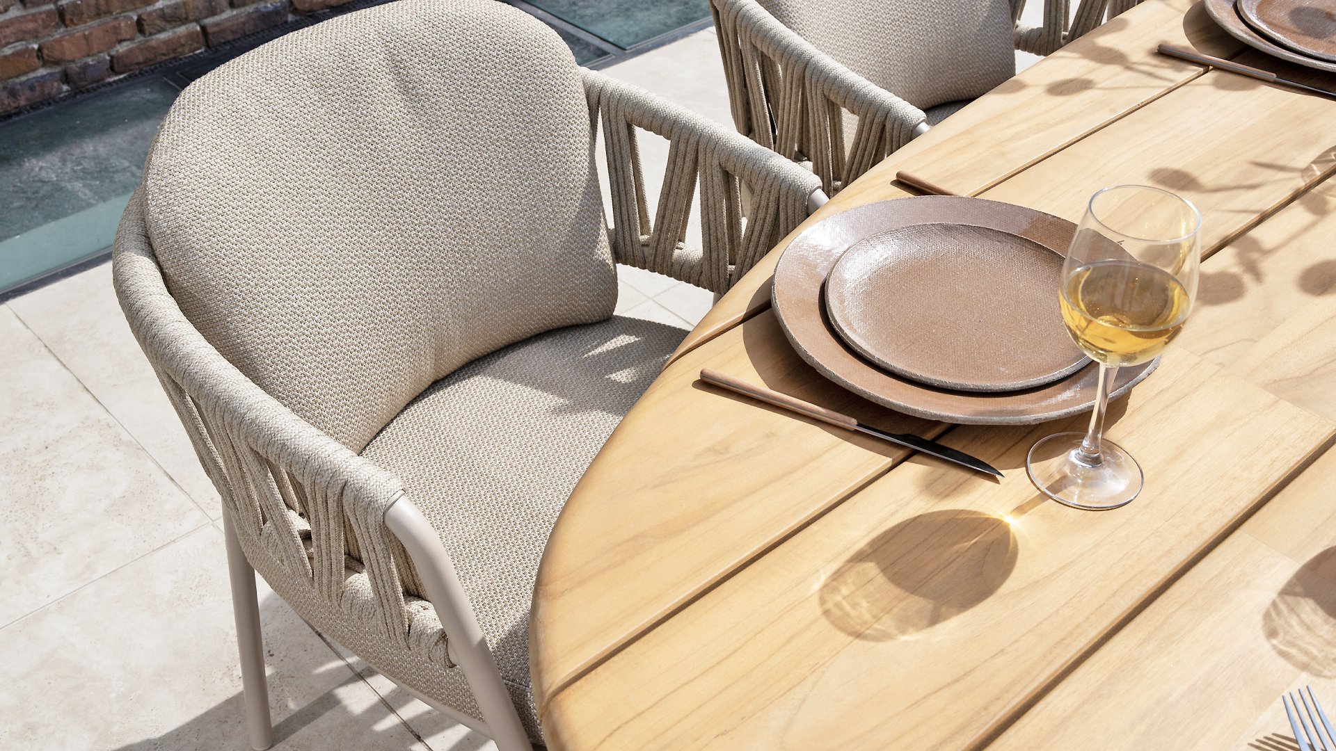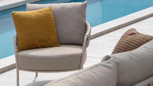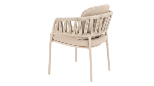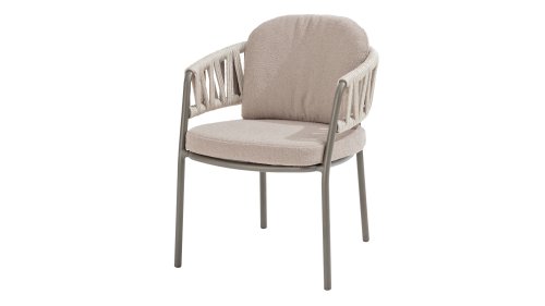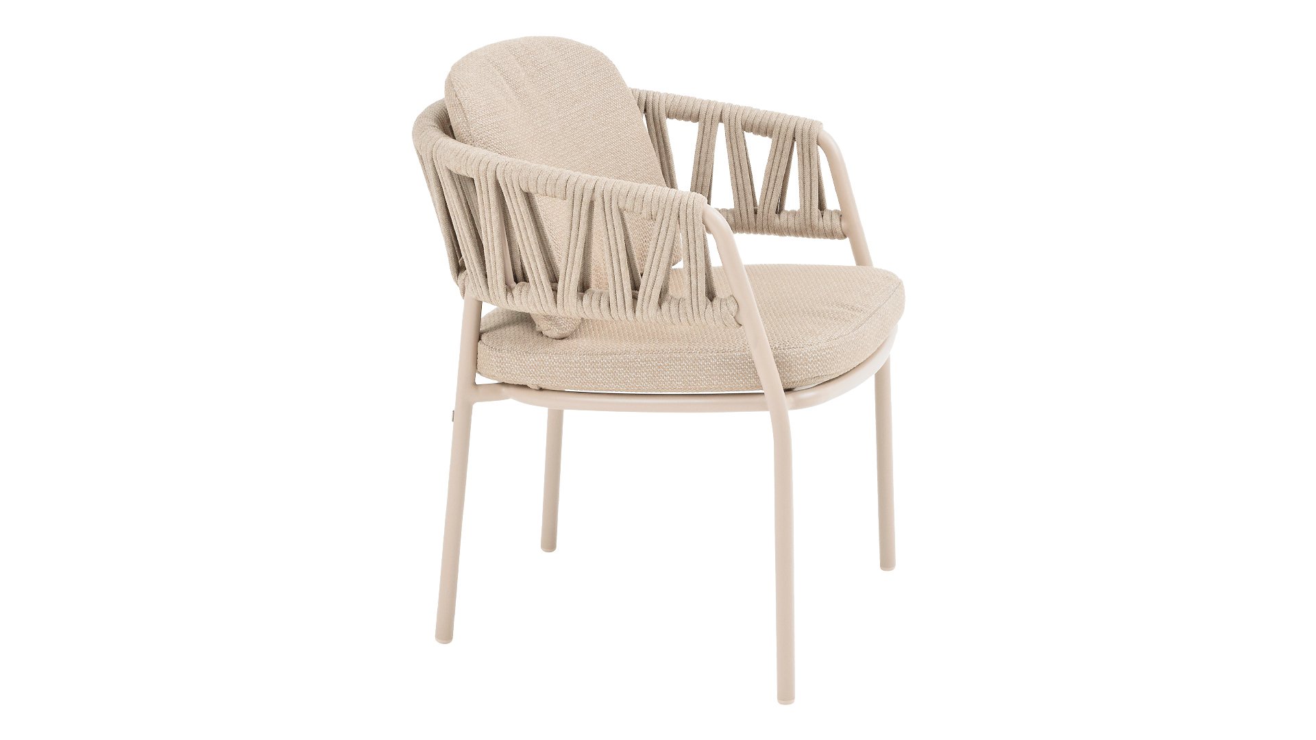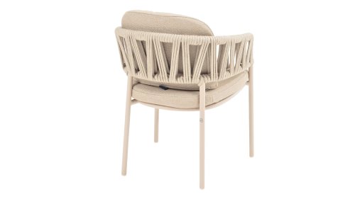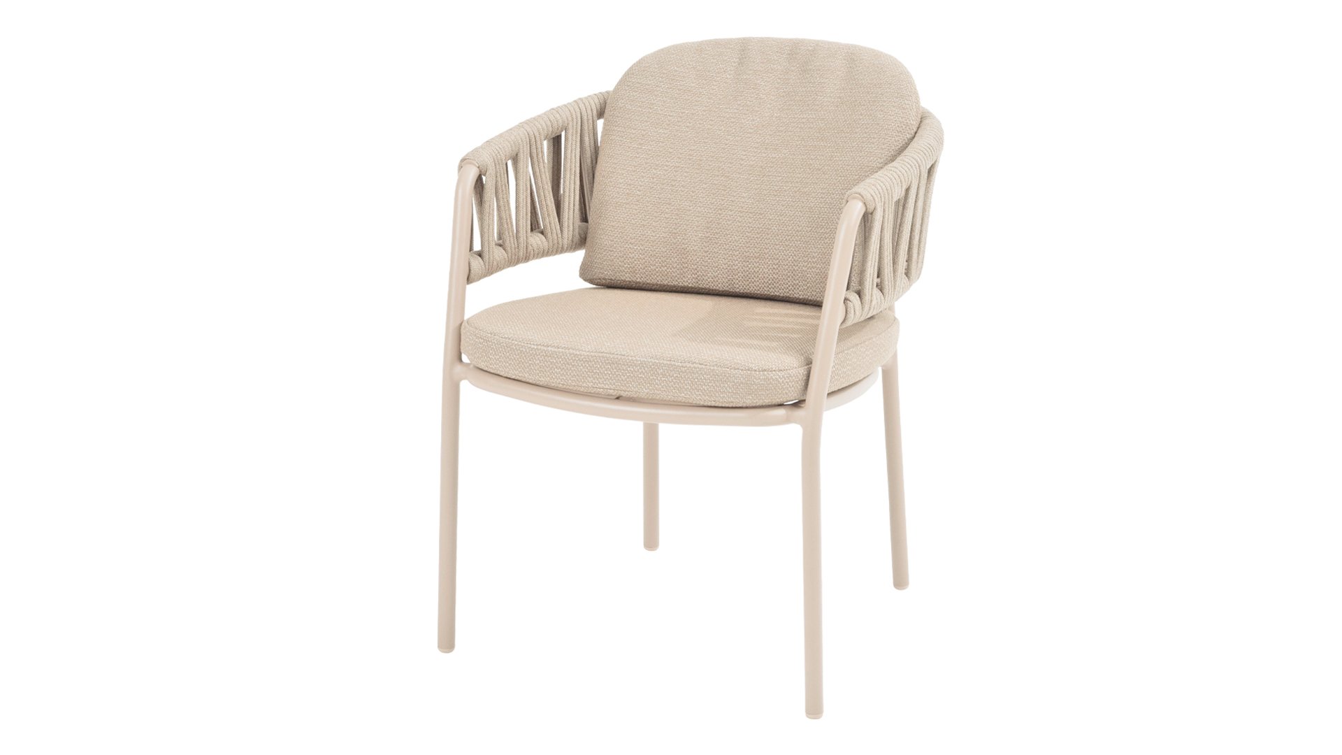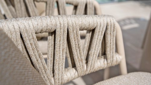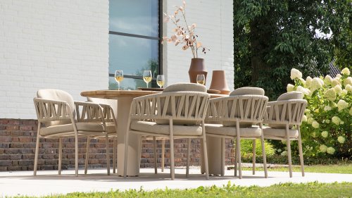 Der Taste by 4 Seasons Outdoor Calma Dining bringt Ruhe in Ihren Garten. In warmem Latte-Ton besticht dieser Stuhl durch ein wunderschön abgerundetes Gestell, das Armlehnen und Rückenlehne nahtlos zu einer fließenden Einheit verschmelzen lässt. Das raffinierte Seilmuster verleiht ihm eine elegante Note, während die weichen Sitz- und Rückenkissen außergewöhnlichen Komfort bieten. Dieser Stuhl ist in zwei Farben erhältlich: Latte und Terre. Er verfügt über bequeme, wetterbeständige Kissen, die sich weich anfühlen und schnell trocknen. So genießen Sie nicht nur den Komfort des Stuhls, sondern auch seine Pflegeleichtigkeit. Die Kissen sind im Lieferumfang enthalten, sodass Sie sofort höchsten Sitzkomfort erleben können.