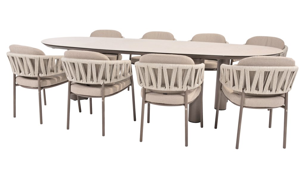 Ein wunderschöner, eleganter Tisch mit einer atemberaubenden ovalen Keramikplatte, erhältlich in 240 cm oder 300 cm. Die Platte strahlt nicht nur Eleganz aus, sondern besticht auch durch ihr markantes, modernes Aussehen. Das markante Kreuzbein ist in drei Farben erhältlich, sodass Sie diesen Tisch mühelos an Ihre Bedürfnisse und Vorlieben anpassen können. Ob Industrieschwarz, warmes Latte oder schickes Terre – jede Farbe verleiht dem Tisch einen einzigartigen Charakter und einen Hauch von Luxus. Mit seinen großzügigen Abmessungen bietet dieser Tisch ausreichend Platz für ein gemütliches Essen mit Freunden oder ein intimes Abendessen mit der Familie. Die Kombination aus raffinierter Keramik und dem starken, stilvollen Bein macht diesen Tisch nicht nur funktional, sondern setzt auch ein atemberaubendes Statement in Ihrem Garten.