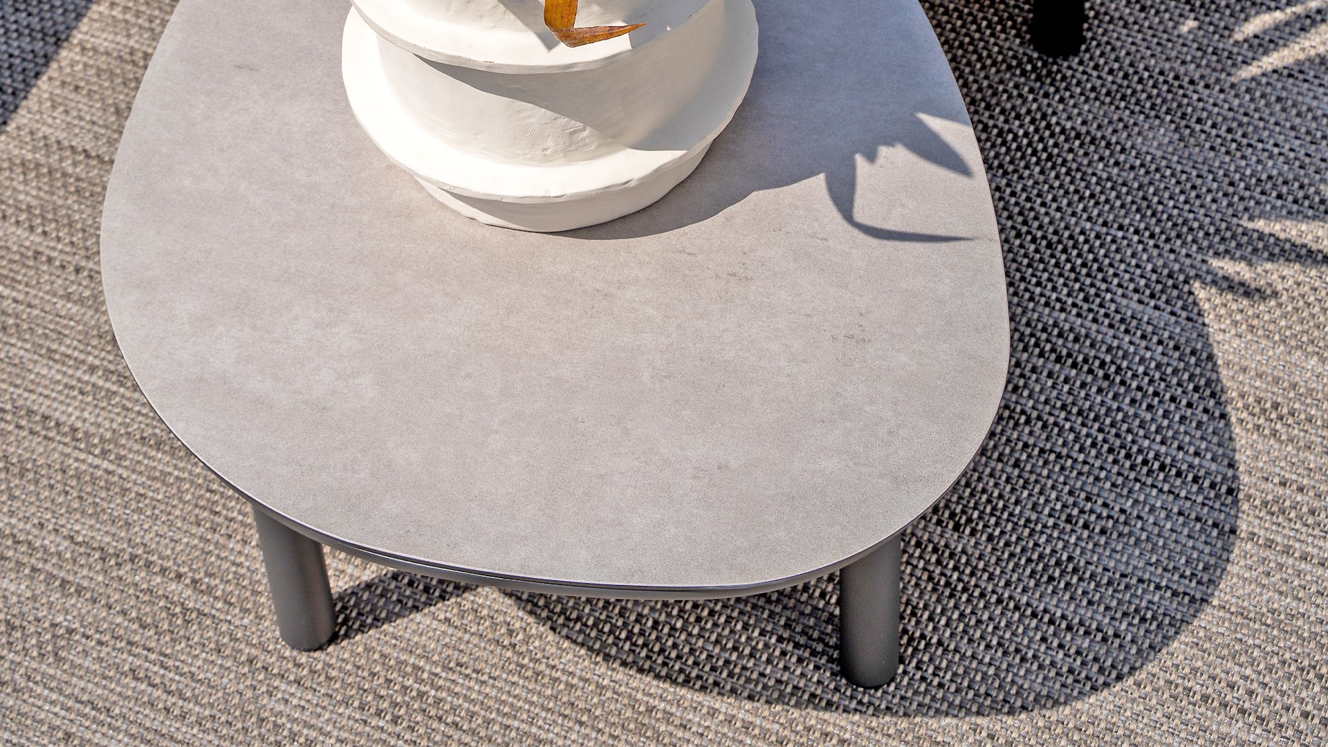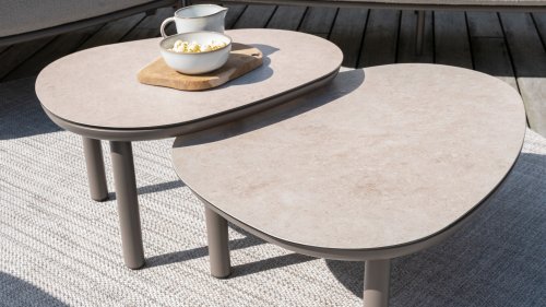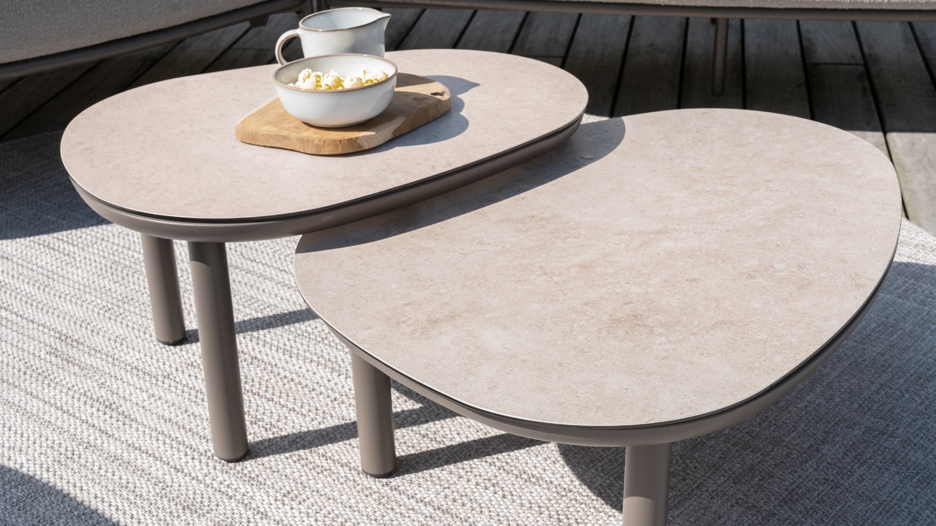 Verleihen Sie Ihrem Wohnraum einen Hauch von Eleganz und Raffinesse mit der Couchtischserie Monroe von Taste by 4 Seasons Outdoor. Dieses wunderschöne Set besteht aus zwei organisch geformten Tischen mit kieselsteinförmigen Tischplatten – verspielt und doch perfekt ausbalanciert. Dank seines unverwechselbaren Designs wird der Monroe zum stilvollen Blickfang in jedem Innen- und Außenbereich. Die Tischplatten bestehen aus bedruckter Keramik auf Glas und sorgen für eine luxuriöse Optik und eine langlebige, pflegeleichte Oberfläche. Der pulverbeschichtete Aluminiumfuß sorgt für eine stabile Basis und einen modernen, luftigen Look. Das Set ist in zwei Größen erhältlich – Ø65xH32cm und Ø80xH27cm – und lässt sich perfekt kombinieren oder einzeln zu einem dynamischen Ensemble kombinieren. Erhältlich in drei stilvollen Farben – Terre, Latte und Anthrazit – lässt sich der Monroe mühelos in Ihr Interieur oder Ihren Garten integrieren. Möchten Sie die Florence Lounge-Garnitur selbst sehen und ihren Komfort erleben? Dann besuchen Sie unseren Ausstellungsraum! Entdecken Sie das einzigartige Seilmuster, fühlen Sie die luxuriösen Kissen und lassen Sie sich von unseren Gartenmöbelexperten beraten.