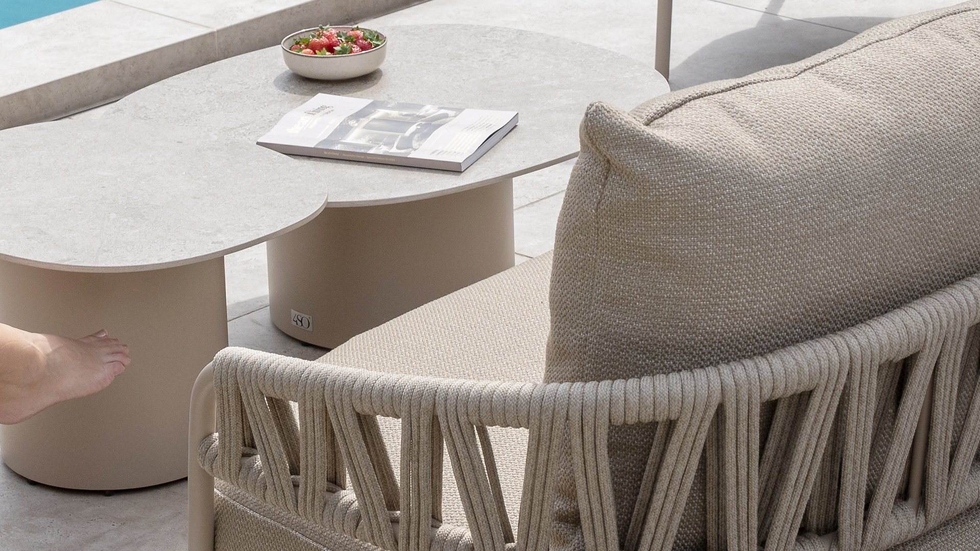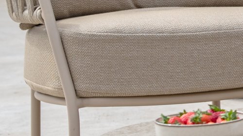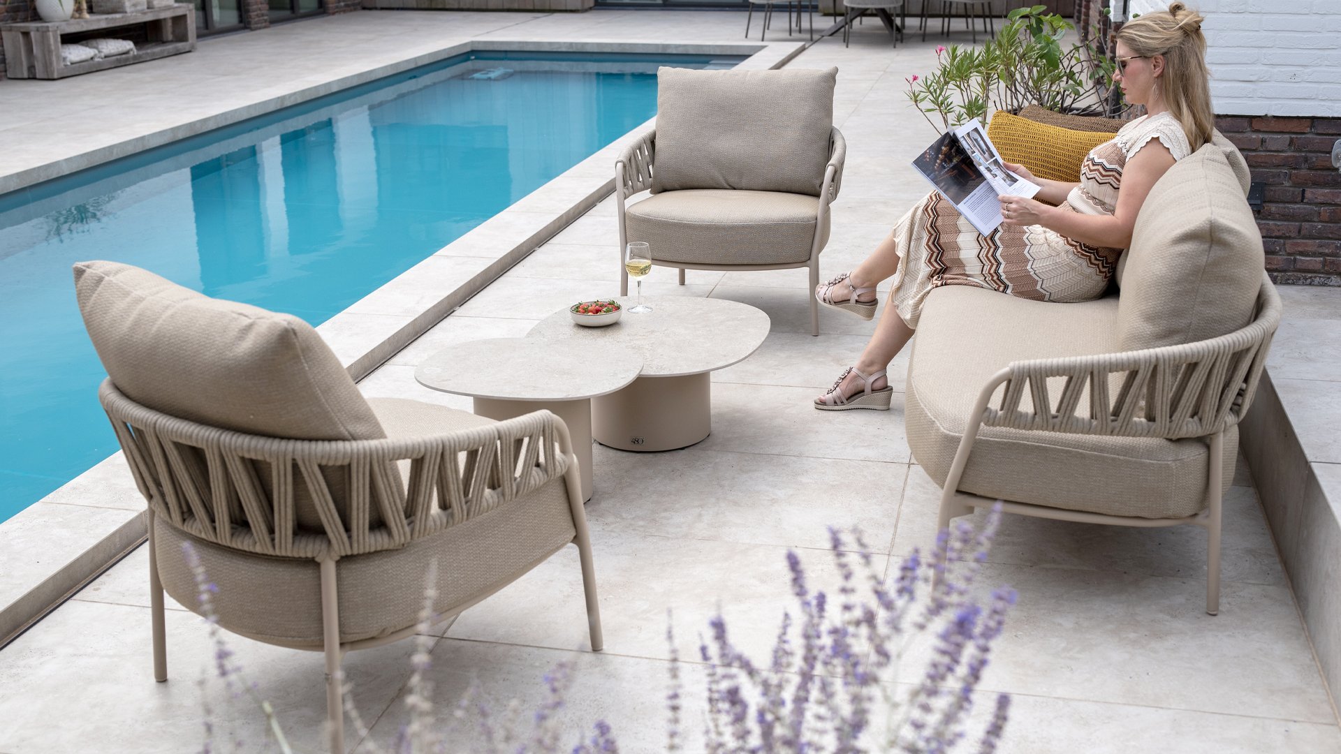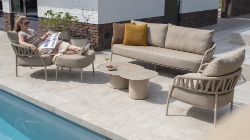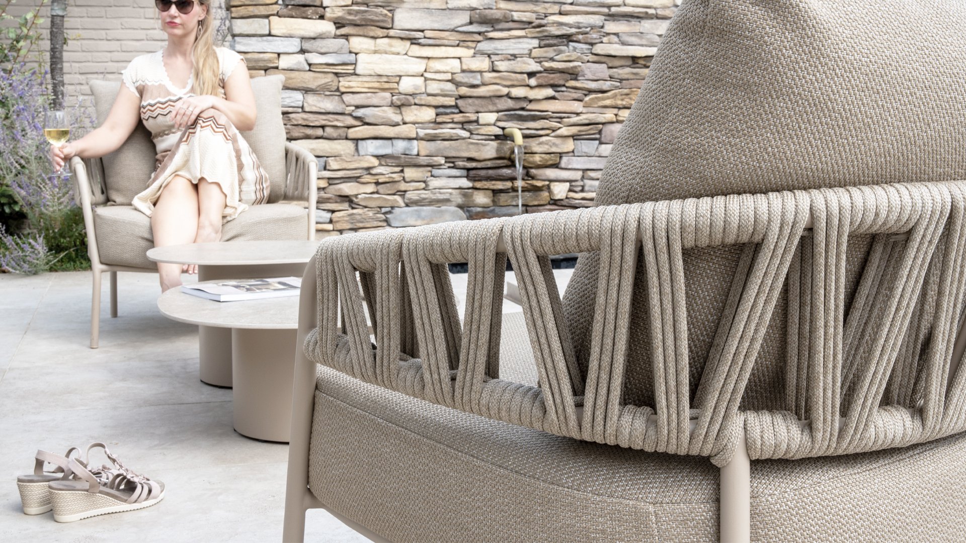 Calma Lounge-Set von Taste by 4 Seasons – Taupefarbenes Seil, lattefarbenes Gestell und höchster Sitzkomfort.