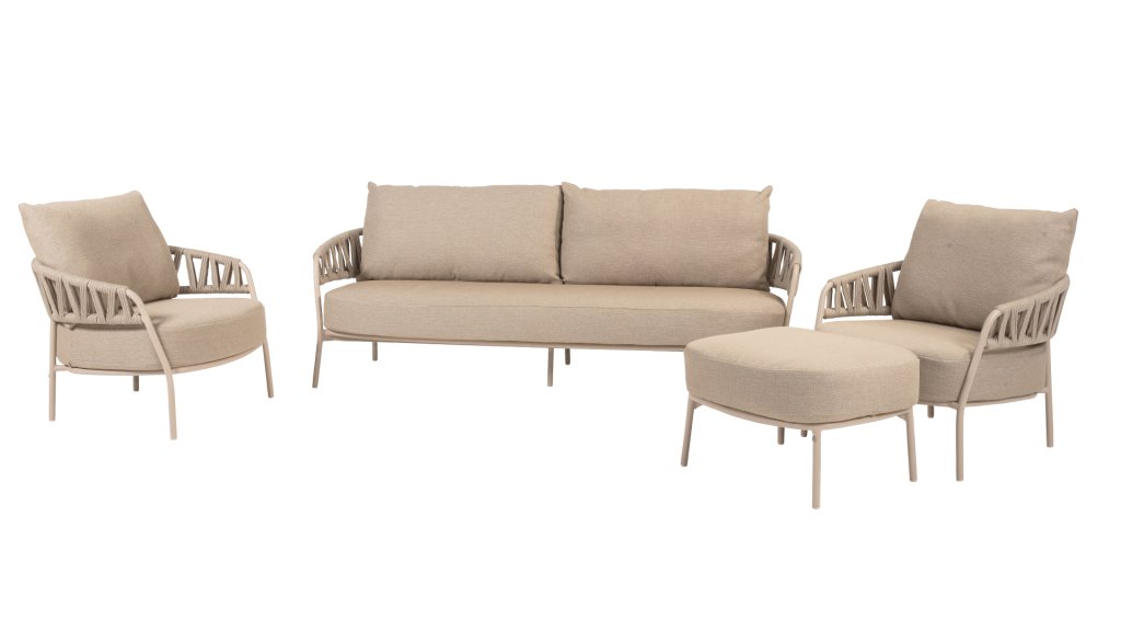 Mit dem Calma Lounge-Set vereinen Sie Stil, Komfort und Langlebigkeit. Taupefarbenes Seil und ein Latte-farbenes Gestell ergeben eine ruhige, natürliche Farbkombination, die perfekt zum Namen Calma passt. Schaffen Sie sich Ihre eigene Outdoor-Oase und genießen Sie jeden Moment in höchstem Komfort.