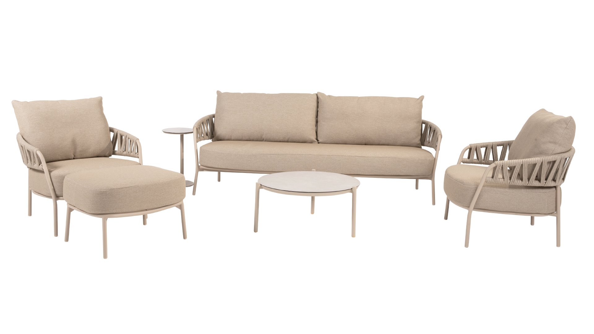 Mit dem Calma Lounge-Set vereinen Sie Stil, Komfort und Langlebigkeit. Taupefarbenes Seil und ein Latte-farbenes Gestell ergeben eine ruhige, natürliche Farbkombination, die perfekt zum Namen Calma passt. Schaffen Sie sich Ihre eigene Outdoor-Oase und genießen Sie jeden Moment in höchstem Komfort.