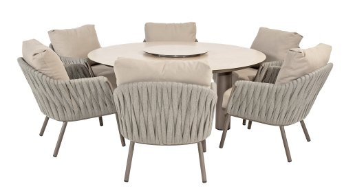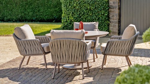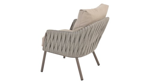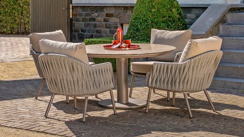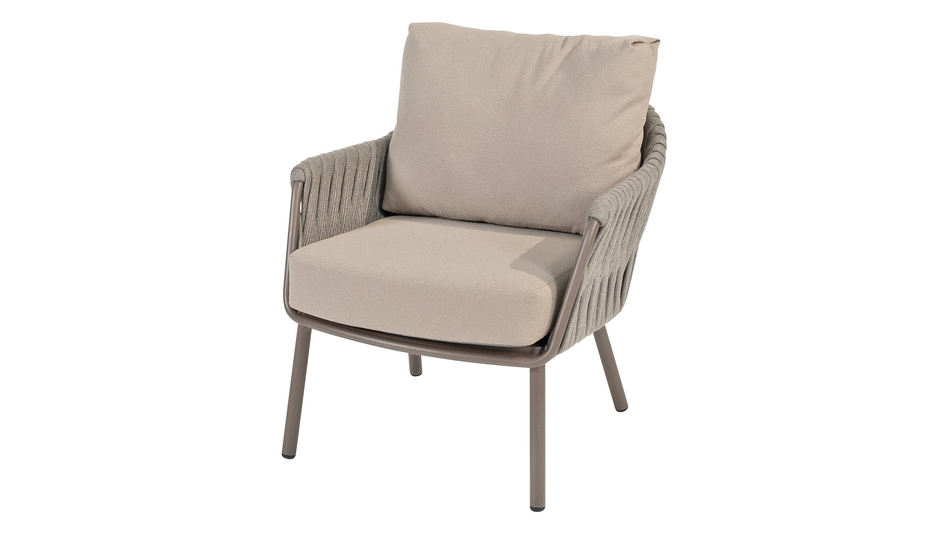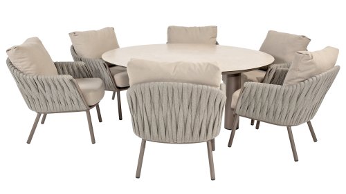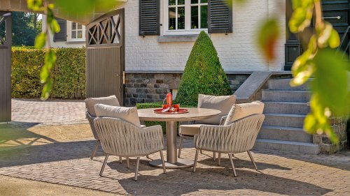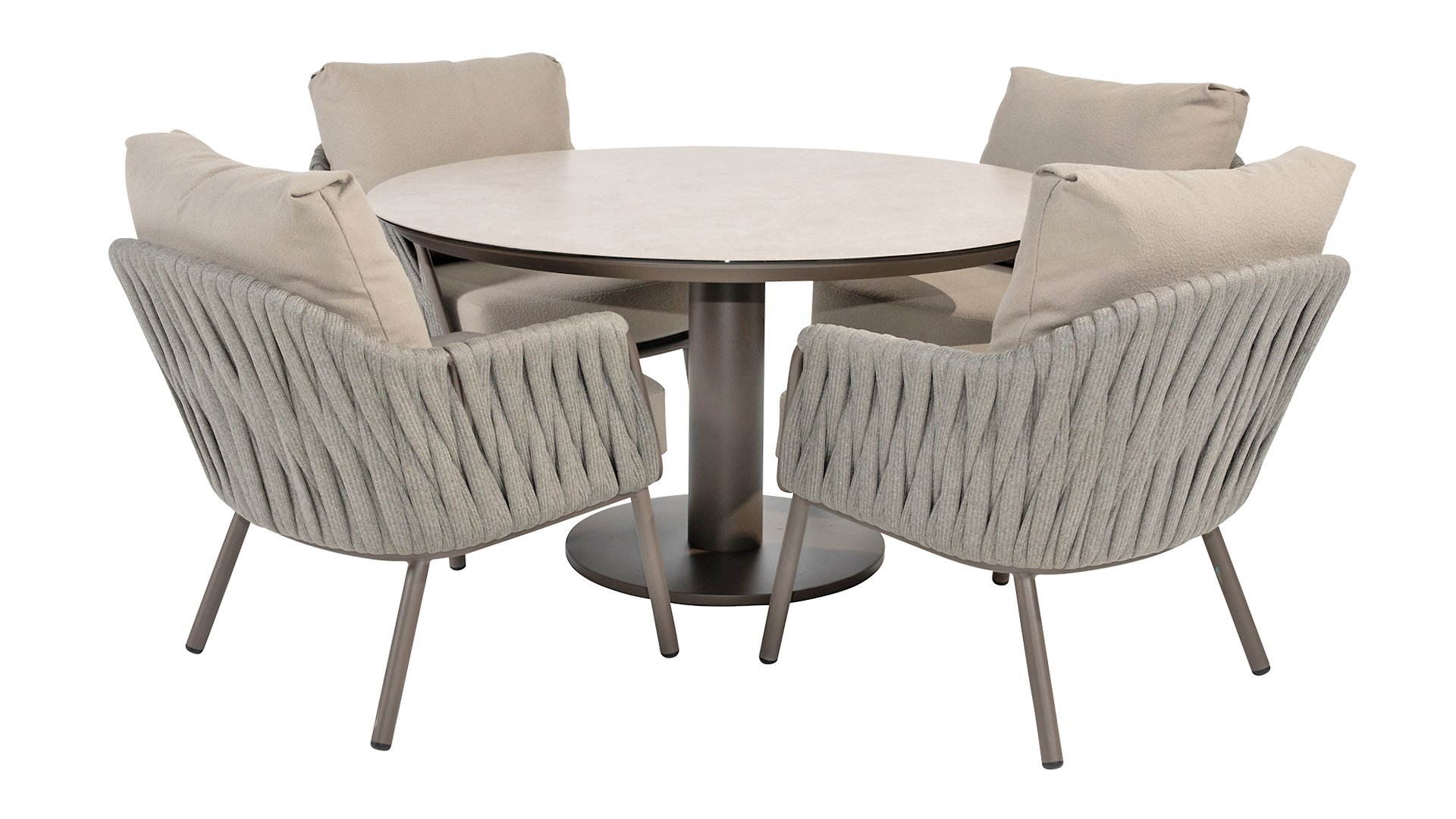 Taste by 4 Seasons Outdoor Cannes Low Dining Set – Komfortabel & Stilvoll: Das Taste Cannes Low Dining Set vereint Luxus mit entspanntem Outdoor-Wohnkomfort. Dieses Set ist lässig, ungezwungen und außergewöhnlich bequem. Im Gegensatz zu herkömmlichen Essgruppen ist ein Low Dining Set niedriger, sodass Sie in einer angenehmen Lounge-Höhe speisen und eine gemütliche, entspannte Atmosphäre genießen können. Perfekt für lange Abende im Freien, ungezwungene Abendessen oder Drinks mit Freunden und Familie. Das erdfarbene, pulverbeschichtete Aluminiumgestell bildet einen eleganten Kontrast zum fein gewebten, hellgrauen Seil und verleiht dem Set einen modernen und einladenden Look. Die großzügigen Olefin-Kissen in sanftem Grau bieten nicht nur höchsten Komfort, sondern sind auch äußerst widerstandsfähig gegen UV-Strahlung und Witterungseinflüsse.
