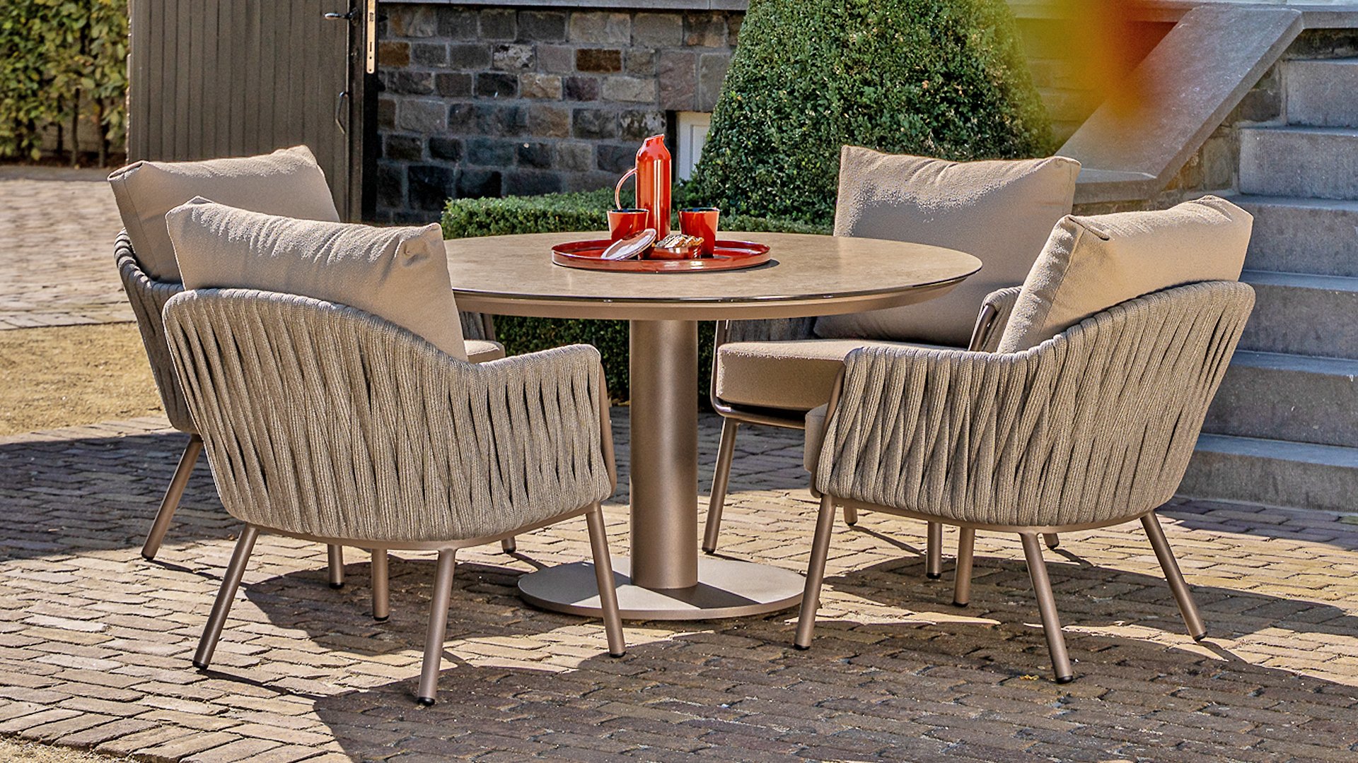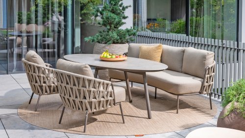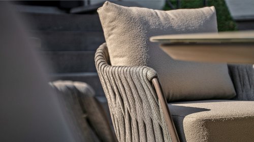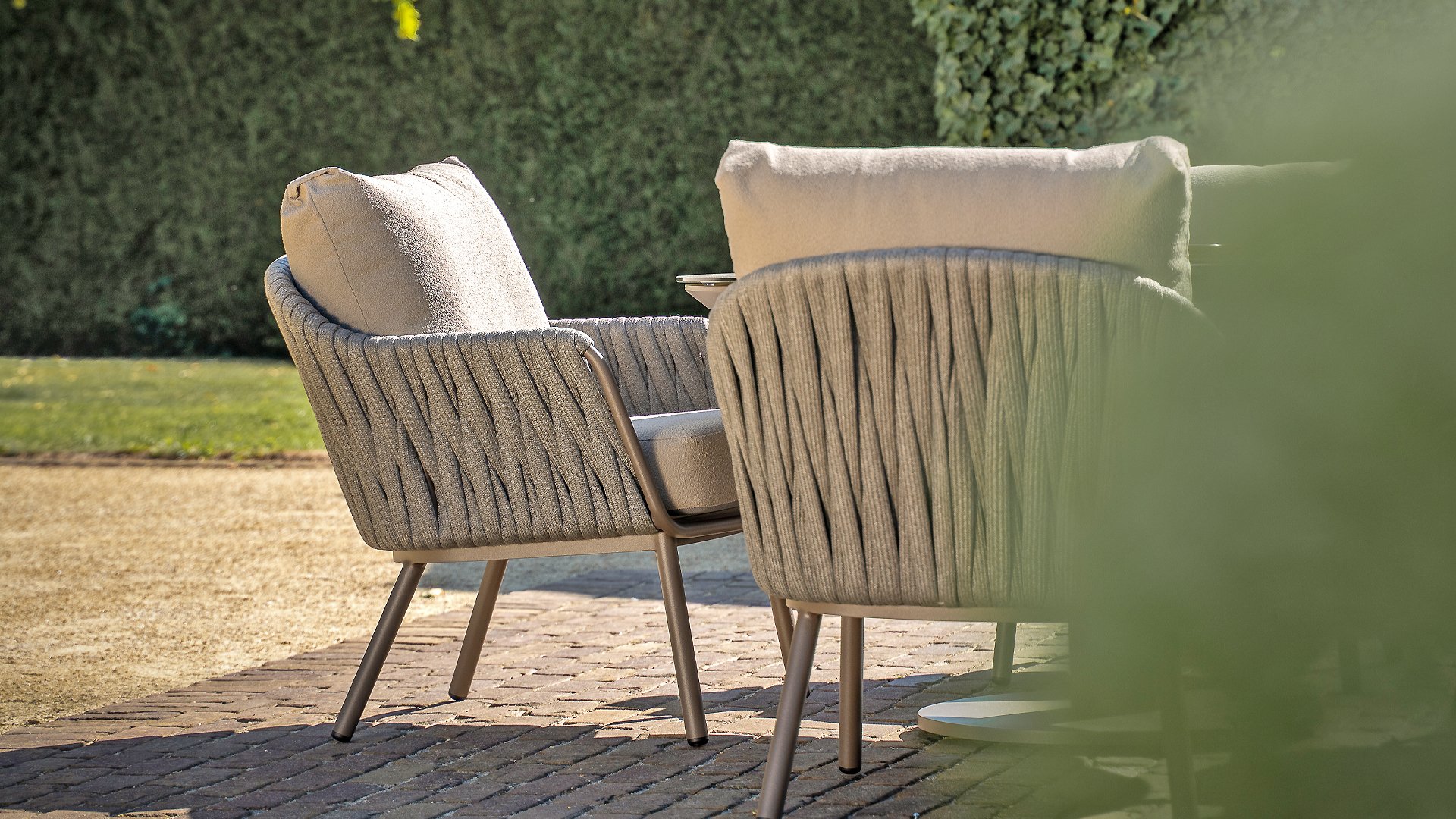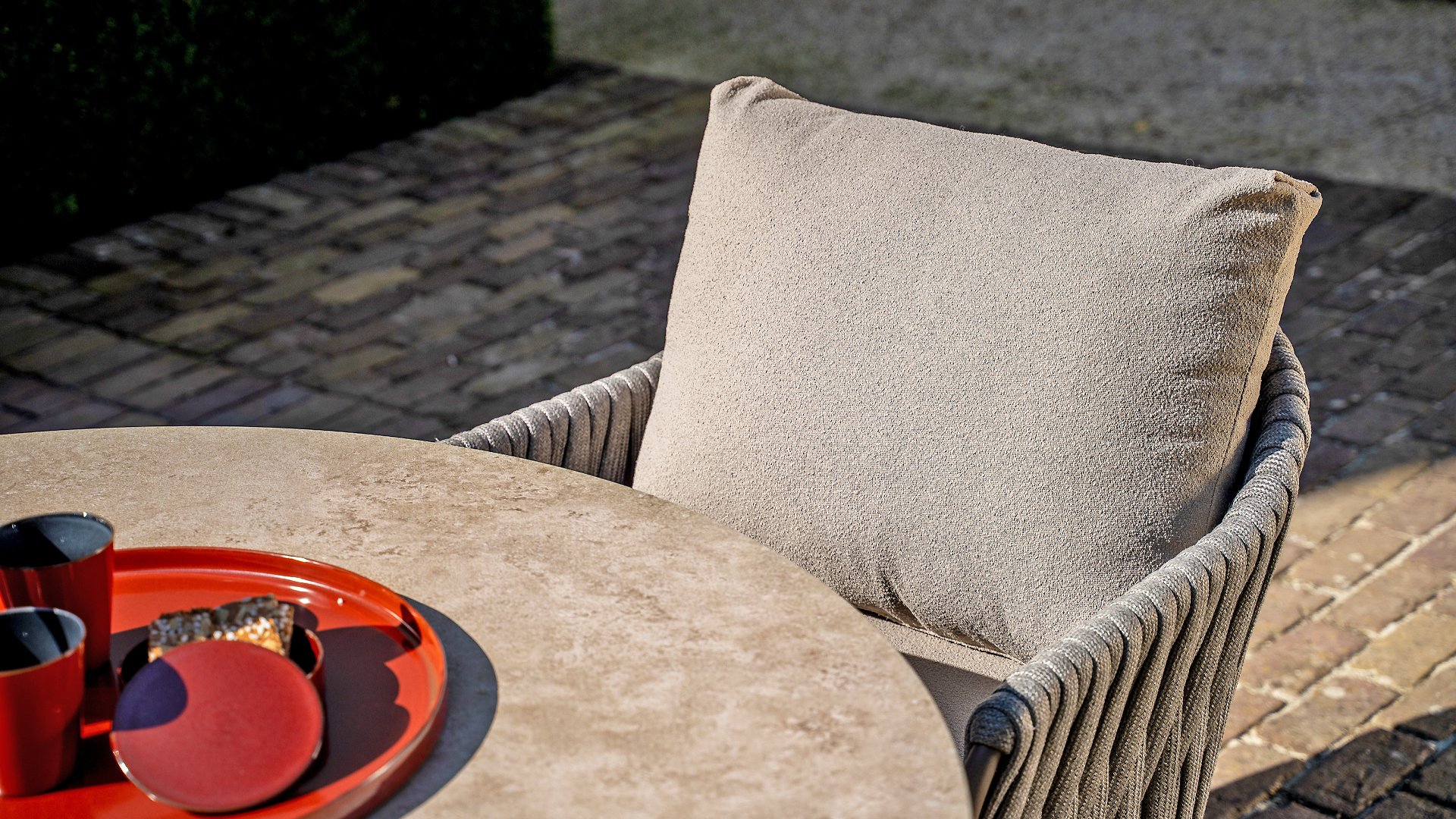 Das niedrige Gestell mit seinem weichen Seilgeflecht sorgt für einen entspannten, modernen Look, der perfekt zu einem gemütlichen Esserlebnis im Lounge-Stil passt. - Langlebig und wetterfest