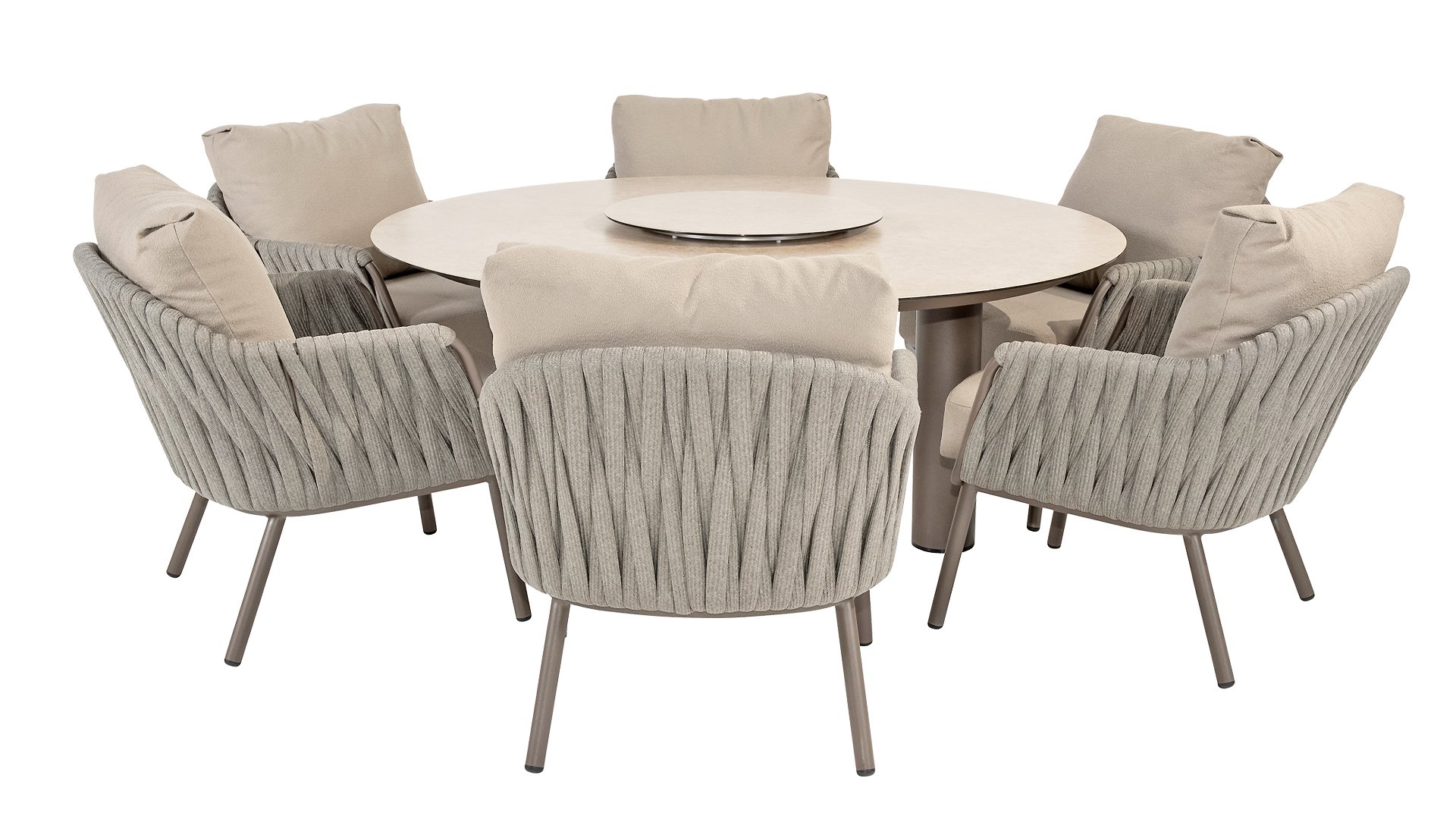 Das Taste Cannes Low Dining-Set vereint Luxus mit entspanntem Outdoor-Wohnkomfort. Es ist lässig, ungezwungen und außergewöhnlich bequem. Im Gegensatz zu herkömmlichen Essgruppen ist es niedriger, sodass Sie in einer angenehmen Lounge-Höhe speisen und eine gemütliche, entspannte Atmosphäre genießen können. Perfekt für lange Abende im Freien, ungezwungene Abendessen oder Drinks mit Freunden und Familie. Der erdfarbene, pulverbeschichtete Aluminiumrahmen bildet einen eleganten Kontrast zum fein gewebten, hellgrauen Seil und verleiht dem Set einen modernen und einladenden Look. Die großzügigen Olefin-Kissen in einem sanften Grau bieten nicht nur höchsten Komfort, sondern sind auch äußerst widerstandsfähig gegen UV-Strahlung und Witterungseinflüsse. Neben diesem Low Dining-Set ist die Taste 4Seasons Cannes Kollektion auch als Esstisch set, Loungeset und High Dining-Set erhältlich, sodass Sie Ihren Außenbereich mit demselben stilvollen Ambiente ausstatten können.