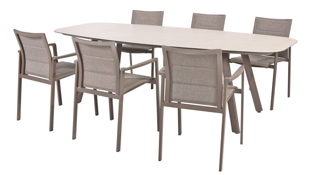 Verleihen Sie Ihrem Garten mit eleganten Linien und höchstem Komfort italienisches Flair. Der Taste by 4 Seasons Outdoor Cortina ist für alle, die Wert auf schlankes und funktionales Design legen. Das Gestell aus hochwertigem, pulverbeschichtetem Aluminium sorgt für ein modernes Aussehen und Langlebigkeit. Sitzfläche und Rückenlehne sind mit hochwertigem Olefin-Gewebe bezogen. Dieses Material fühlt sich überraschend weich an und bietet außergewöhnlichen Komfort, sodass Sie stundenlang ohne zusätzliche Kissen speisen können.