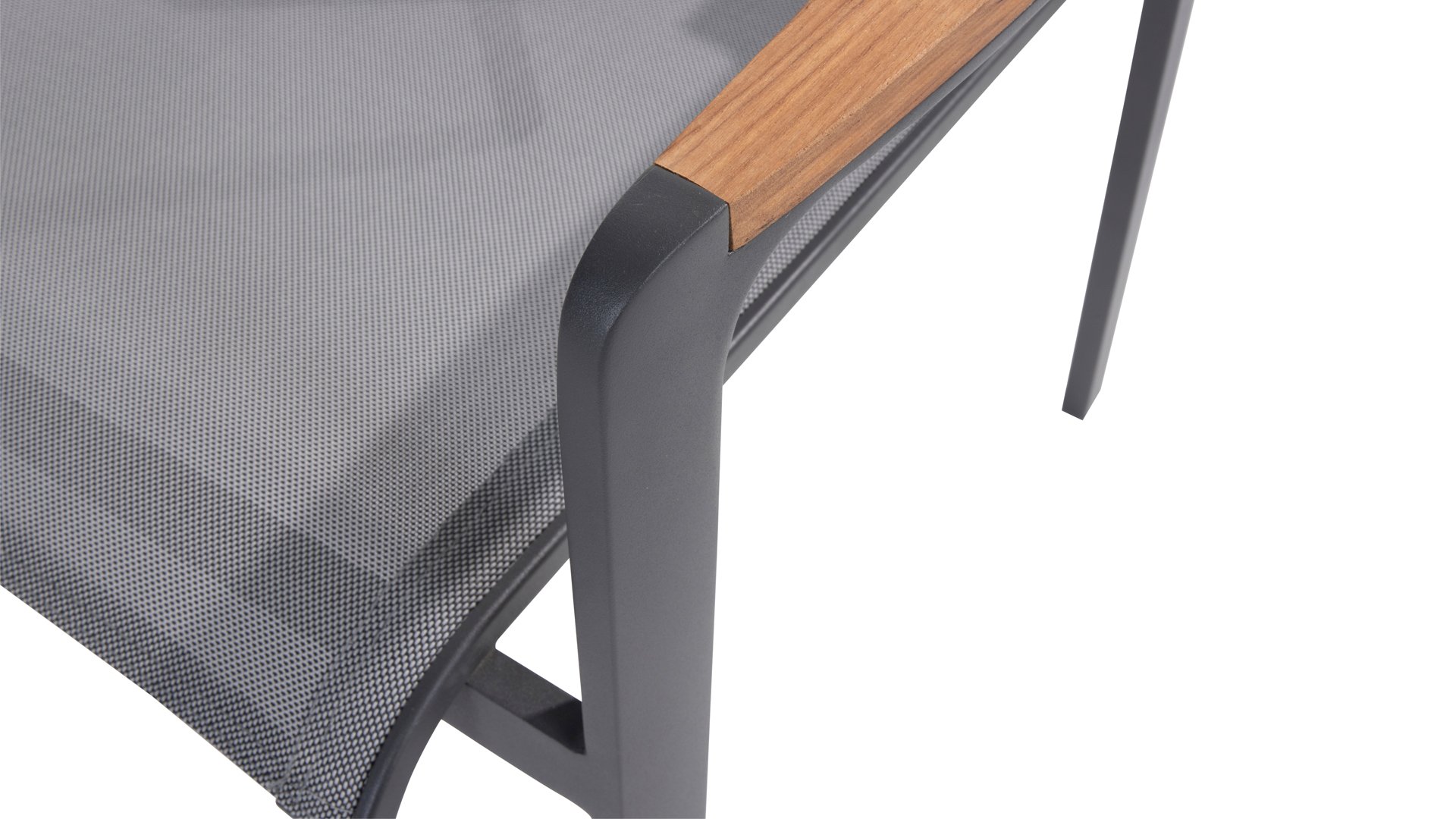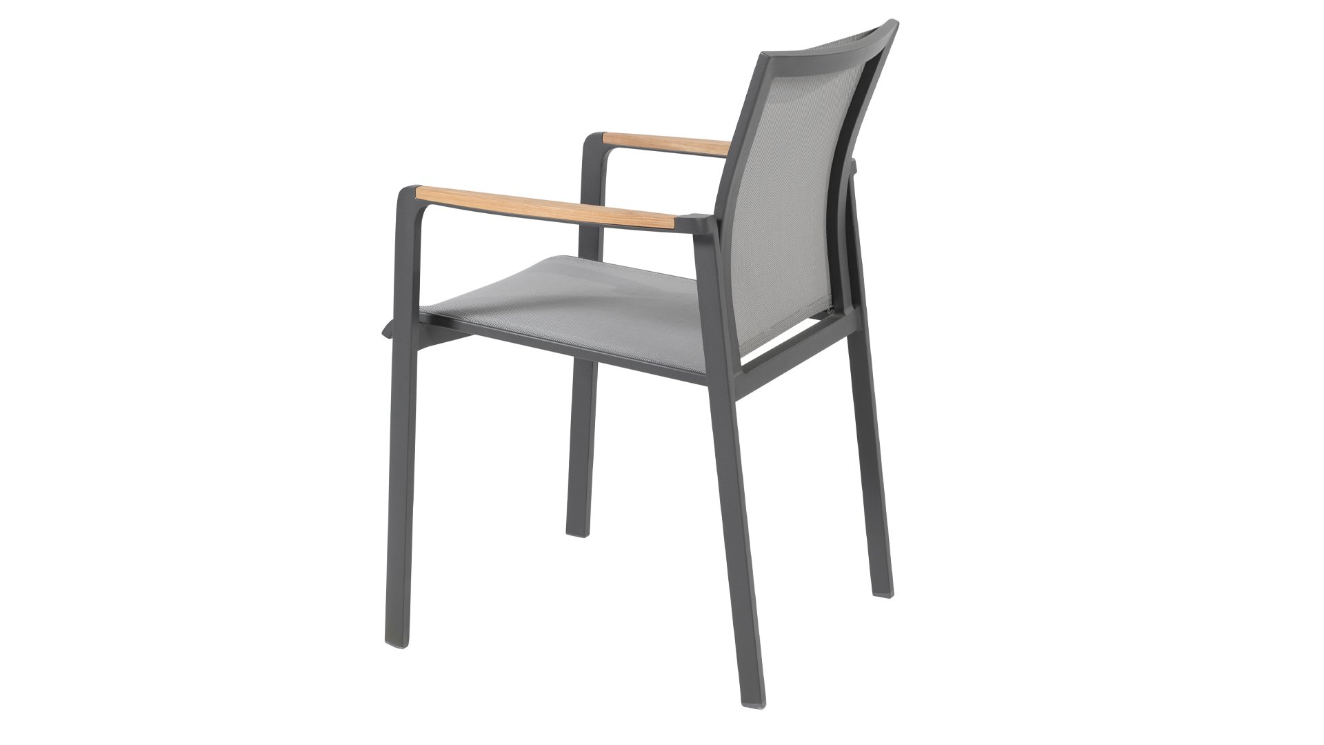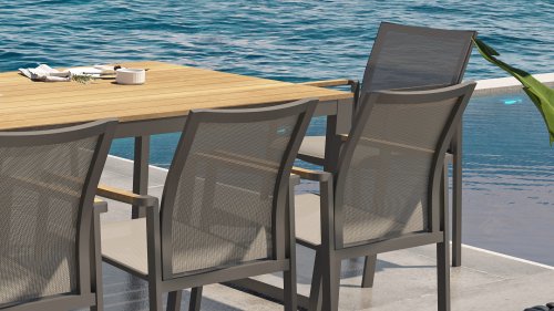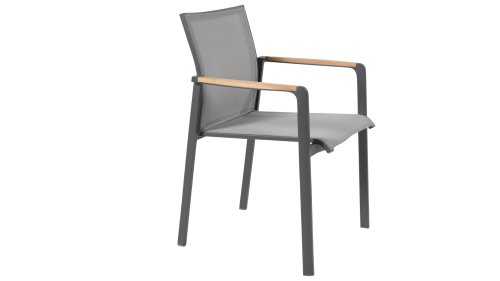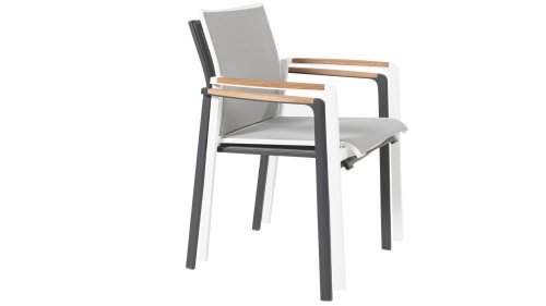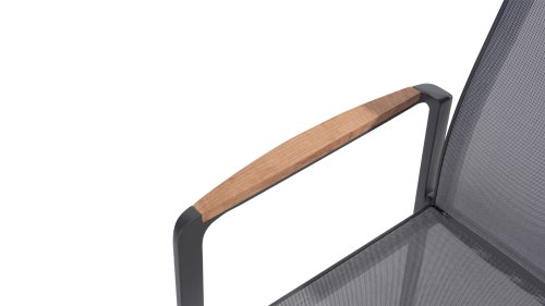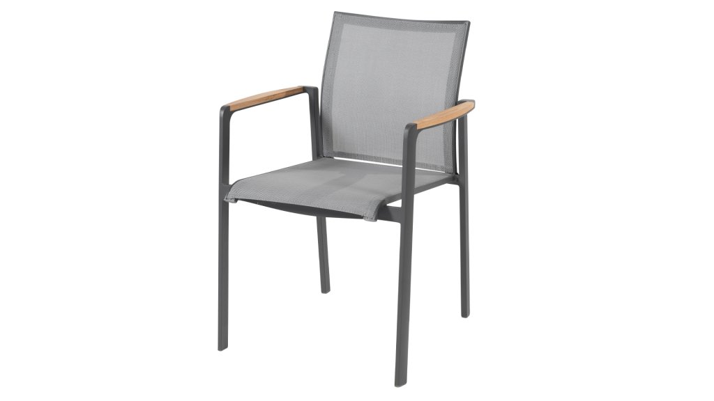 Subtile Rundungen. Die Feinheit liegt oft in den Details. So auch bei der Cortina-Serie. Die grundlegenden Formen des Esszimmerstuhls erhalten ihren Charakter durch die Verwendung von schön geformten Teakholzarmlehnen. Nehmen Sie Platz und genießen Sie. Das Textilene-Sitz- und Rückenteil ist so bequem, dass Sie auch ohne Kissen herrlich in diesem Stuhl sitzen. Dank des Sitzkomforts können Sie lange am Tisch sitzen und die Möbel, das Wetter und die Gesellschaft genießen. Der Cortina Stapelstuhl hat einen Aluminiumrahmen, sodass Sie die Stühle das ganze Jahr über im Freien stehen lassen können. Der Stuhl ist leicht und stapelbar, daher bei Bedarf leicht zu verstauen.
