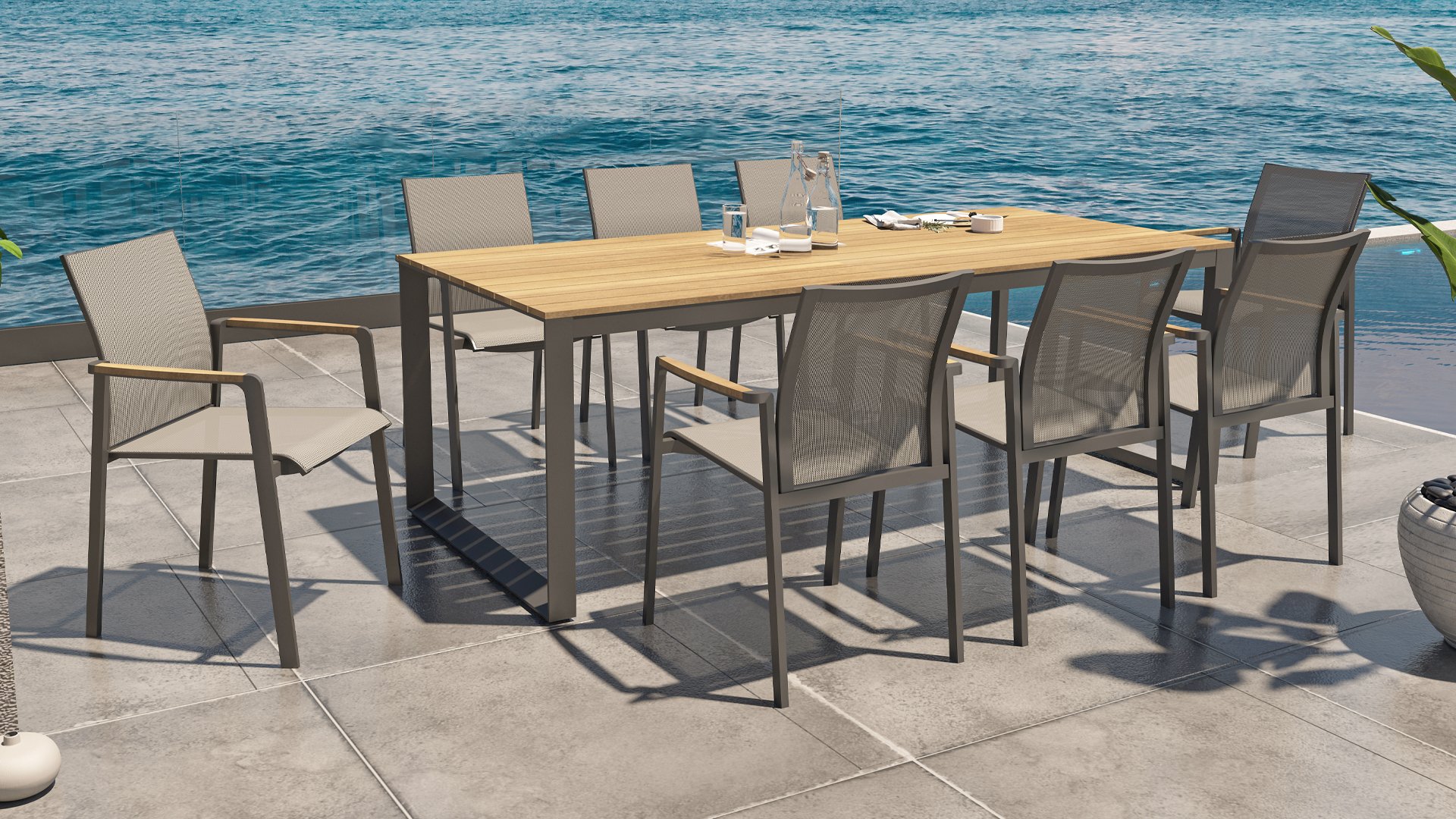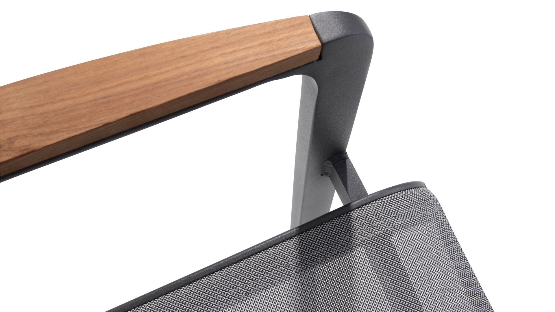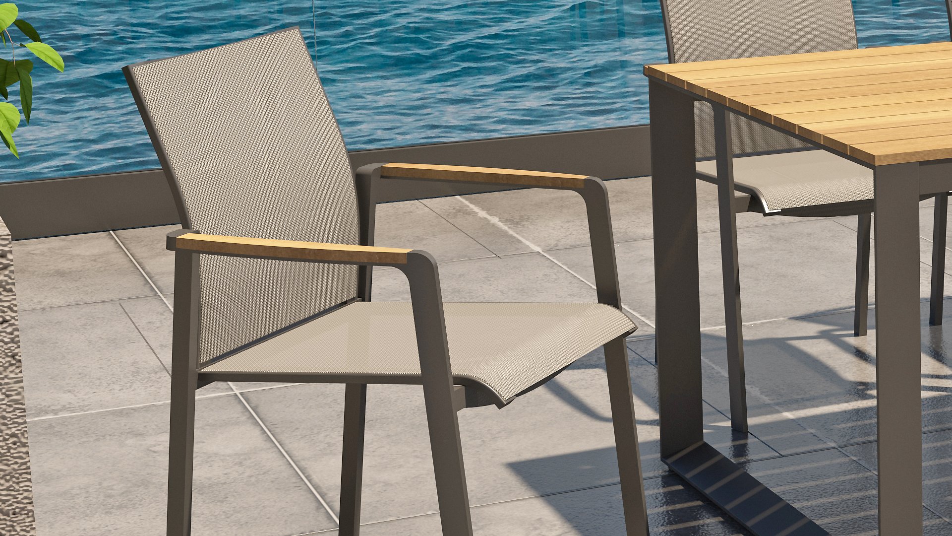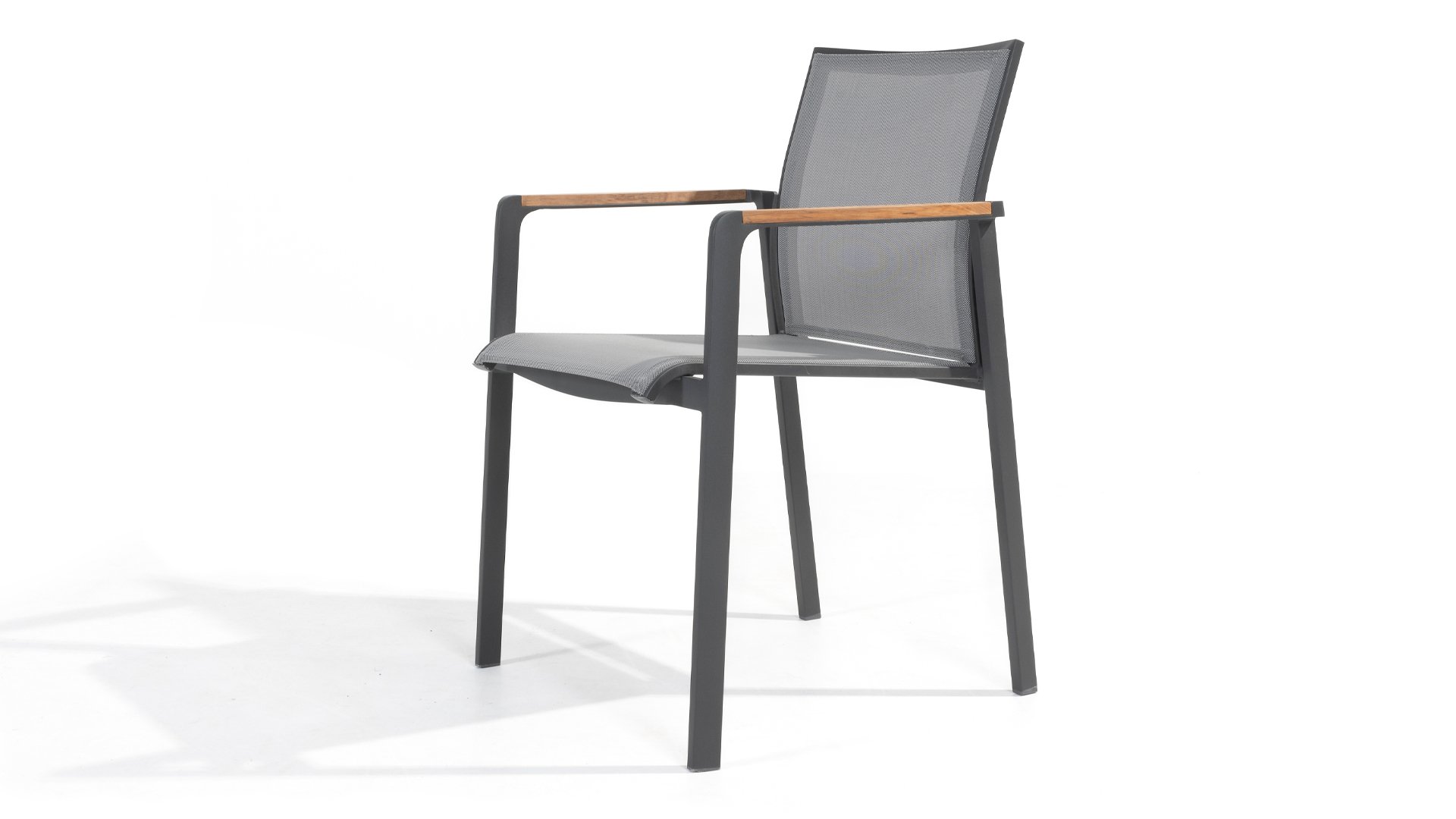 Subtile Rundungen. Die Feinheit liegt oft in den Details. So auch bei der Cortina-Serie. Die grundlegenden Formen des Esszimmerstuhls erhalten ihren Charakter durch die Verwendung von schön geformten Teakholzarmlehnen. Nehmen Sie Platz und genießen Sie. Das Textilene-Sitz- und Rückenteil ist so bequem, dass Sie auch ohne Kissen herrlich in diesem Stuhl sitzen. Dank des Sitzkomforts können Sie lange am Tisch sitzen und die Möbel, das Wetter und die Gesellschaft genießen. Der Cortina Stapelstuhl hat einen Aluminiumrahmen, sodass Sie die Stühle das ganze Jahr über im Freien stehen lassen können. Der Stuhl ist leicht und stapelbar, daher bei Bedarf leicht zu verstauen.