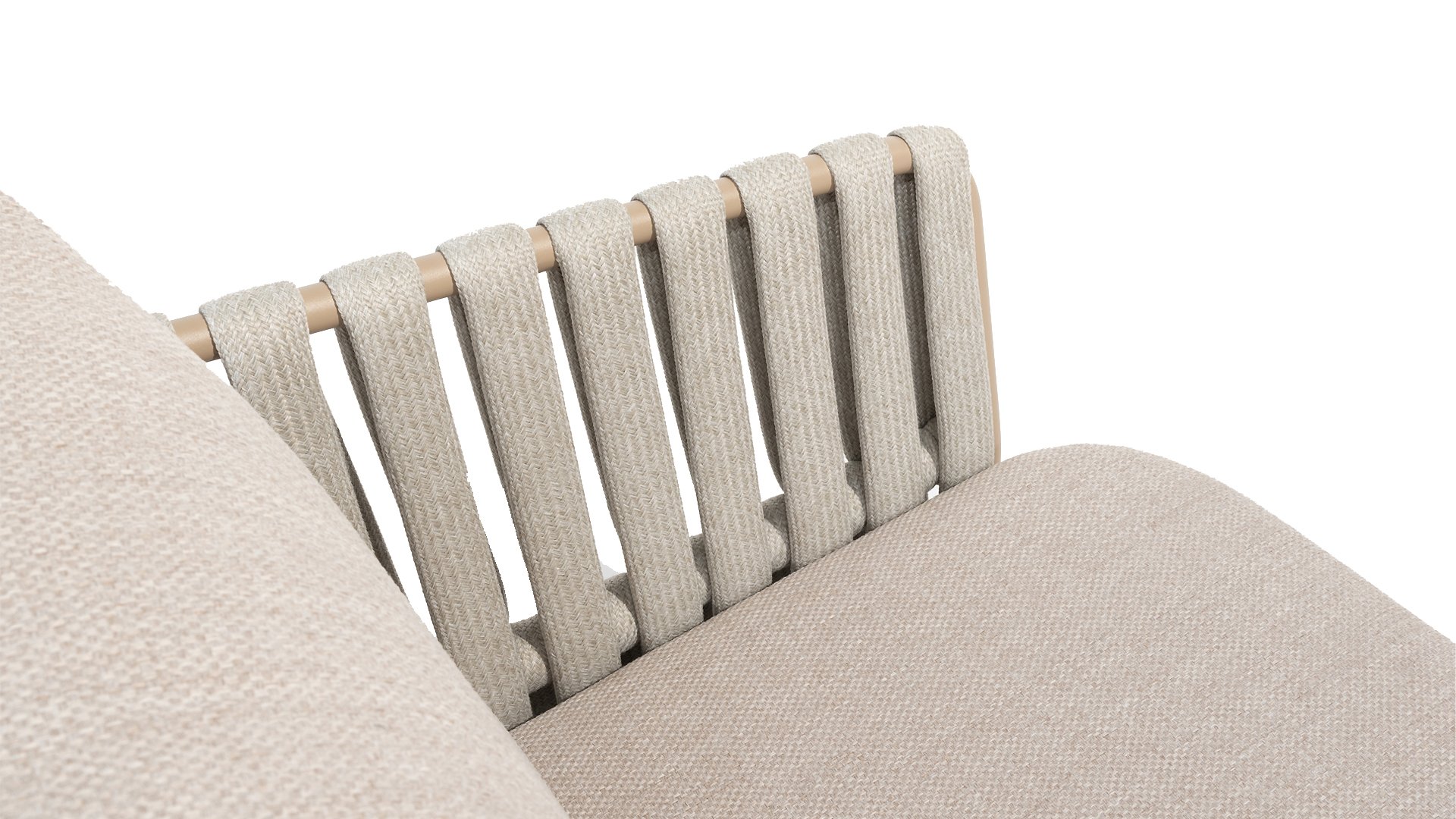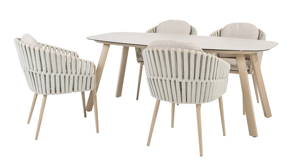 Leidenschaft für Eva Entworfen mit Liebe zum Detail. Die dickem, weichen Seilbänder folgen der schönen organischen Form des Rahmens. Dazu kommen die herrlich bequemen Kissen hinzu und du verstehst, warum wir so begeistert sind von der Taste by 4 Seasons Outdoor Eva Lounge- & Diningset. Der Taste 4SO Eva Dining Stuhl hat ein modernes Design. Der Stuhl wird mit weichen Kissen geliefert und verfügt über einen zeitgemäßen, Aluminium-Rahmen mit passender, latte Seilpolsterung. Das dicke Seil passt gut zum lattefarbenen Rahmen und sorgt zusammen mit den Kissen für einen bequemen Sitzkomfort. Eine Farbe, die am besten als geschmackvolles Beige beschrieben werden kann.