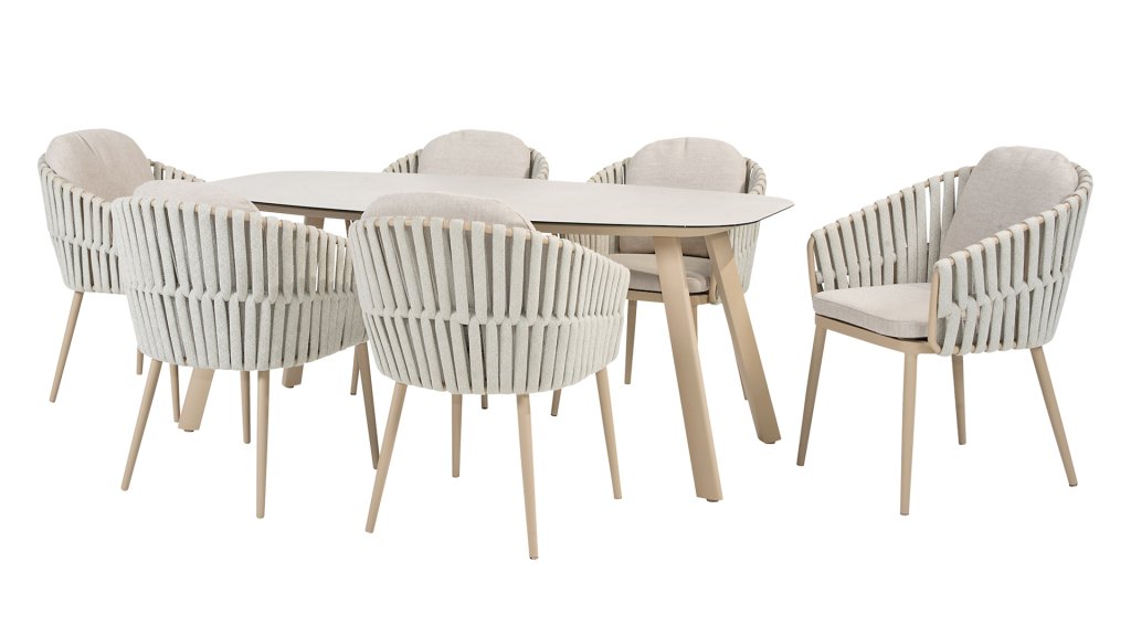 Leidenschaft für Eva Entworfen mit Liebe zum Detail. Die dickem, weichen Seilbänder folgen der schönen organischen Form des Rahmens. Dazu kommen die herrlich bequemen Kissen hinzu und du verstehst, warum wir so begeistert sind von der Taste by 4 Seasons Outdoor Eva Lounge- & Diningset. Der Taste 4SO Eva Dining Stuhl hat ein modernes Design. Der Stuhl wird mit weichen Kissen geliefert und verfügt über einen zeitgemäßen, Aluminium-Rahmen mit passender, latte Seilpolsterung. Das dicke Seil passt gut zum lattefarbenen Rahmen und sorgt zusammen mit den Kissen für einen bequemen Sitzkomfort. Eine Farbe, die am besten als geschmackvolles Beige beschrieben werden kann.