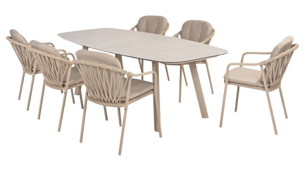 Suchen Sie einen pflegeleichten Tisch mit modernem Look? Dann sollten Sie den Taste by 4 Seasons Outdoor Manolo 240 cm in den Farben Anthrazit, Latte und Terre in Betracht ziehen. Die Form der Tischplatte und die Position der Aluminiumbeine machen diesen Tisch unglaublich praktisch. Diese Form schafft auf allen Seiten viel Platz. Das unverwechselbare Design des Tisches zeichnet sich durch eine dänische ovale Tischplatte aus glasbedruckter Keramik aus, sodass er das ganze Jahr über im Freien stehen kann. Kein Platz für einen 240 cm langen Tisch? Alternativ gibt es den Taste 4 Seasons Manolo 75cm oder 180cm; beide Größen sind in den Farben Latte, Anthrazit und Terre erhältlich.