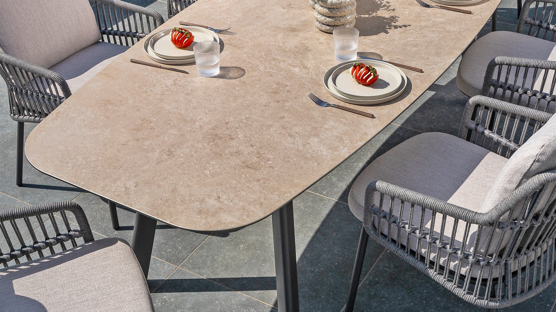 Suchen Sie einen pflegeleichten Tisch mit modernem Look? Dann ist der Taste by 4 Seasons Outdoor Manolo 180 cm genau das Richtige für Sie. Erhältlich in den Farben Anthrazit, Latte und Terre. Die Form der Tischplatte und die Position der Aluminiumbeine machen diesen Tisch unglaublich praktisch. Diese Form schafft großzügigen Platz an allen Seiten. Das markante Design des Tisches zeichnet sich durch eine dänische ovale Tischplatte aus glasbedruckter Keramik aus, sodass er das ganze Jahr über im Freien stehen kann. Der Manolo ist auch in den Größen 75x75x75cm und 240x103x75cm in drei Farben erhältlich.