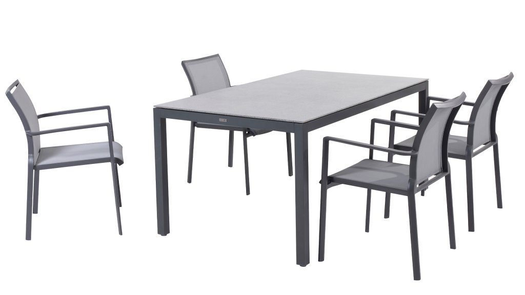 Ein moderner Tisch aus pflegeleichten Materialien. Die Größe von 160 cm ist für 4 bis 6 Stühle geeignet. Aufgrund seiner kompakten Größe kann dieser Tisch in vielen Räumen aufgestellt werden. Das praktische Untergestell sorgt dafür, dass man auch an den Enden dieses Tisches sitzen kann. Der Salerno-Tisch hat ein anthrazitfarbenes Aluminiumgestell mit einer schönen Tischplatte aus Keramik. Beide Materialien können Sie bedenkenlos das ganze Jahr über draußen lassen. Der Salerno Tisch von Taste 4SO lässt sich mit vielen Stühlen aus unserer Kollektion kombinieren.