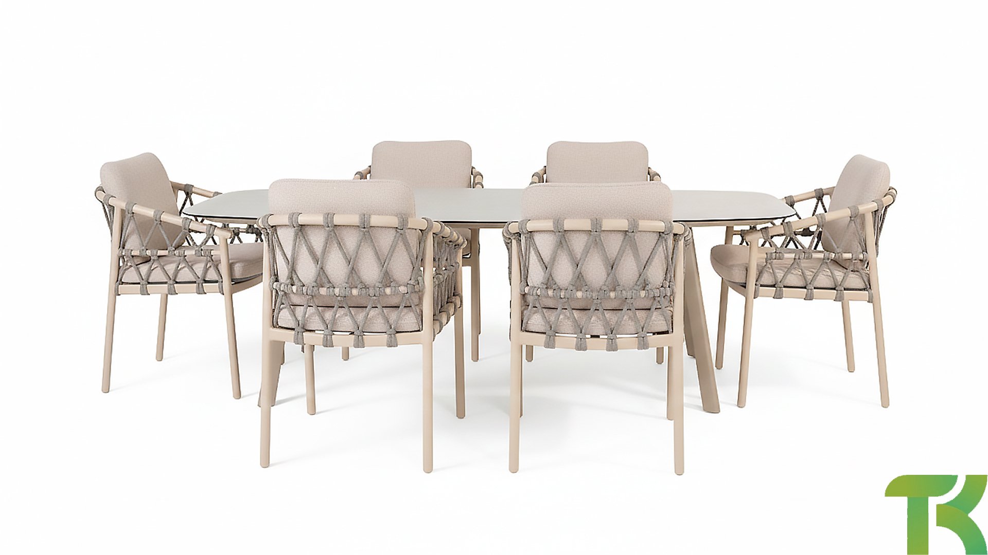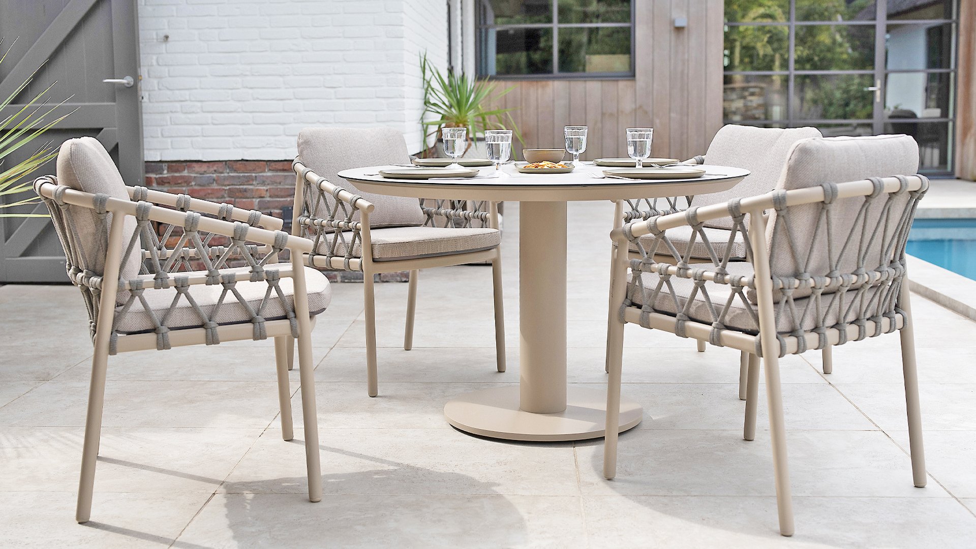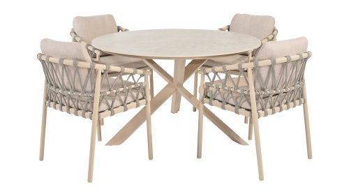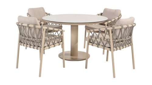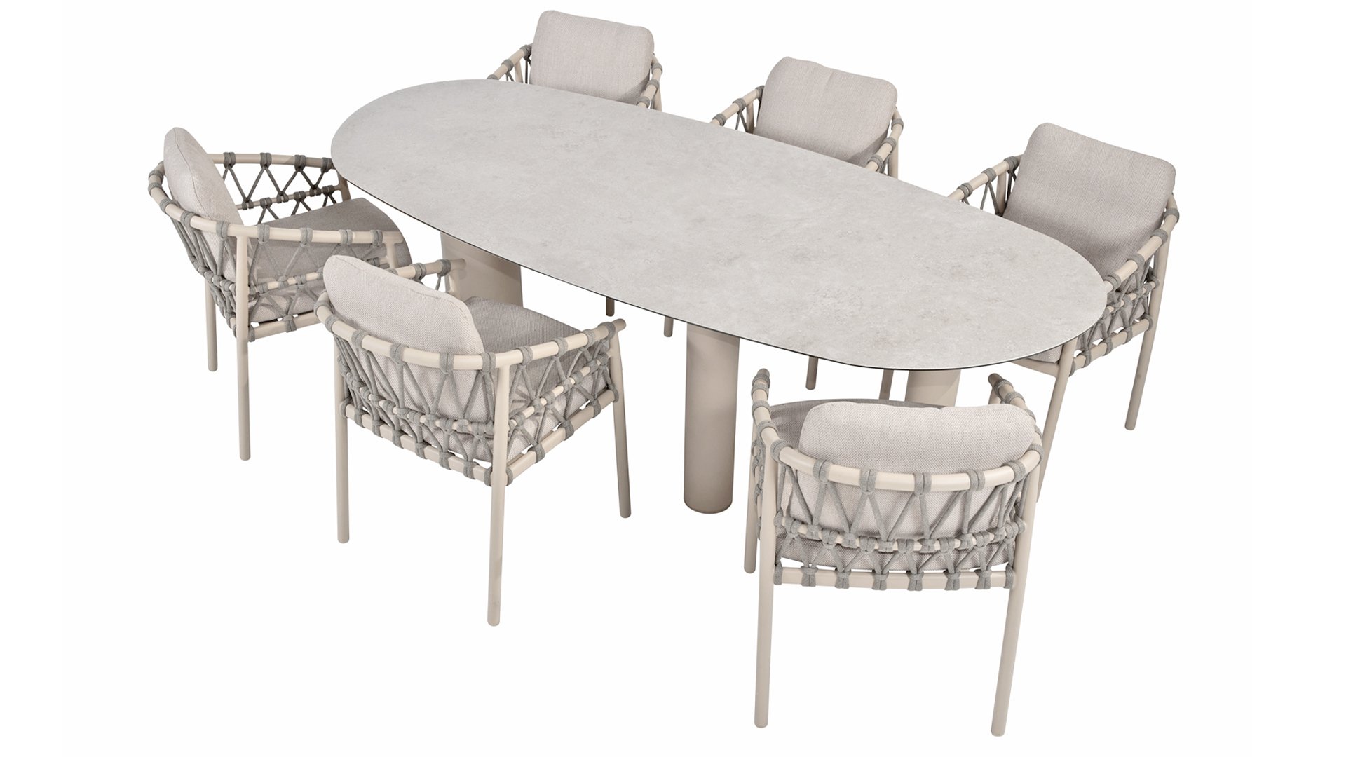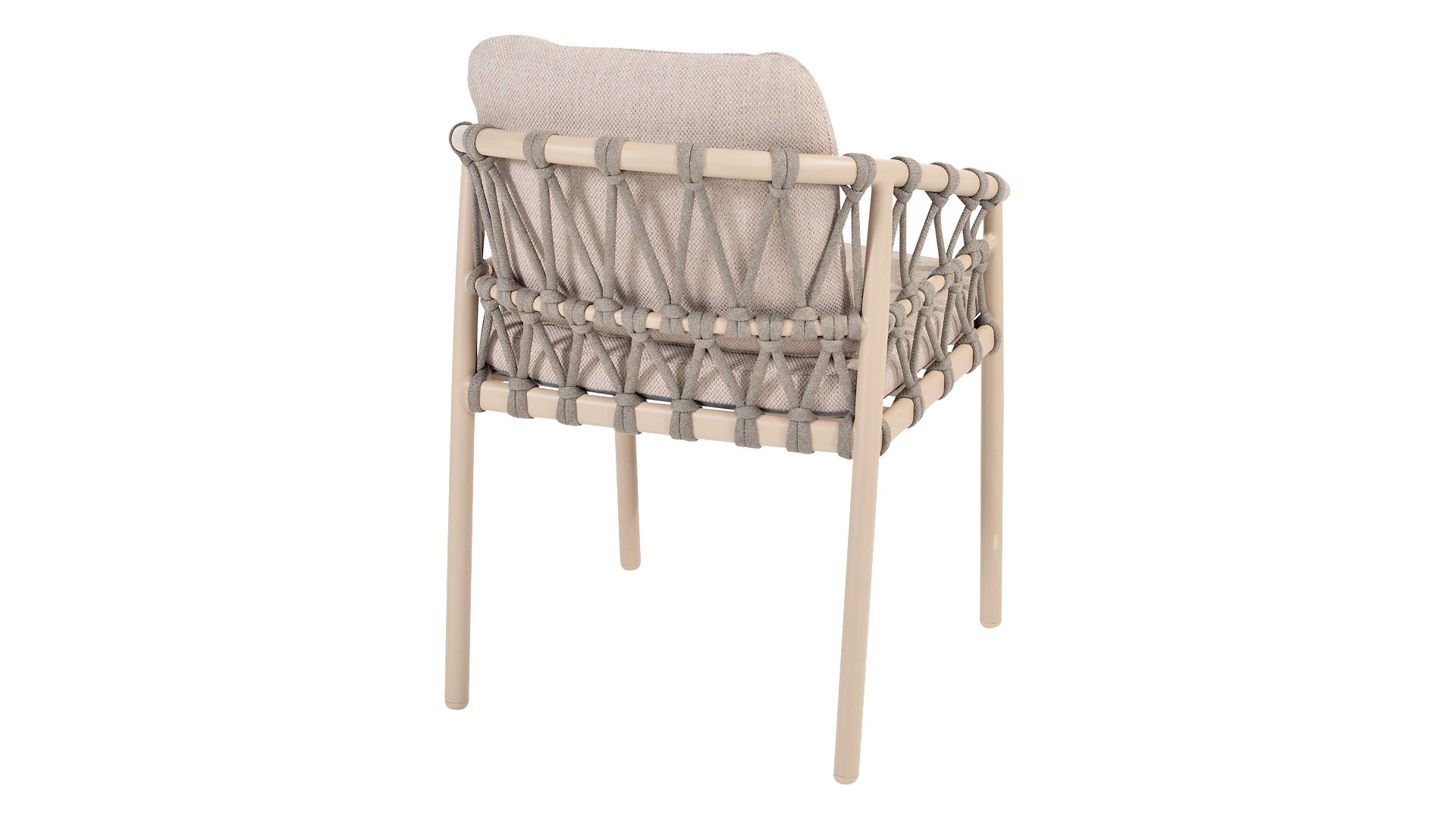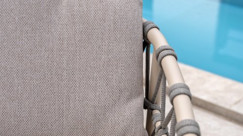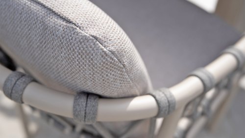 Das Besondere am Piacenza ist seine schöne, sanfte Farbe. Das pulverbeschichtete Aluminiumgestell ist in Latte gehalten. Dieser warme, sandige Farbton wirkt viel weicher und natürlicher als herkömmliches Weiß oder Anthrazit. Das Gestell ist mit edlem, grauem Seilgarn bezogen. Dieses Seil ist luftig gewebt und verleiht dem Sessel eine großzügige und verspielte Optik. Die bequeme Sitzfläche wird durch hellgraue Olefin-Kissen ergänzt. Dieser Stoff fühlt sich weich an wie ein Indoor-Stoff, ist aber wetterfest, windbeständig und UV-beständig.