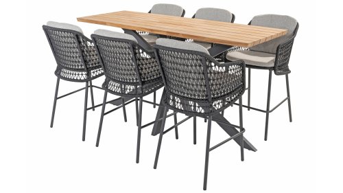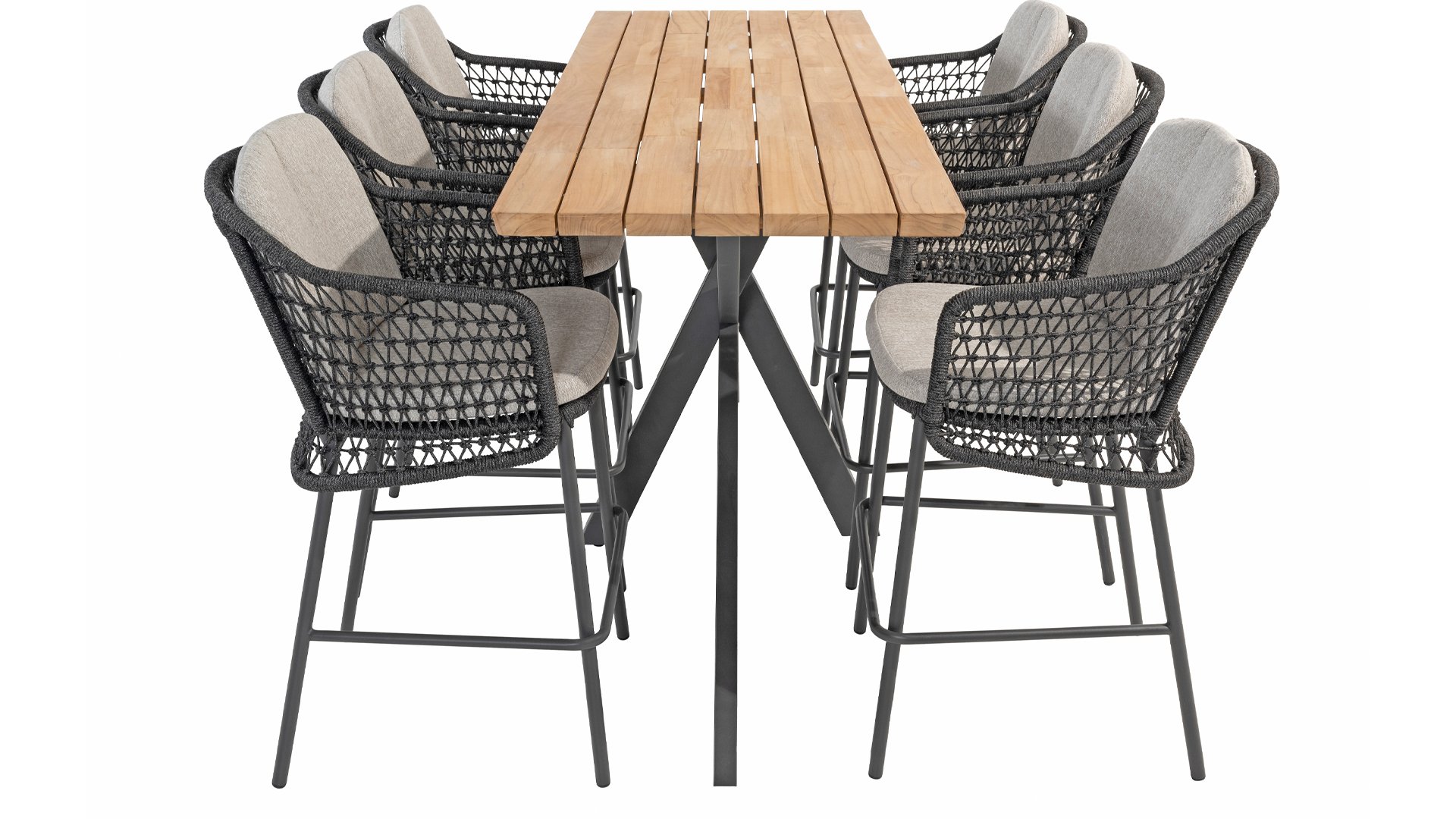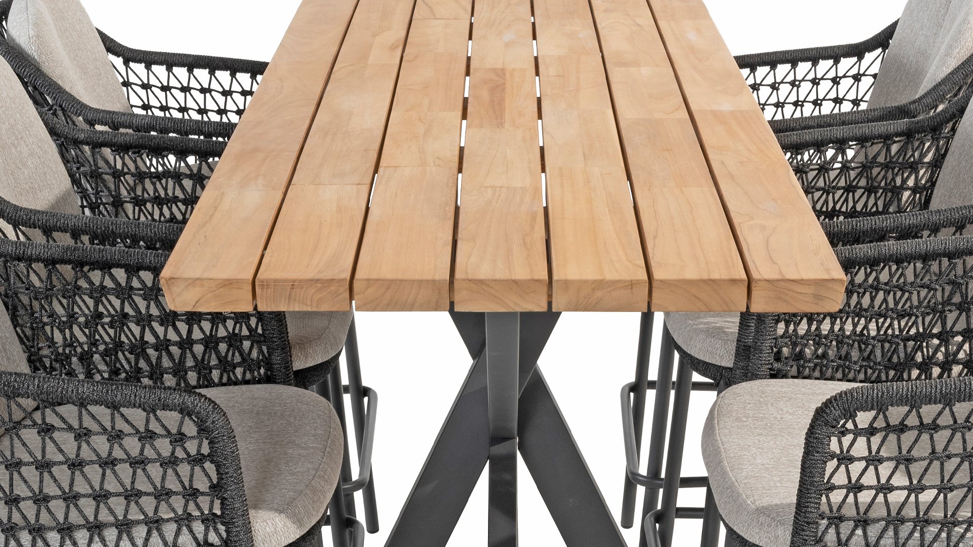 Ein High-Dining-Set steht für Gemütlichkeit. Der Taste 4SO Prado Teak Bartisch hat ein raffiniertes Design mit einem auffälligen pulverbeschichteten Edelstahlrahmen in der Farbe Anthrazit. Das klare Kreuzbeinuntergestell verleiht diesem Tisch ein zeitgemäßes und modernes Aussehen. Durch das praktische Kreuzbeinuntergestell stehen die Stühle frei am Tisch, ohne von einem Tischbein behindert zu werden. Der Prado Bartisch ist für sechs Personen geeignet. Er ist auch mit einem Latte-farbenen Untergestell erhältlich: Taste 4Seasons Prado Bartafel 200cm Latte.