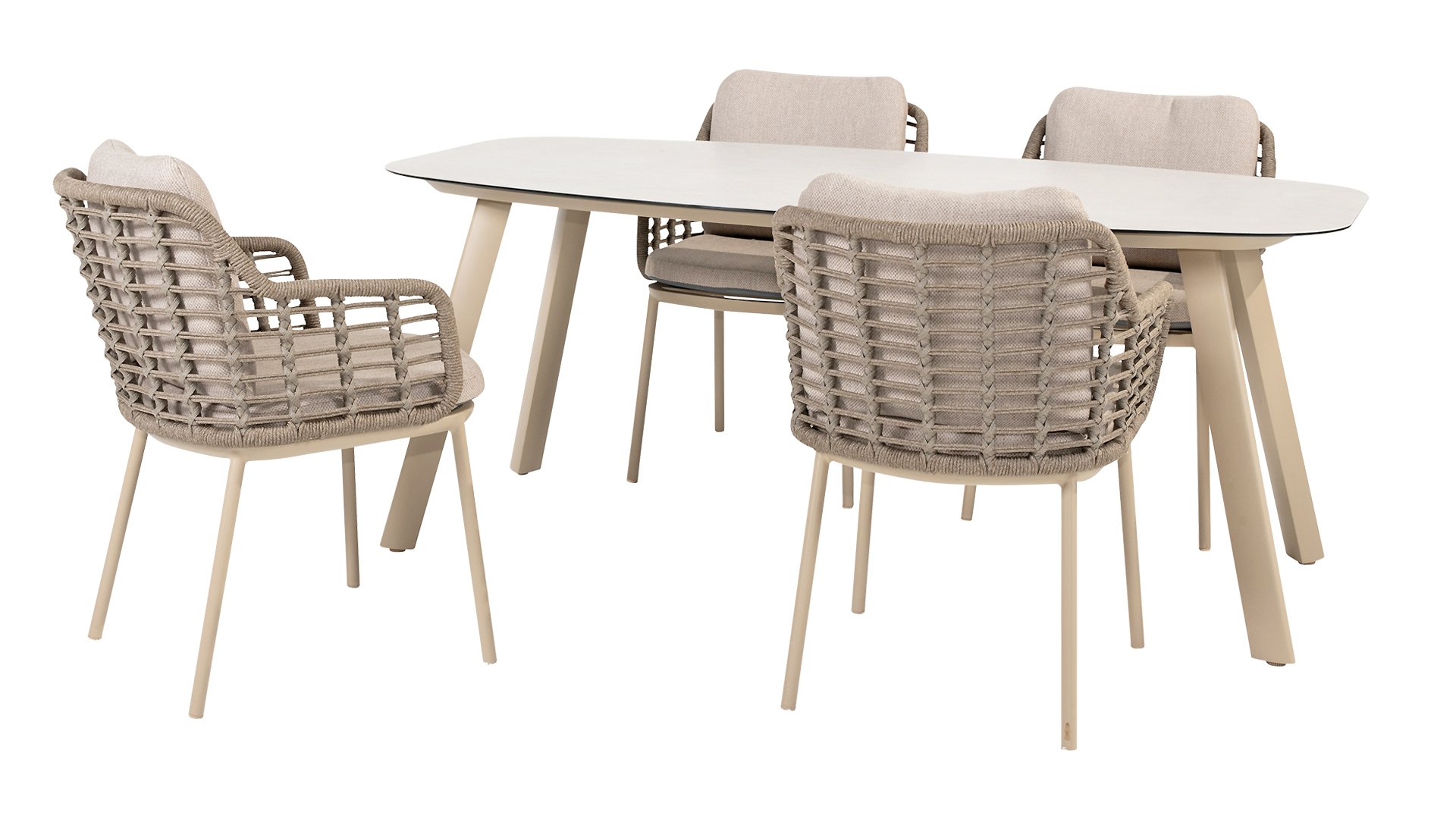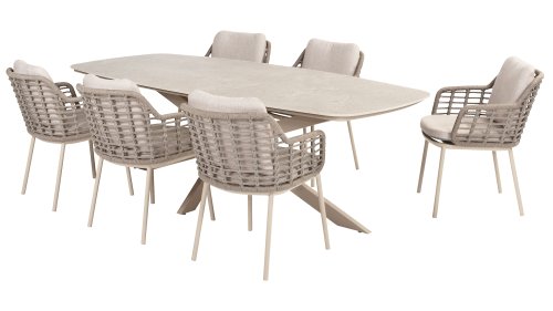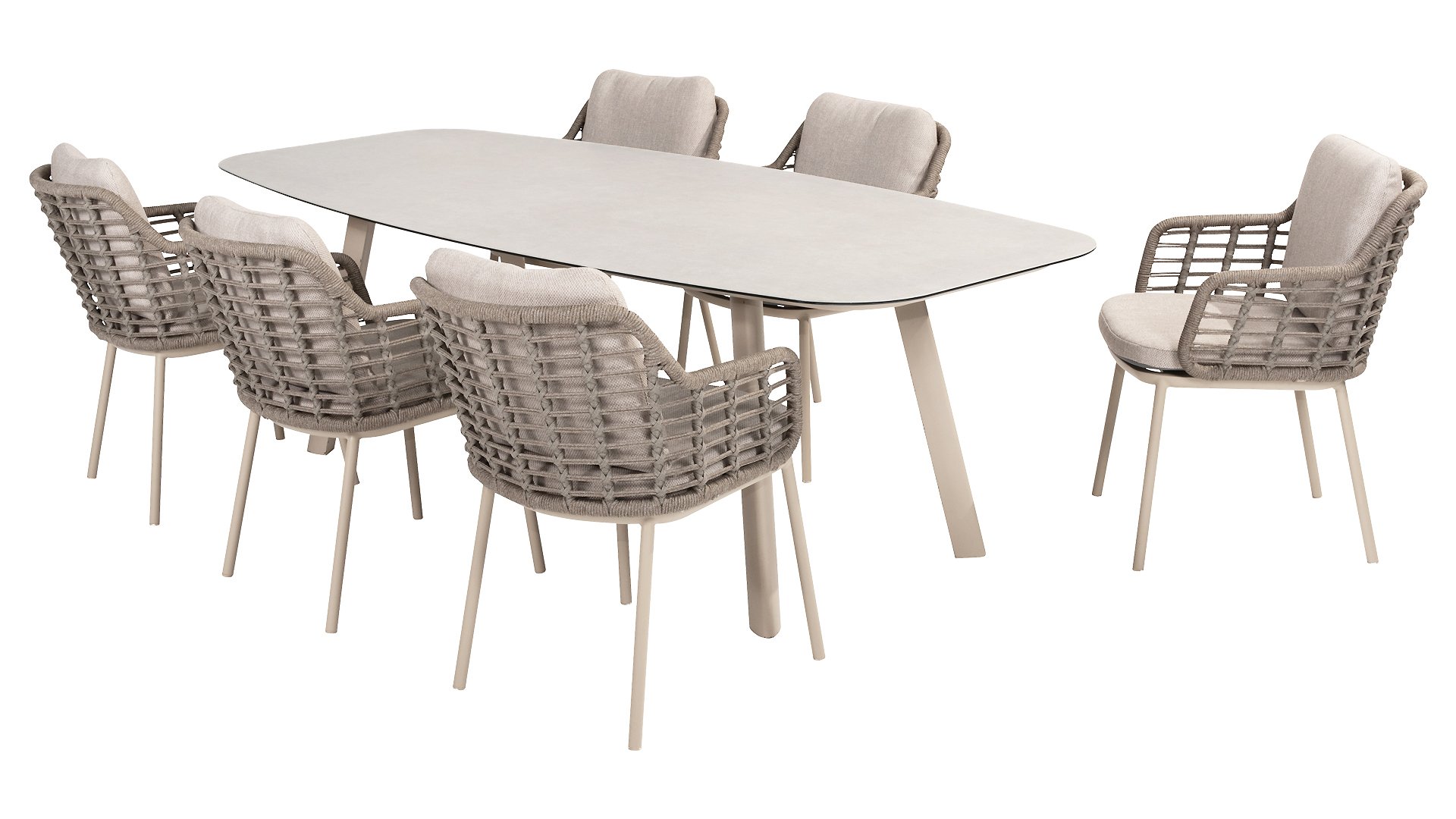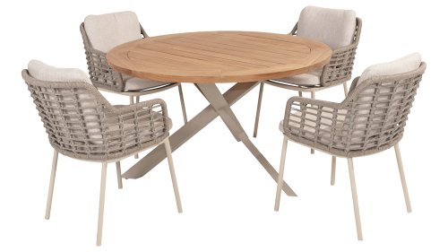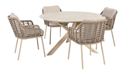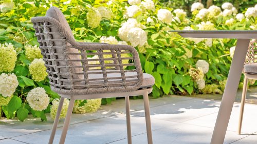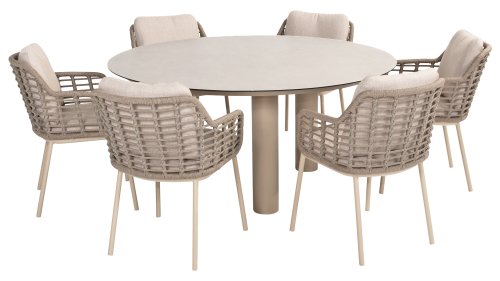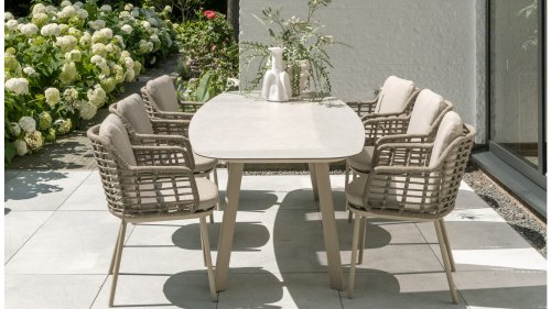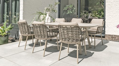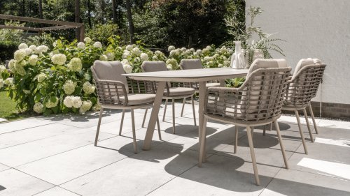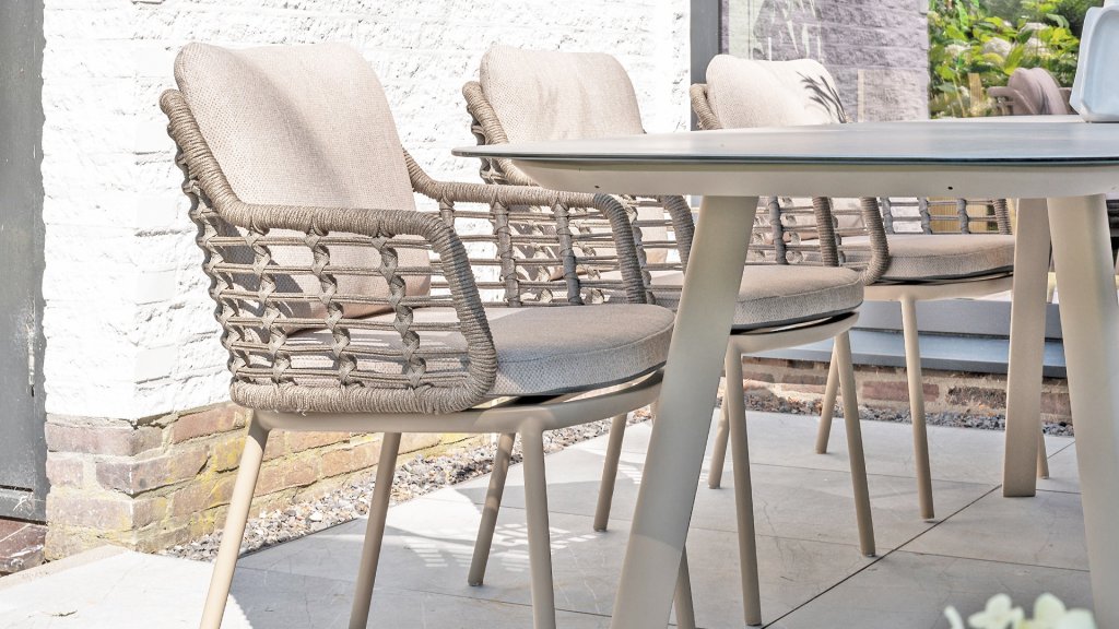 Taste by 4 Seasons Outdoor Puglia Dining – Holen Sie sich das warme, authentische Flair Süditaliens auf Ihre eigene Terrasse. Diese Kollektion ist die ideale Wahl für alle, die eine Kombination aus hochwertigem Design, organischen Formen und maximalem Sitzkomfort suchen. Der Name dieser Serie kommt nicht von ungefähr: Das Design der Möbel spiegelt den südeuropäischen Charme perfekt wider. Die organischen Linien sowie die erdigen und hellen Farbtöne bringen sofort ein entspanntes, sommerliches Ambiente in Ihren Garten. Die Stärke der Puglia-Serie liegt in der cleveren Materialkombination. Der Rahmen besteht aus pulverbeschichtetem Aluminium – leicht und rostfrei. Rücken- und Armlehnen sind kunstvoll aus hochwertigem Rope-Geflecht gefertigt. Dies verleiht den Stühlen und Sofas eine offene, luftige Optik, die perfekt in moderne Gärten passt. Für zusätzlichen Komfort sind die Möbel mit Kissen aus Olefin-Stoff ausgestattet. Dieses Material ist nicht nur angenehm weich, sondern auch schmutzabweisend und wetterbeständig. Ein unerwarteter Sommerregen ist daher kein Problem.