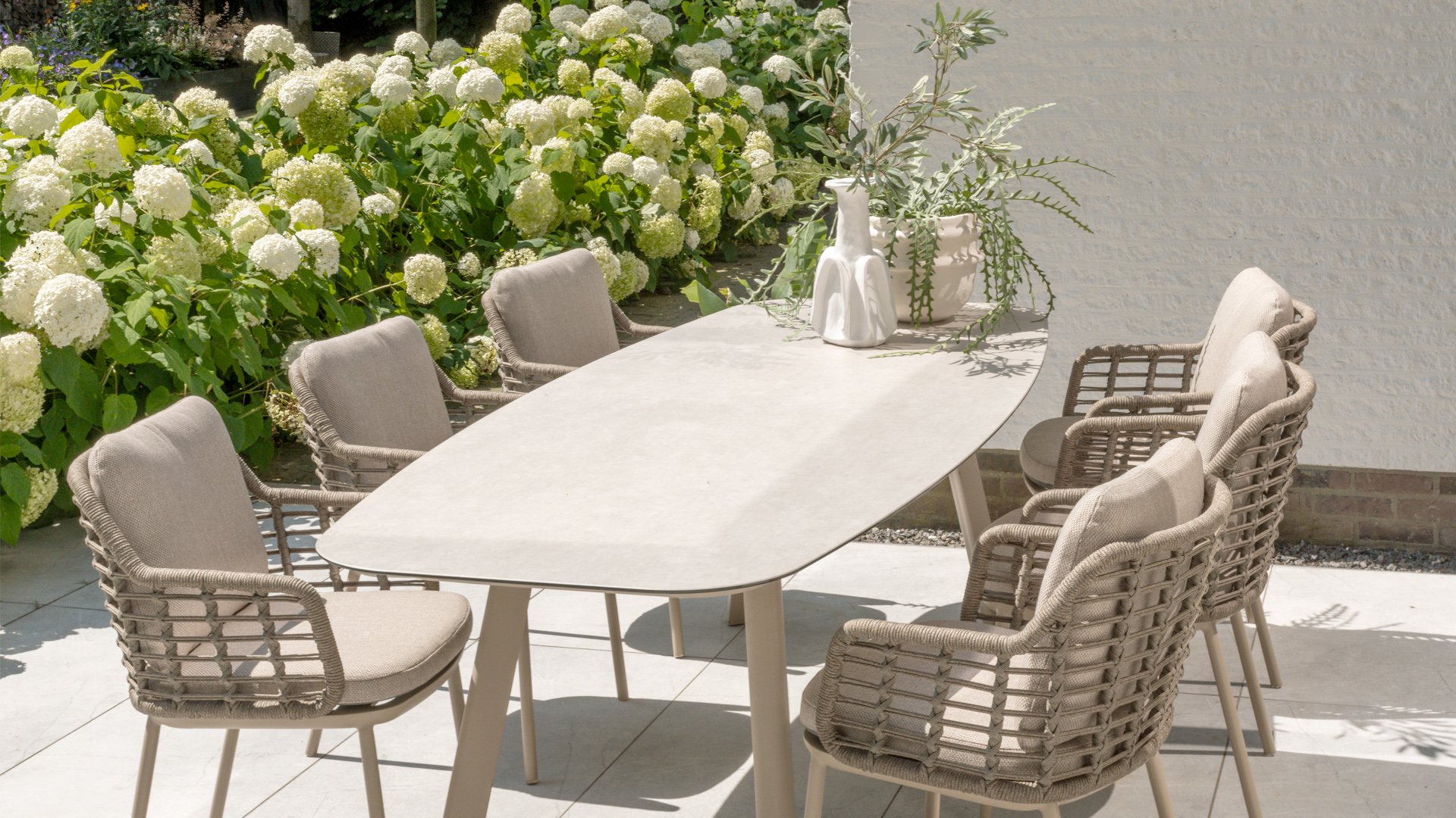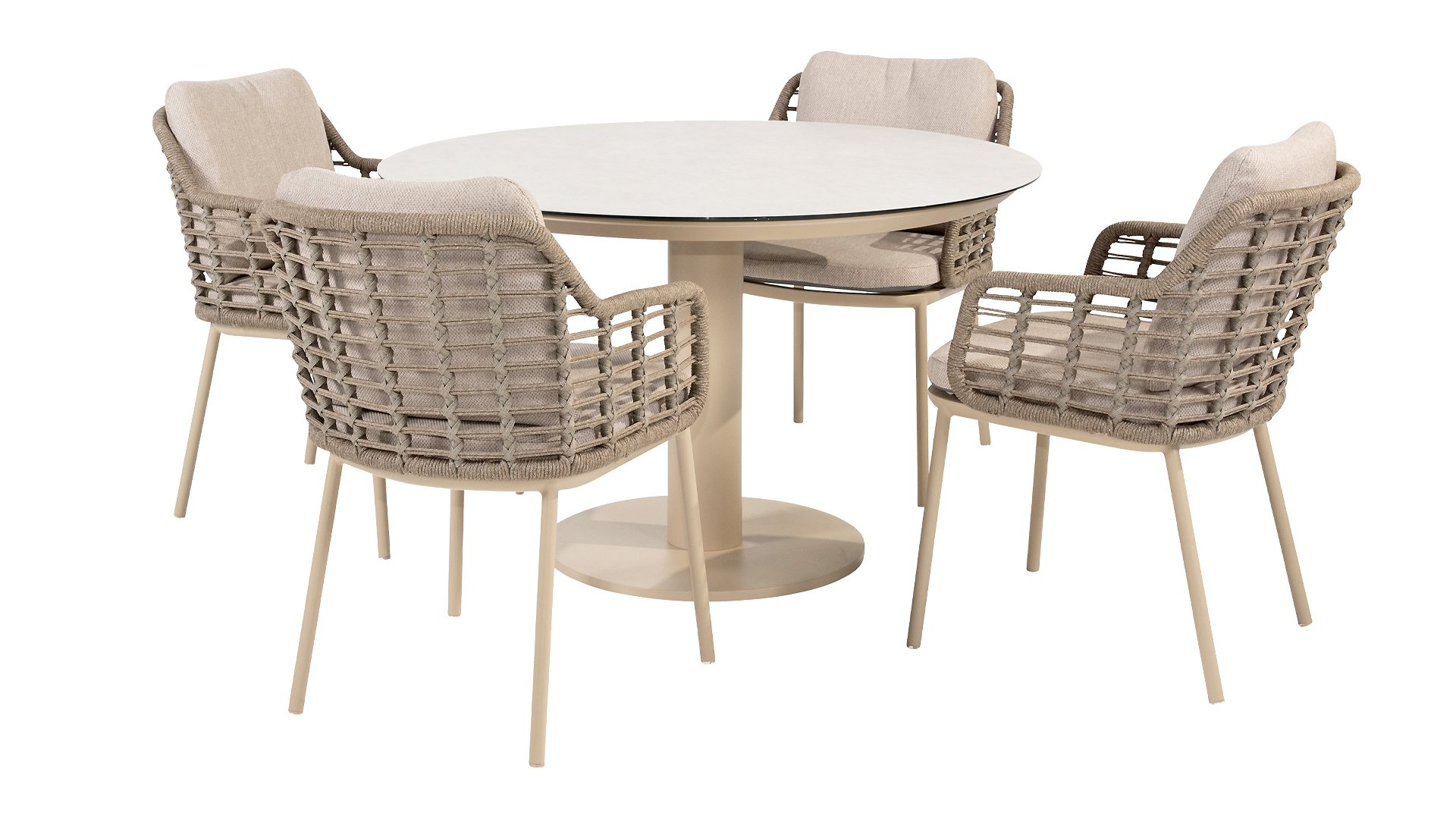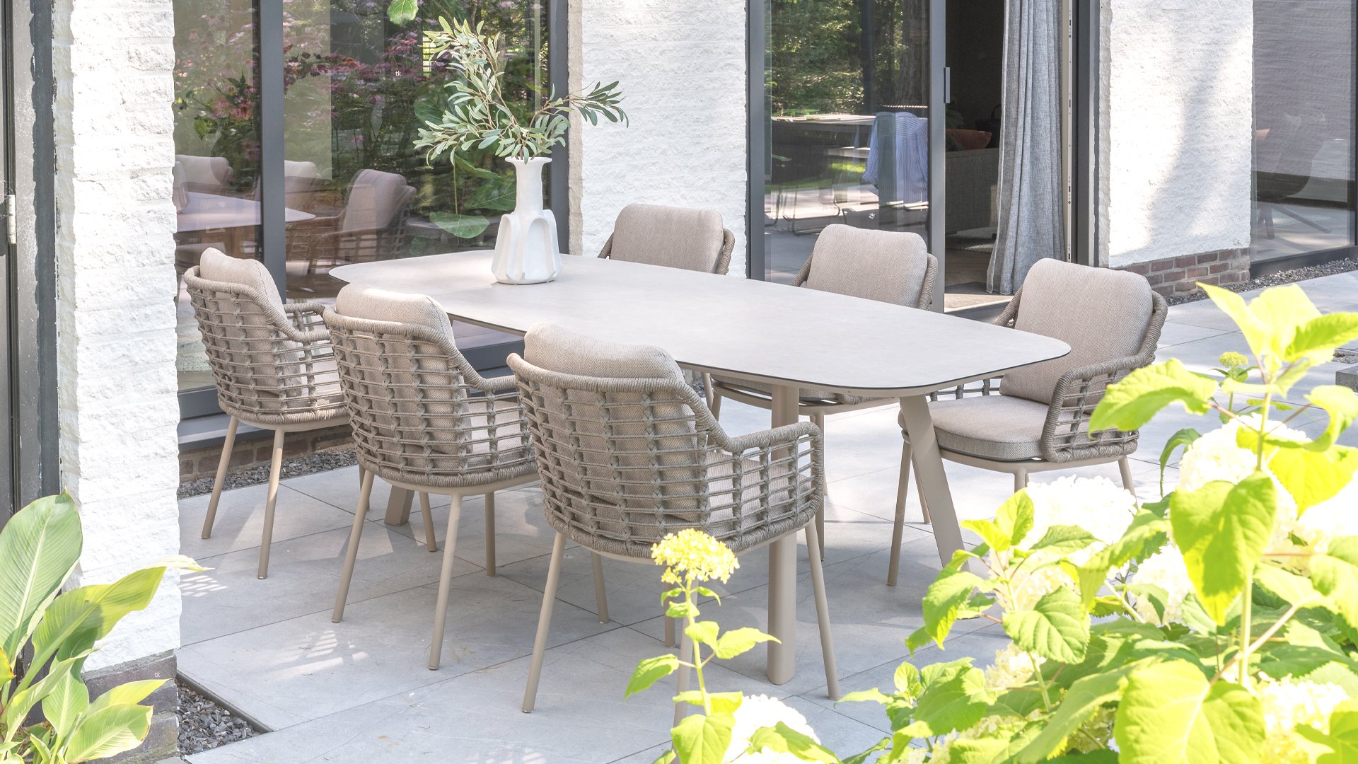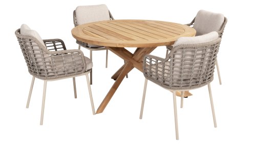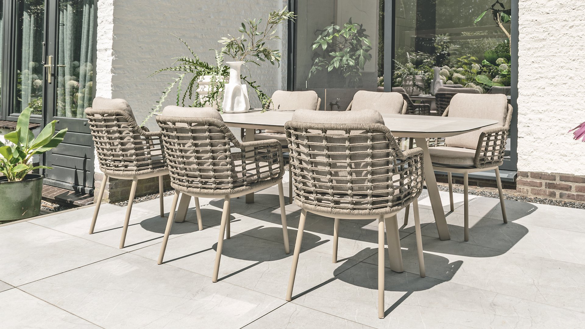 Taste by 4 Seasons Outdoor Puglia Dining – Holen Sie sich das warme, authentische Flair Süditaliens auf Ihre eigene Terrasse. Diese Kollektion ist die ideale Wahl für alle, die eine Kombination aus hochwertigem Design, organischen Formen und maximalem Sitzkomfort suchen. Der Name dieser Serie kommt nicht von ungefähr: Das Design der Möbel spiegelt den südeuropäischen Charme perfekt wider. Die organischen Linien sowie die erdigen und hellen Farbtöne bringen sofort ein entspanntes, sommerliches Ambiente in Ihren Garten. Die Stärke der Puglia-Serie liegt in der cleveren Materialkombination. Der Rahmen besteht aus pulverbeschichtetem Aluminium – leicht und rostfrei. Rücken- und Armlehnen sind kunstvoll aus hochwertigem Rope-Geflecht gefertigt. Dies verleiht den Stühlen und Sofas eine offene, luftige Optik, die perfekt in moderne Gärten passt. Für zusätzlichen Komfort sind die Möbel mit Kissen aus Olefin-Stoff ausgestattet. Dieses Material ist nicht nur angenehm weich, sondern auch schmutzabweisend und wetterbeständig. Ein unerwarteter Sommerregen ist daher kein Problem.