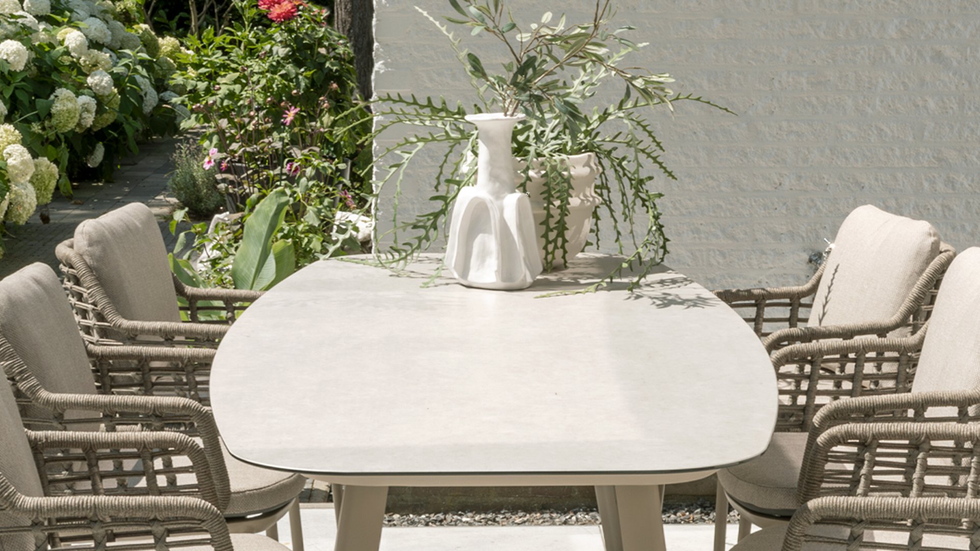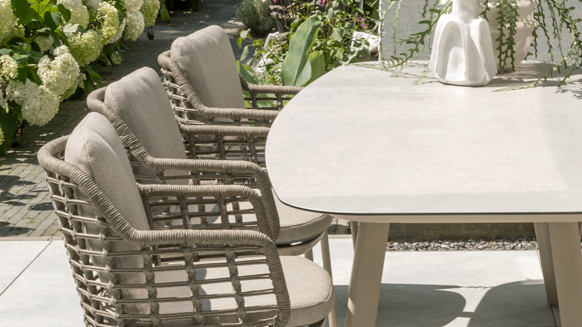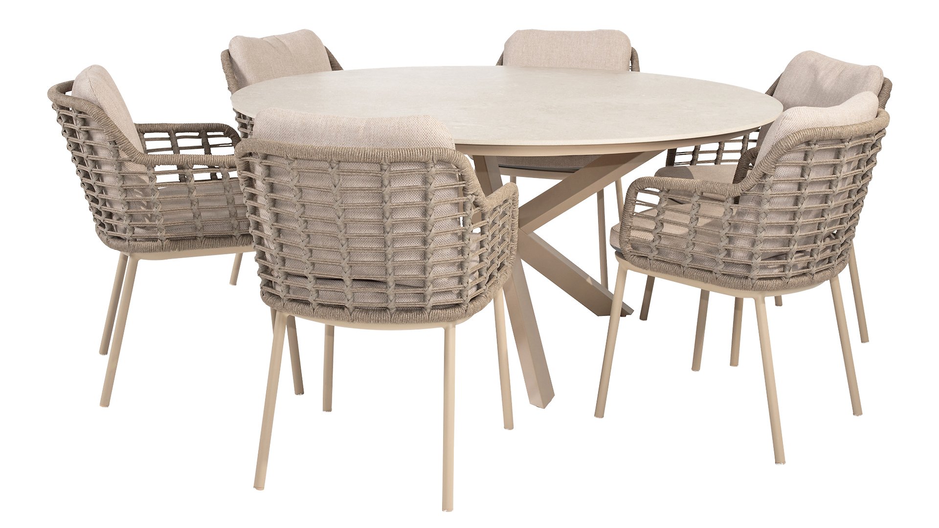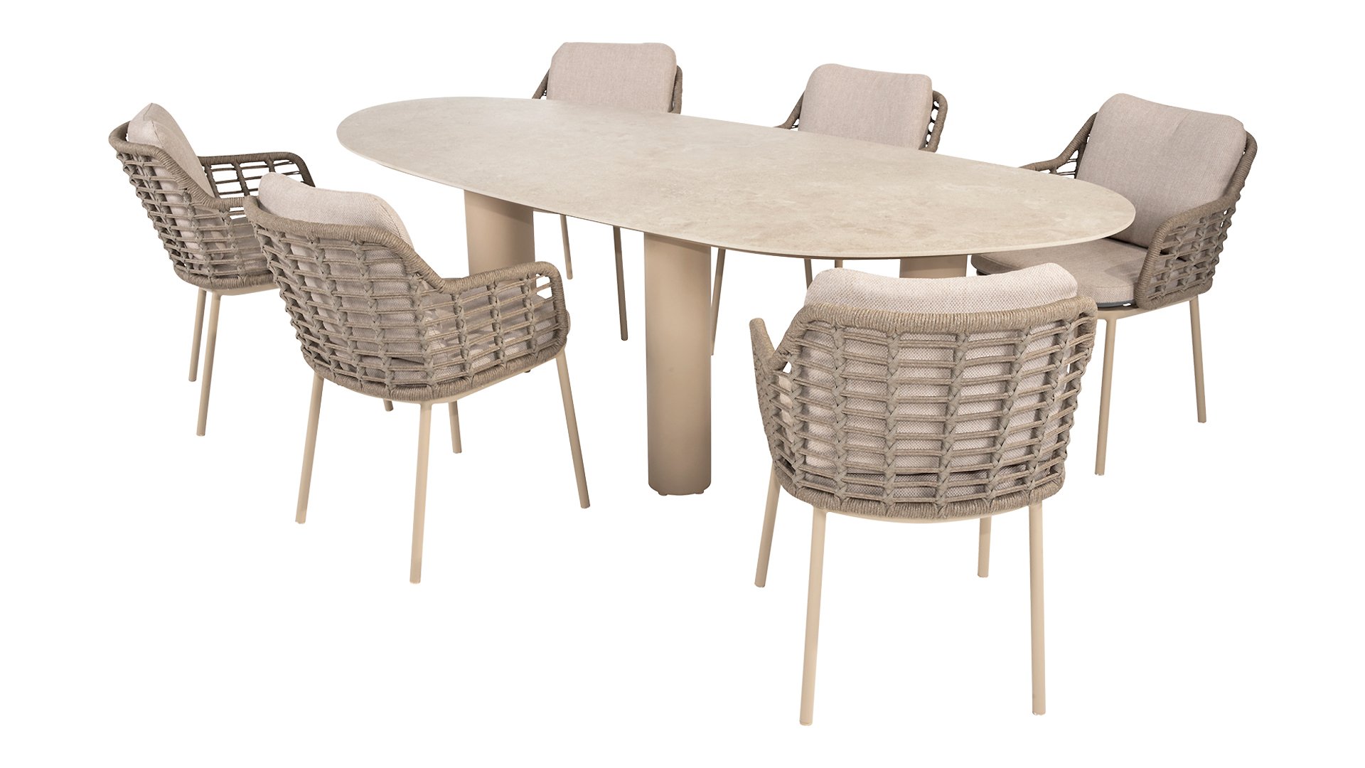 Taste by 4 Seasons Outdoor Puglia Dining – Holen Sie sich das warme, authentische Flair Süditaliens auf Ihre eigene Terrasse. Diese Kollektion ist die ideale Wahl für alle, die eine Kombination aus hochwertigem Design, organischen Formen und maximalem Sitzkomfort suchen. Der Name dieser Serie kommt nicht von ungefähr: Das Design der Möbel spiegelt den südeuropäischen Charme perfekt wider. Die organischen Linien sowie die erdigen und hellen Farbtöne bringen sofort ein entspanntes, sommerliches Ambiente in Ihren Garten. Die Stärke der Puglia-Serie liegt in der cleveren Materialkombination. Der Rahmen besteht aus pulverbeschichtetem Aluminium – leicht und rostfrei. Rücken- und Armlehnen sind kunstvoll aus hochwertigem Rope-Geflecht gefertigt. Dies verleiht den Stühlen und Sofas eine offene, luftige Optik, die perfekt in moderne Gärten passt. Für zusätzlichen Komfort sind die Möbel mit Kissen aus Olefin-Stoff ausgestattet. Dieses Material ist nicht nur angenehm weich, sondern auch schmutzabweisend und wetterbeständig. Ein unerwarteter Sommerregen ist daher kein Problem.