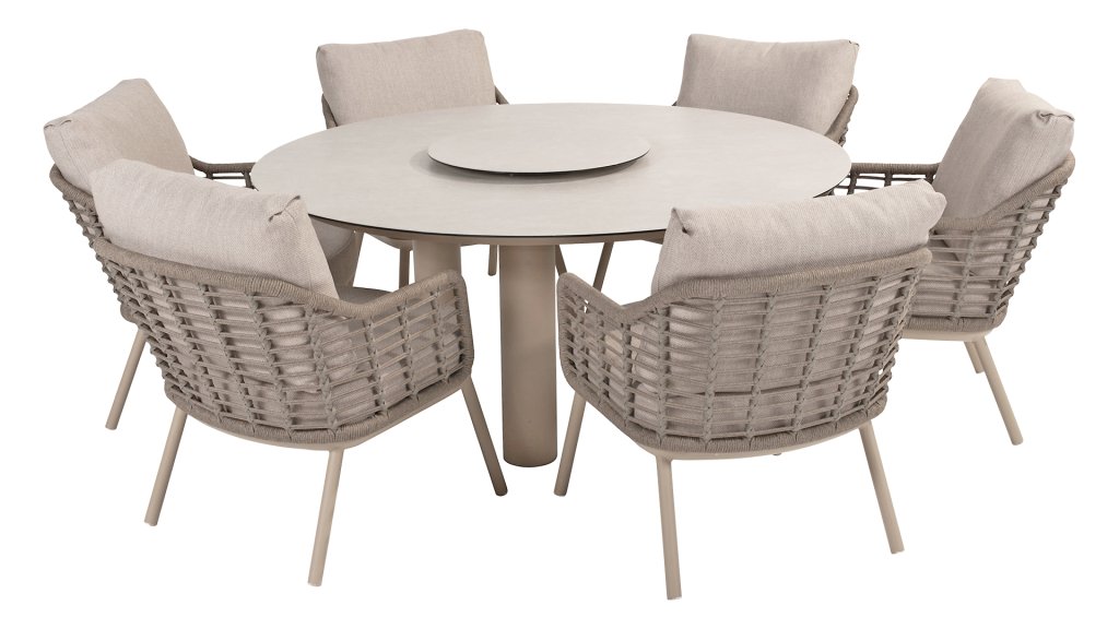 Der Donato Tisch ist mit einem Durchmesser von 160 cm eine tolle Ergänzung für jeden Essbereich und eignet sich ideal für gesellige Runden. Das Besondere an diesem Tisch ist die Gestaltung seiner Beine: Mit insgesamt drei dreieckig angeordneten Beinen bietet er nicht nur Stabilität, sondern auch eine markante, verspielte Optik. Die Keramik-Glas-Tischplatte verleiht ihm eine luxuriöse Ausstrahlung und ist gleichzeitig pflegeleicht. In der Taste by 4 Seasons Outdoor Donato-Serie gibt es einige Möglichkeiten, so ist er als Esstisch in den Farben erhältlich: Taste 4Seasons Donato Tisch Ø160cm Latte & Taste 4Seasons Donato Tisch Ø160 cm Terre, was es Ihnen ermöglicht, das perfekte Match für Ihr Interieur zu wählen. Um die Mayonnaise oder die Milch an die Person gegenüber zu reichen, fügen Sie einfach den: Taste 4Seasons Donato Lazy Susan dem Ganzen hinzu. Außerdem ist auch eine Low-Dining-Variante in der Farben Latte & Terre erhältlich, ideal für ein informelles und entspanntes Speiseerlebnis: Taste 4Seasons Donato Low Dining Tisch Ø160cm Latte, Taste 4Seasons Donato Low-Dining Tisch Ø160 cm Terre. Was gibt es noch?