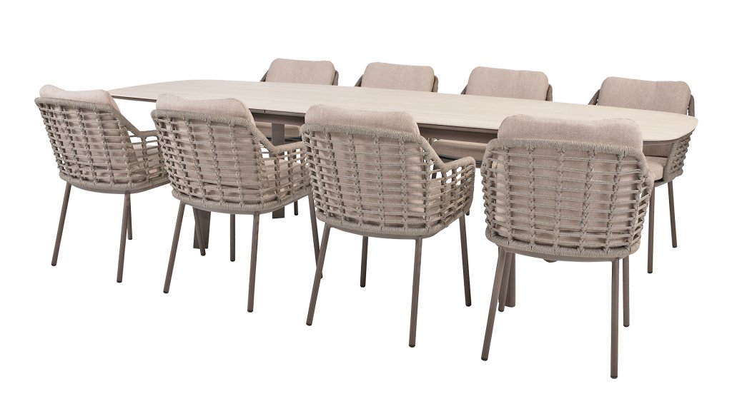 Der Taste Manolo Ausziehtisch ist ein multifunktionales Produkt. Sie erwarten mehr Gäste? Dann lässt sich dieser Tisch auf eine Länge von 290 cm ausziehen. Der Tisch besticht durch seine ovale Tischplatte im dänischen Stil aus glasbedruckter Keramik und kann das ganze Jahr über im Freien stehen. Erhältlich in zwei Farben: Latte und Terre.