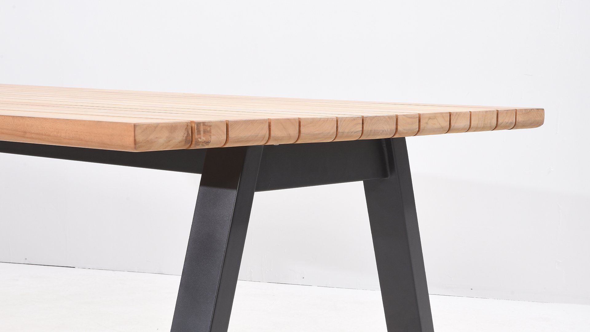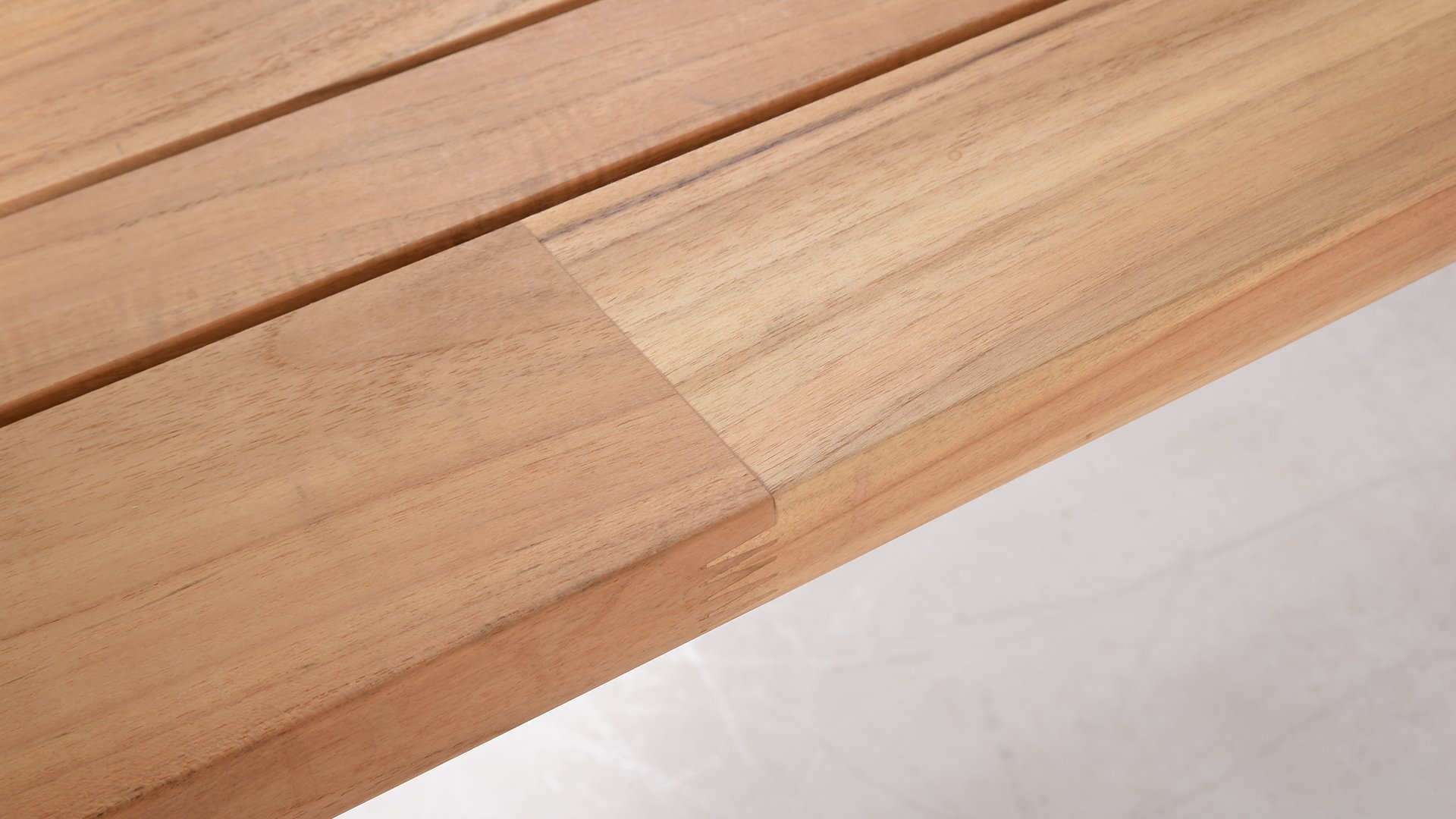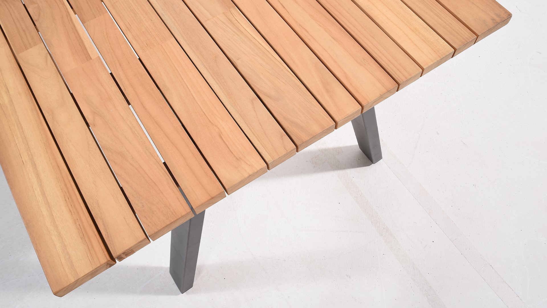 Der Teak-Gartentisch Ambassador ist ein beliebtes Modell innerhalb der schönen Reihe von Taste 4SO. Ambassador-Tische. Ein auffälliges Detail der Teakholzplatte des Ambassador Tisches sind die unterschiedlichen Breiten der Dielen. Dieser schöne Effekt ist auf den Detailfotos deutlich zu erkennen. Es sorgt für ein originelles und modernes Aussehen. Der Sockel besteht aus pulverbeschichtetem Edelstahl.