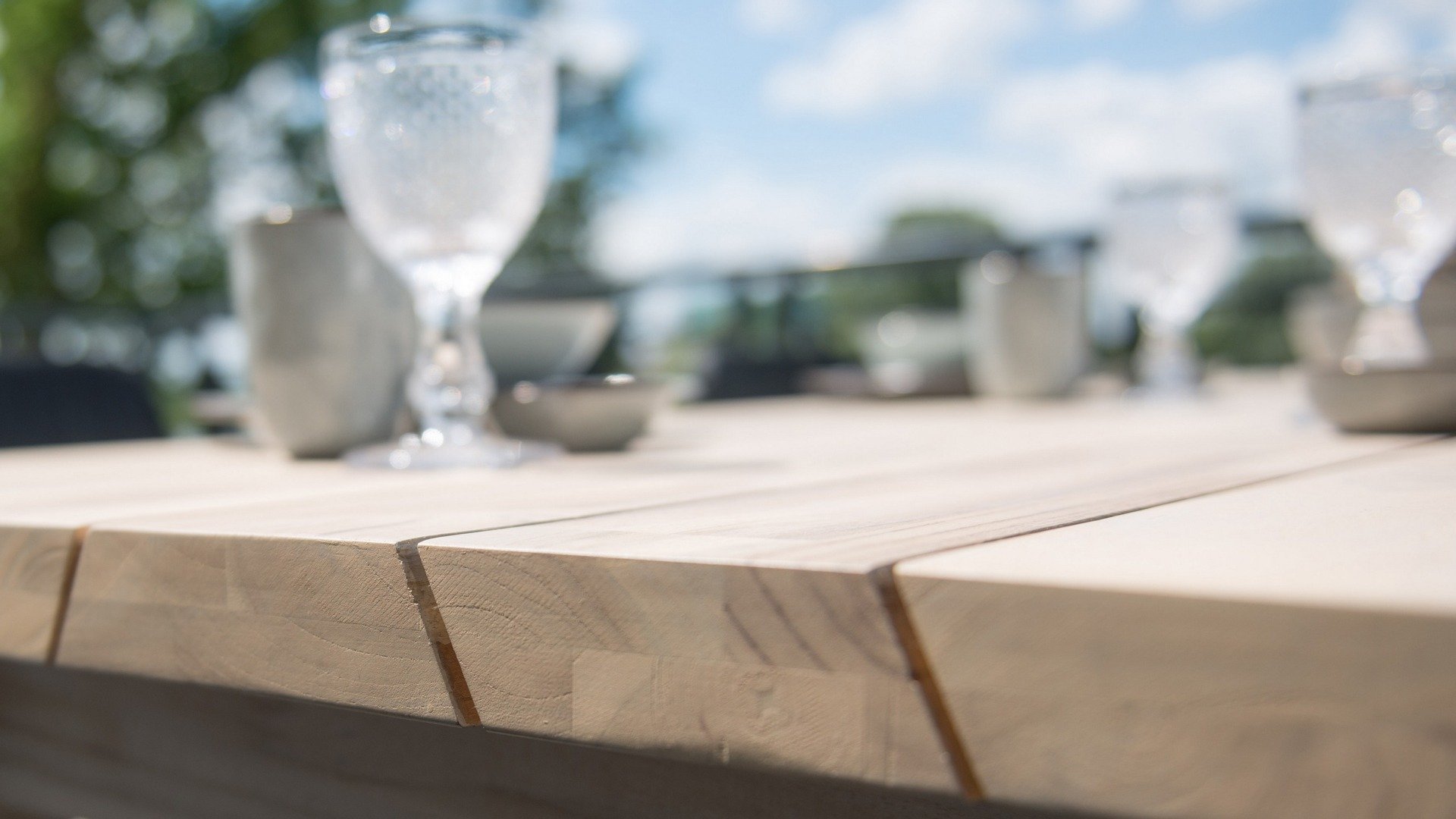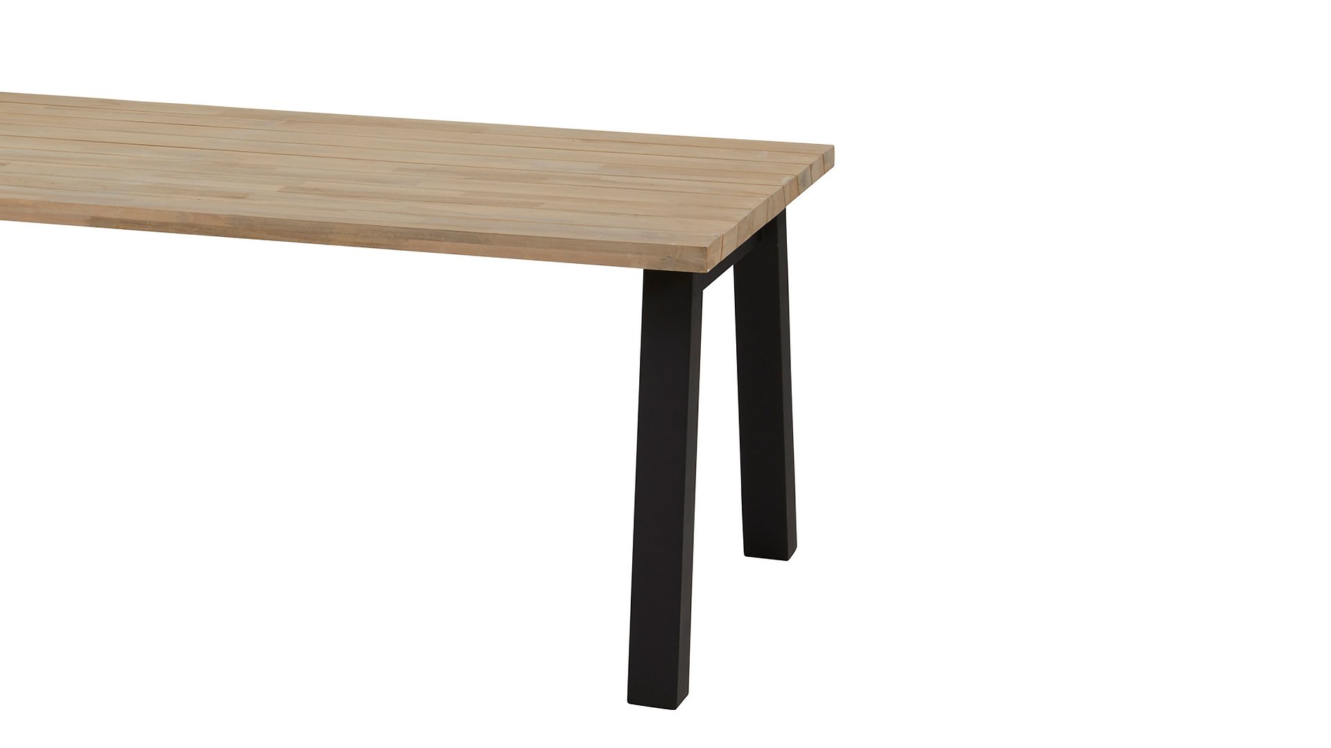 Der Derby 240 mit Aluminiumbein ist ein pragmatischer Esstisch. Die Teakholzplanken sind schräg gesägt und verleihen dem Tisch eine verspielte Optik. Auch mit Teakbeinen erhältlich.