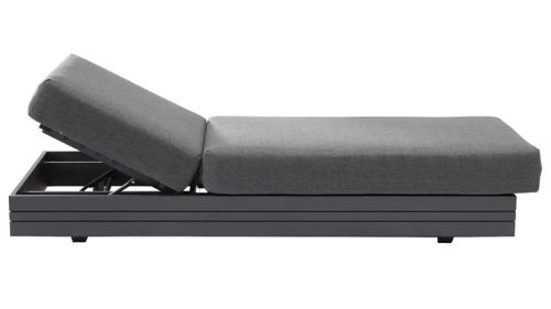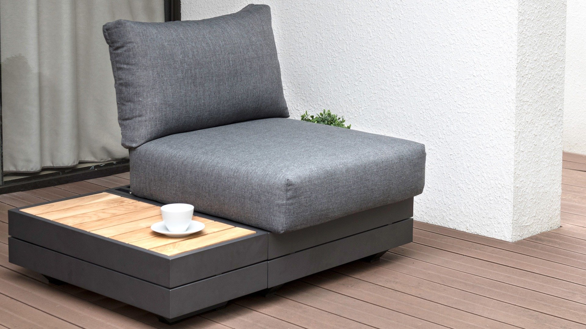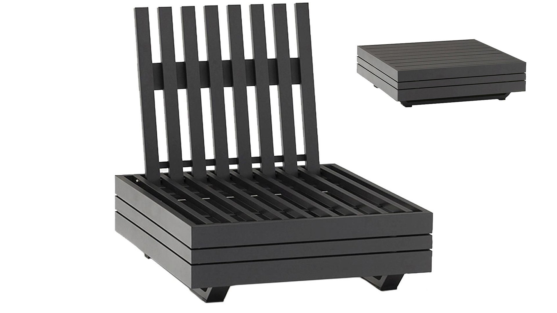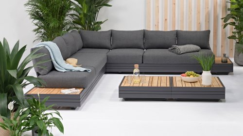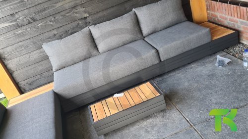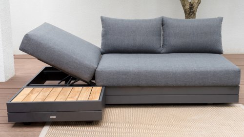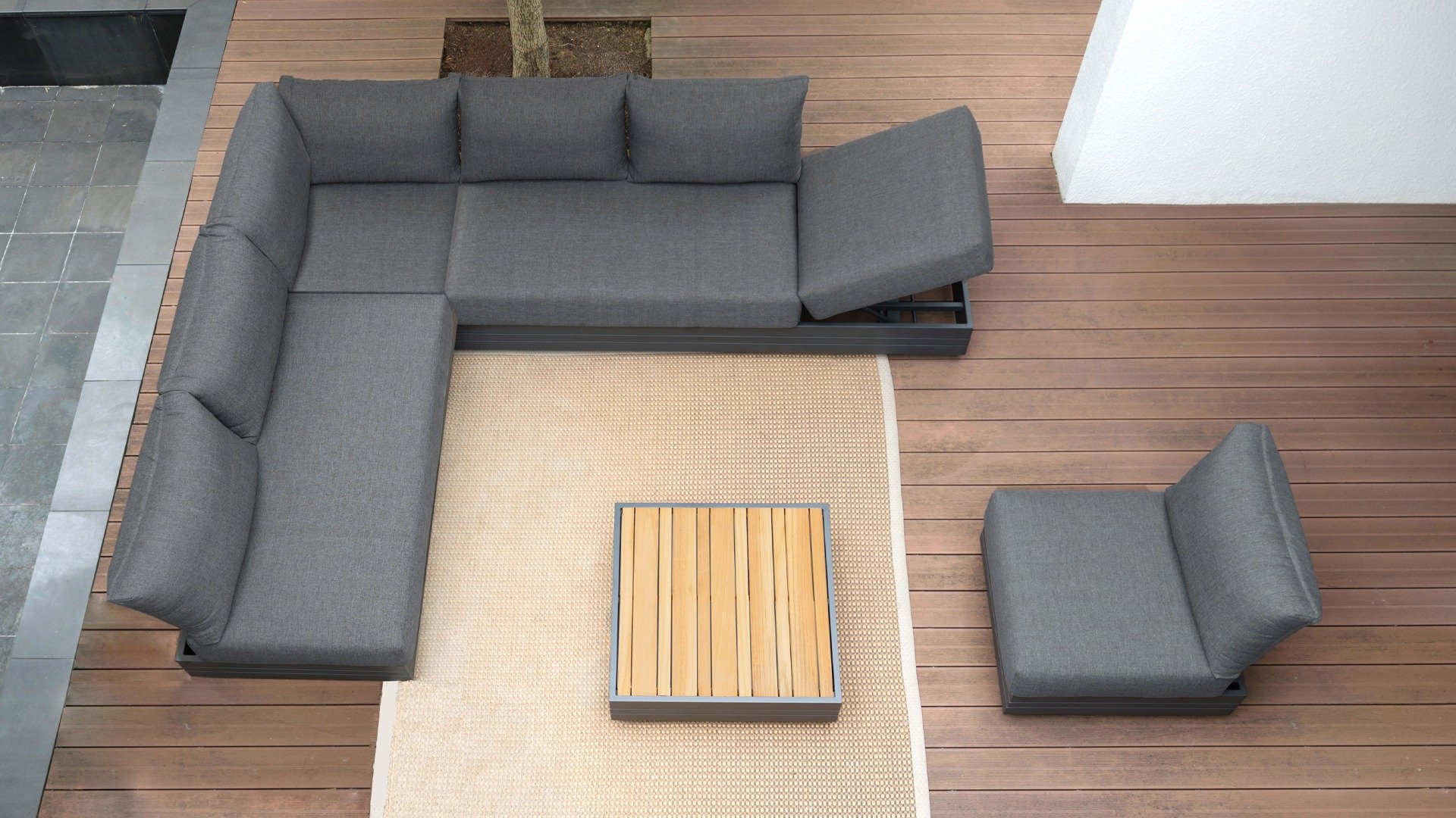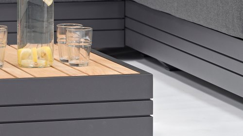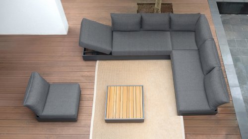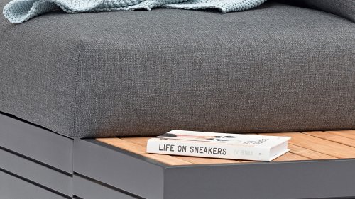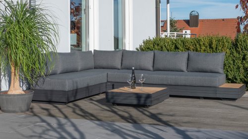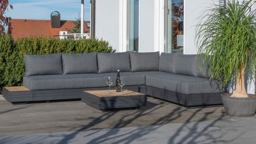 Ihr Set Cubo Lounge verfügt über einen verstellbaren 3-Sitzer und einen 1-Sitzer. Das Gestell besteht aus pulverbeschichteten Aluminium in der Farbe graphite und die Ablage-Elemente aus zertifiziertem Teakholz. Aluminium vereint ein geringes Gewicht mit einer hohen Robustheit. Teakholz gilt als das beste Holz für Möbel im Außenbereich. Es muss nicht imprägniert oder besonders schutzbehandelt werden. Der hohe Gehalt an natürlichen Ölen macht das Holz besonders witterungsbeständig. Im Laufe der Zeit bekommt Teak eine unverwechselbare, silbergraue Patina. Das ist normal und beeinträchtigt die Qualität und Lebensdauer des Moduls in keiner Weise. Teak lässt sich einfach und schnell reinigen und pflegen.