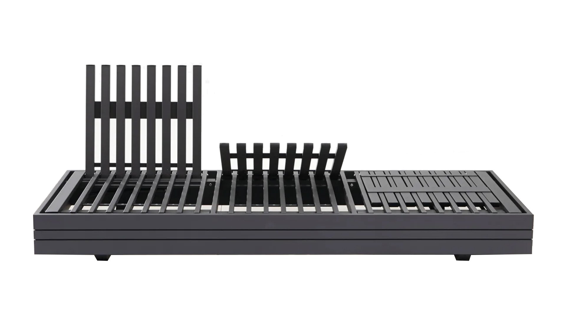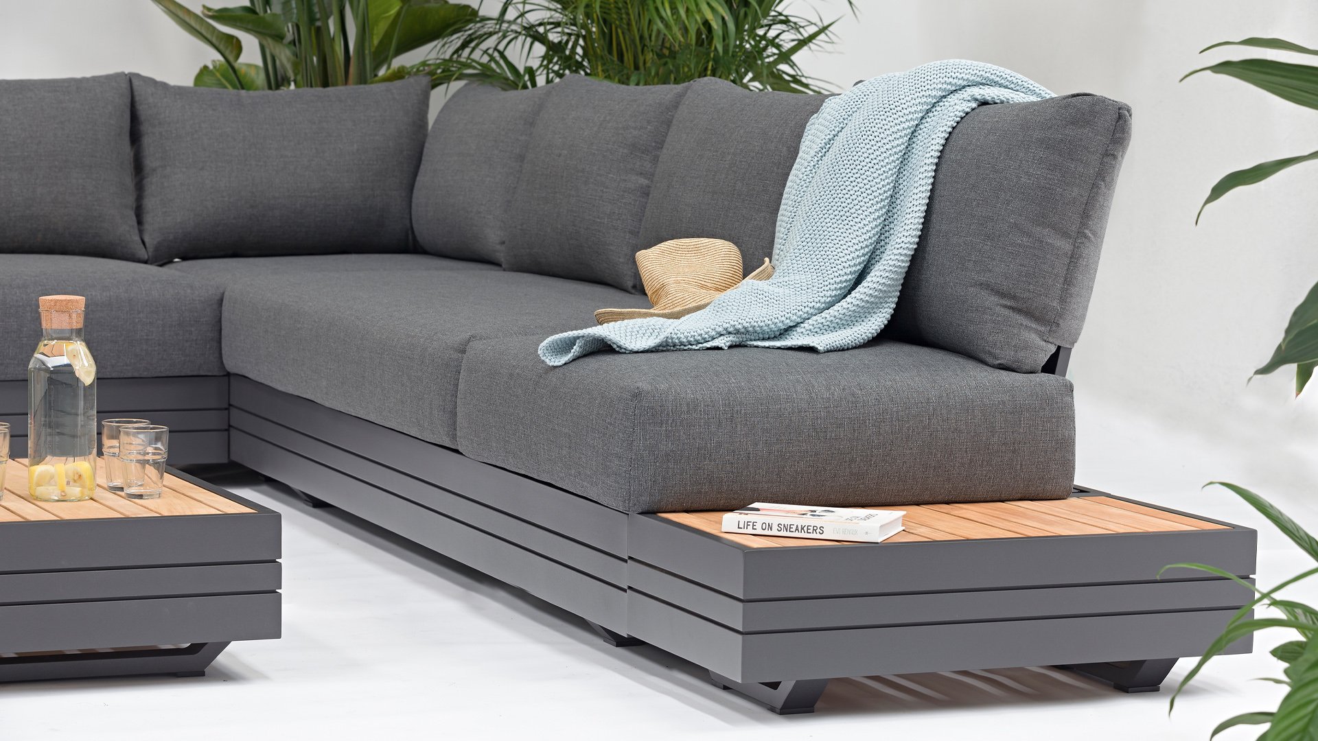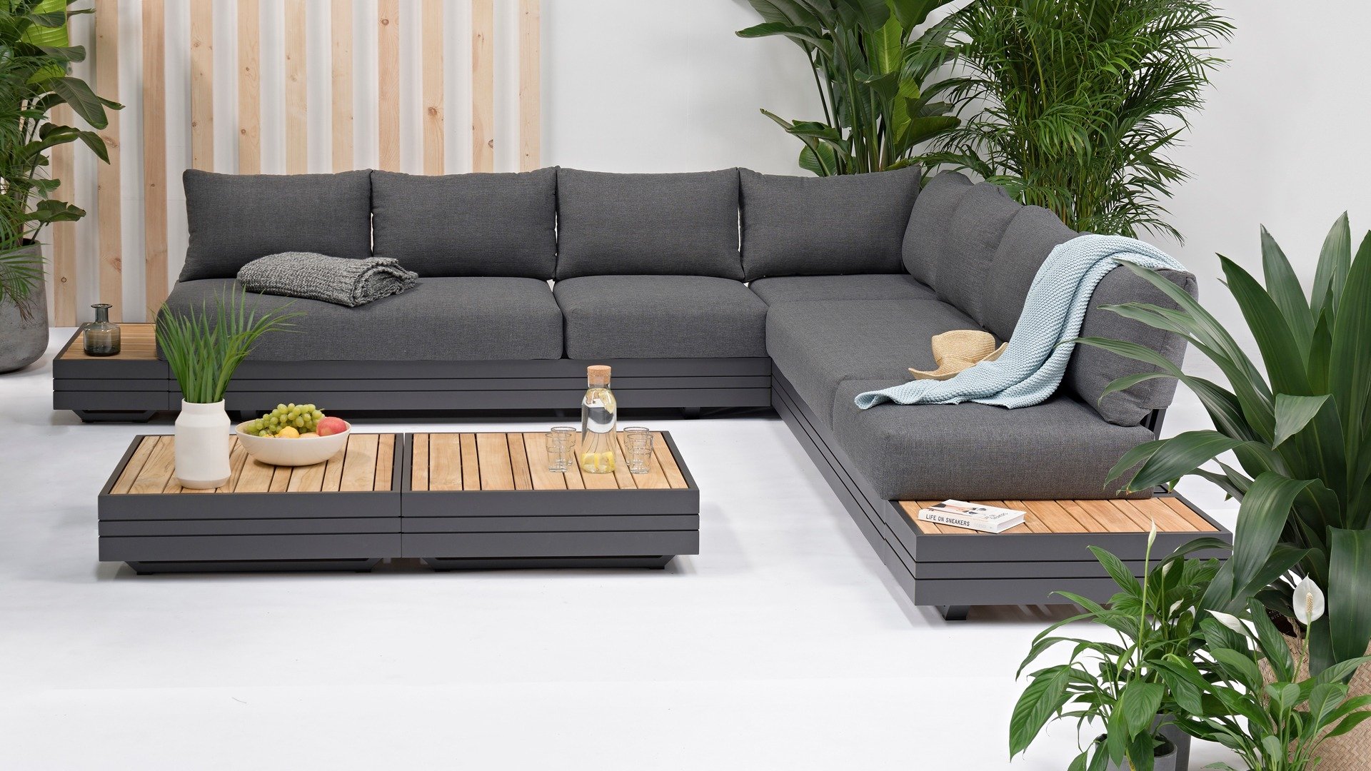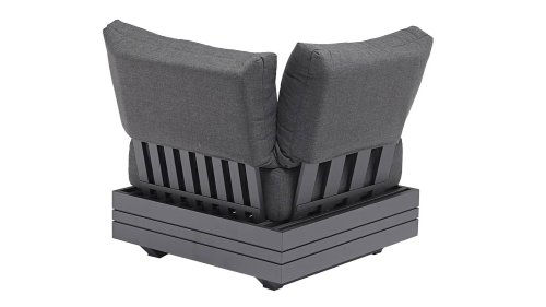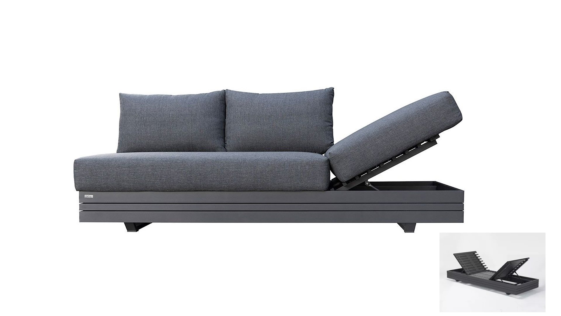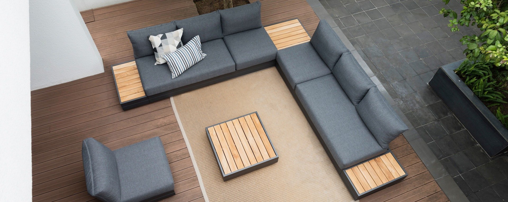 Ihr Set Cubo Lounge verfügt über einen verstellbaren 3-Sitzer und einen 1-Sitzer. Das Gestell besteht aus pulverbeschichteten Aluminium in der Farbe graphite und die Ablage-Elemente aus zertifiziertem Teakholz. Aluminium vereint ein geringes Gewicht mit einer hohen Robustheit. Teakholz gilt als das beste Holz für Möbel im Außenbereich. Es muss nicht imprägniert oder besonders schutzbehandelt werden. Der hohe Gehalt an natürlichen Ölen macht das Holz besonders witterungsbeständig. Im Laufe der Zeit bekommt Teak eine unverwechselbare, silbergraue Patina. Das ist normal und beeinträchtigt die Qualität und Lebensdauer des Moduls in keiner Weise. Teak lässt sich einfach und schnell reinigen und pflegen.