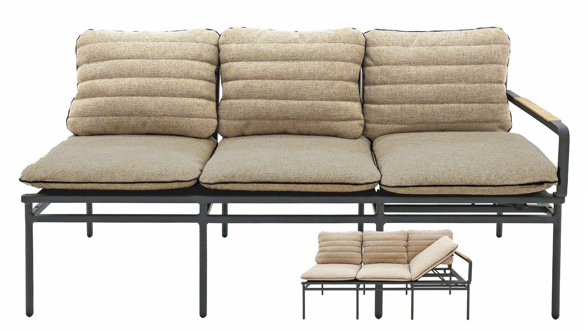 Sie können dieses 3-Sitzer-Sofa auch als separate Liege oder als wunderbaren Liegeplatz in Ihrem Lounge-Set verwenden, da Sie den linken oSitz als verstellbare Rückenlehne verwenden können.