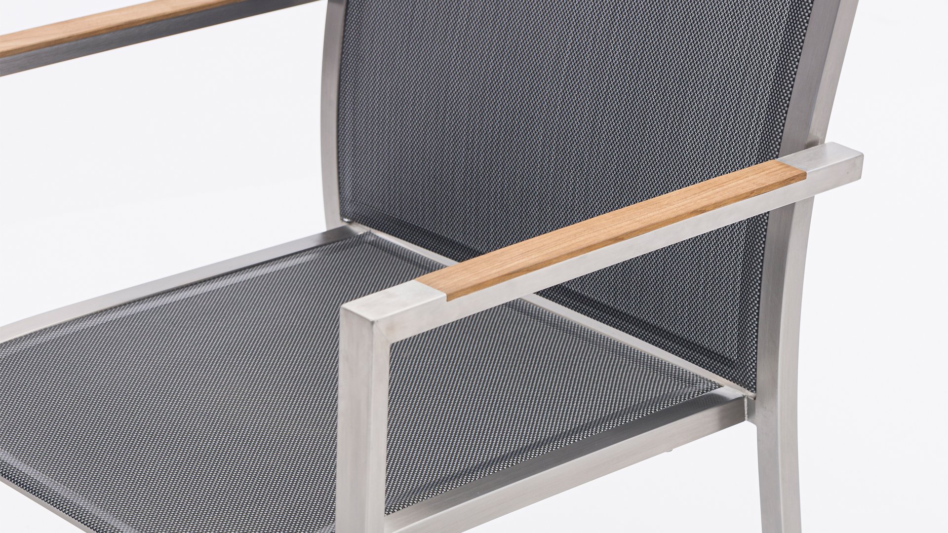Das Zebra One Dining: Das Gestell aus gebürstetem Edelstahl ist mit Dark grey oder Dark platinum Textilene-Stoff bezogen. Dieser Edelstahl-Stapelstuhl 'One' von Zebra ist nicht nur ein ergonomisch perfektionierter Stuhl, sondern überzeugt auch durch sein minimalistisches Design und die fein abgesetzte Armlehne aus Teakholz in Edelstahl. Der Zebra One Gartenstuhl zeichnet sich, wie bei Stapelstühlen üblich, durch eine höhere Rückenlehne aus und schafft so einen wunderbaren Sitzkomfort. Auch stapelbare und verstellbare Stühle sind in dieser Serie erhältlich.